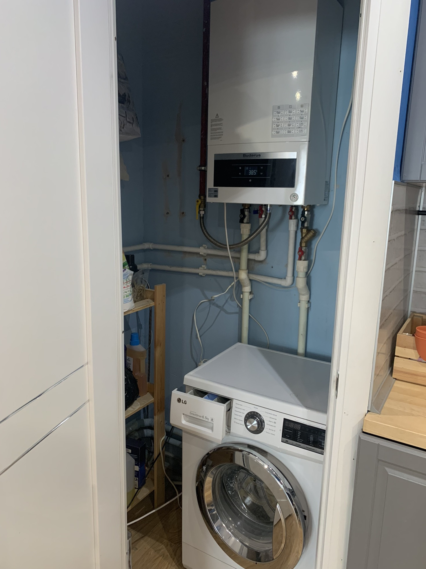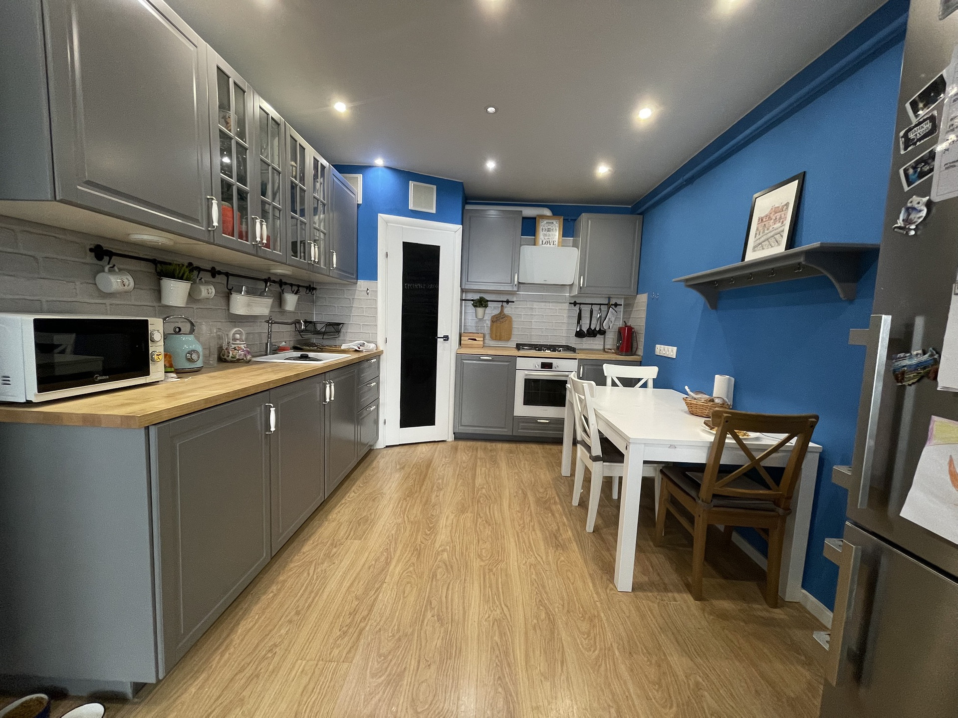 Просторная кухня 13.5 метров (кухонный гарнитур IKEA) со всей необходимой техникой - духовой шкаф и посудомоечная машина 60см - Bosh, газовая варочная панель - Siemens, вытяжка. Газовый котел Buderus и стиральная машинка LG - спрятаны в специальной зоне. Автоматический газовый счетчик - оплачивать можно через личный кабинет через интернет.