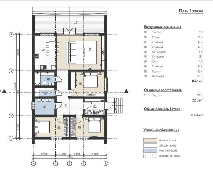 Планировалась постройка каркасного дома в стиле Барн Хаус  площадью 136 метров (планировка в фото).