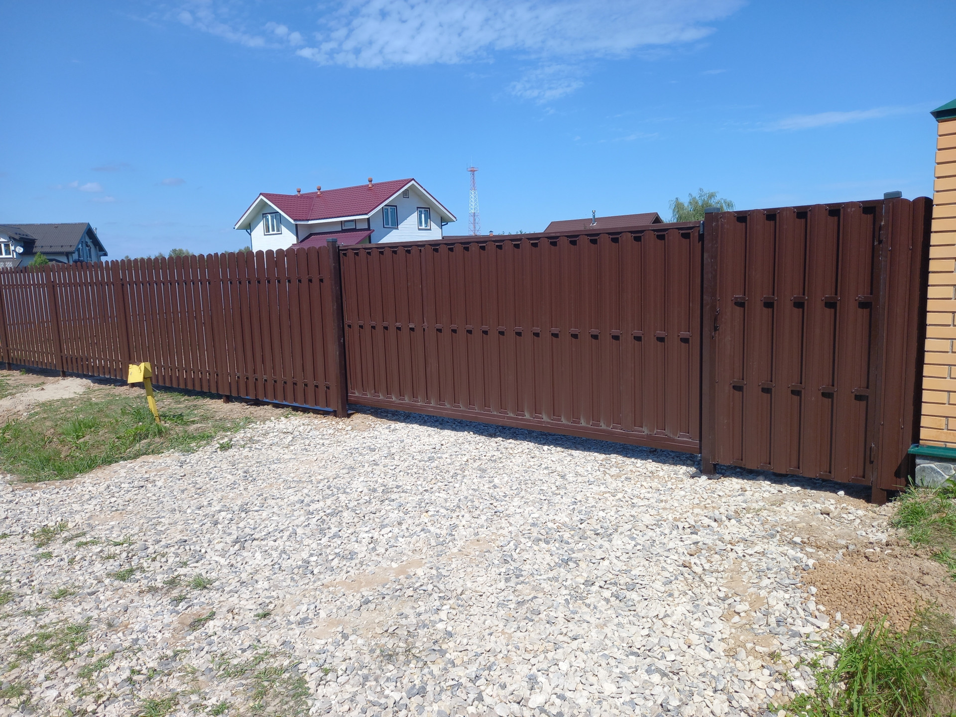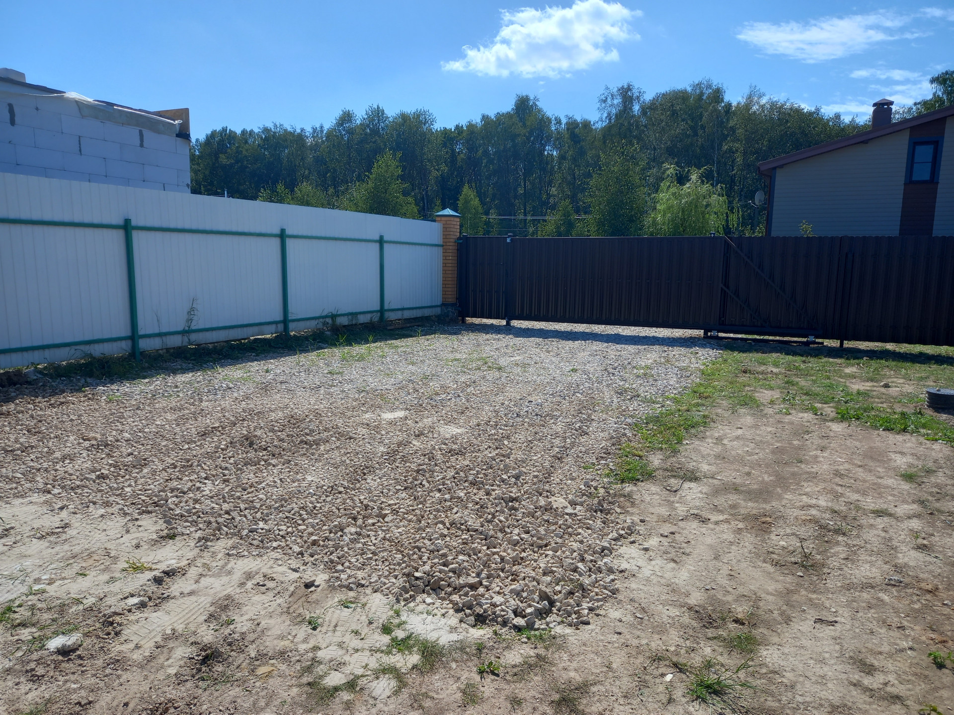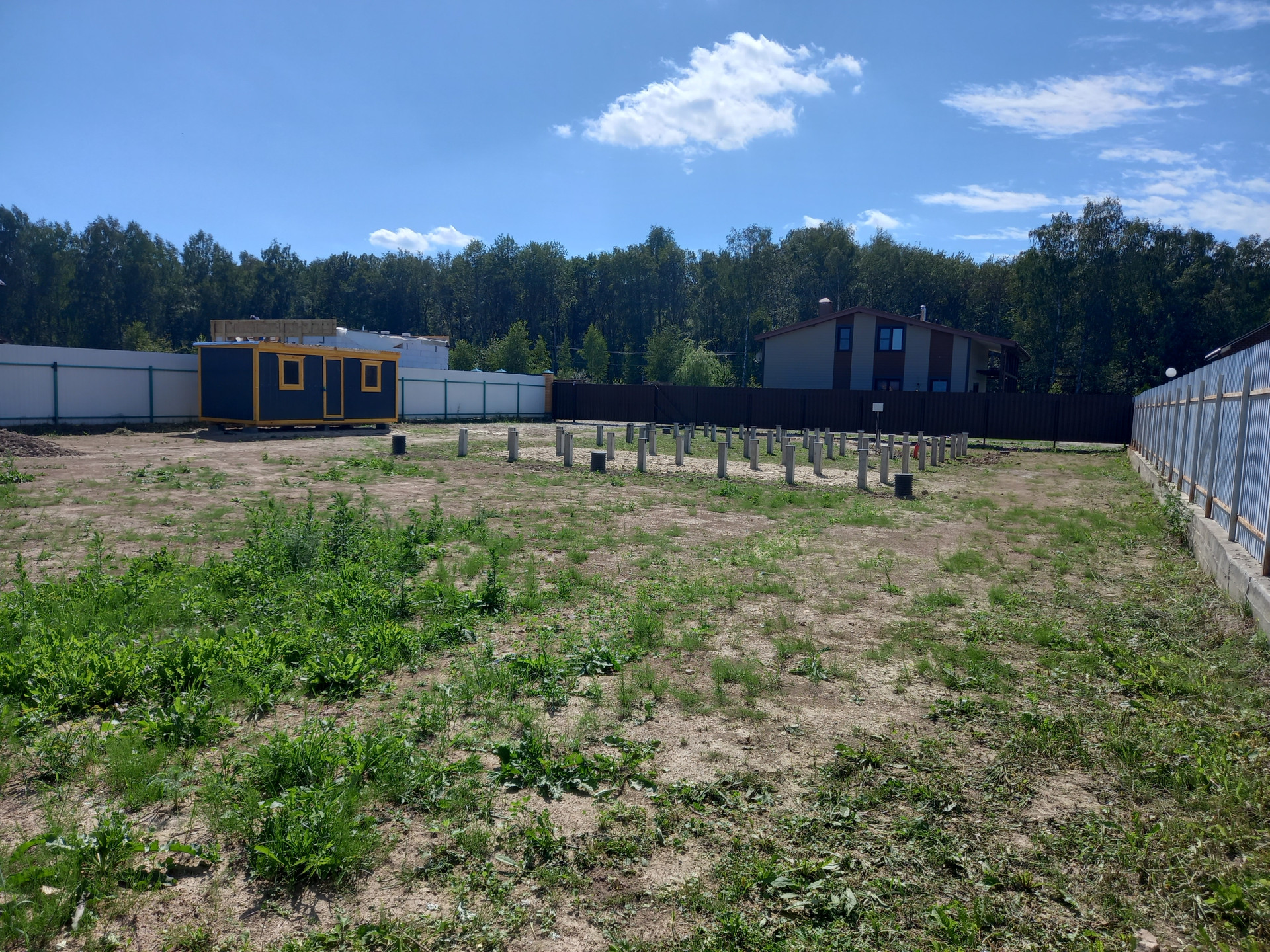 Выполнен заезд на 4 машины, смонтирована дренажная система, заведена вода и электричество (газ проложен по границе участка и заводиться в уже построенный дом), смонтирован забор (металлический штакетник) с откатными воротами (4 метра), установлен хоз блок (6 на 2,5 метра), забито свайное поле под будущий дом.