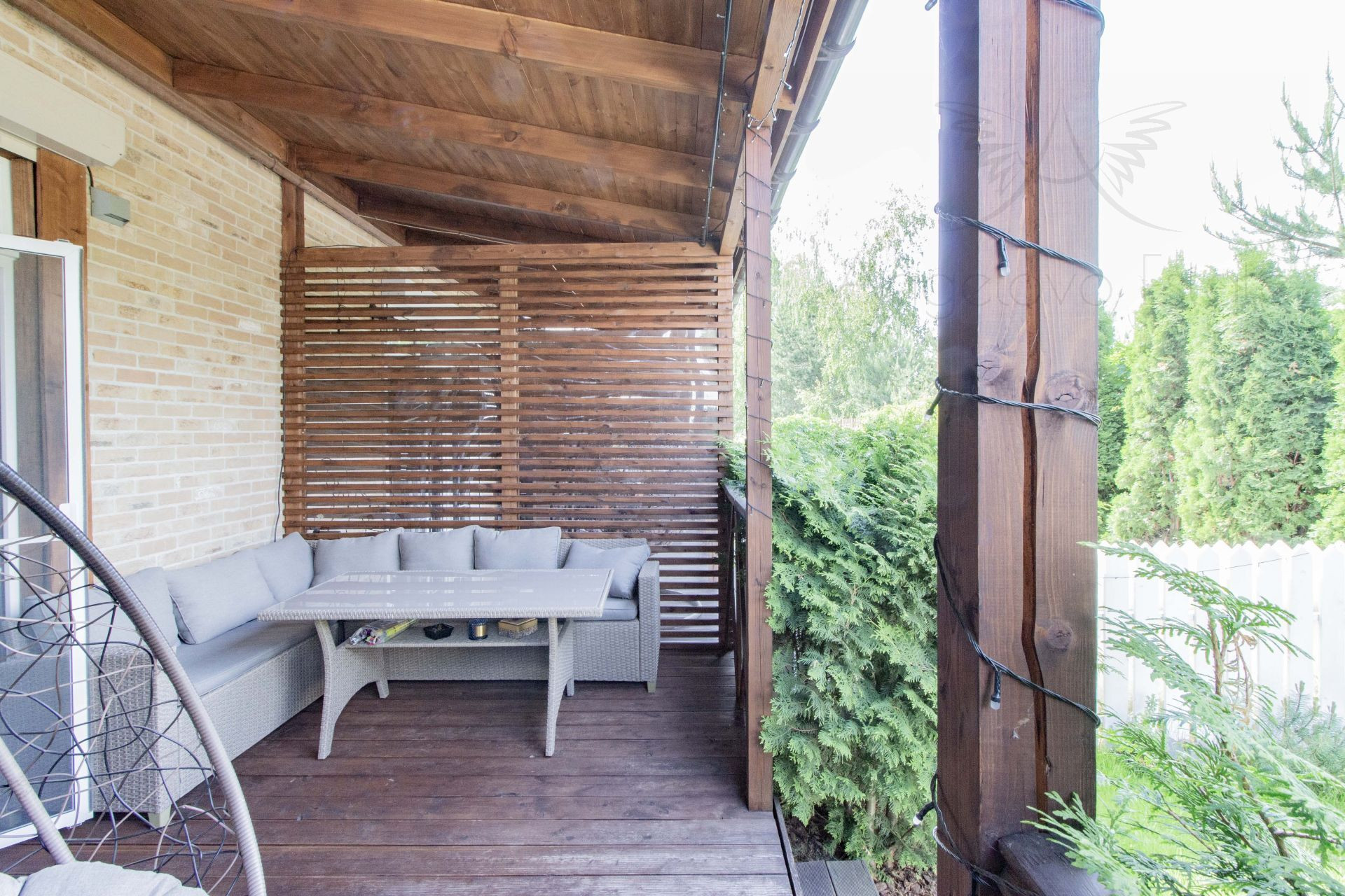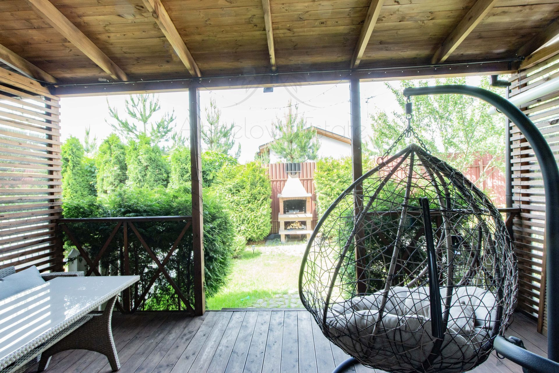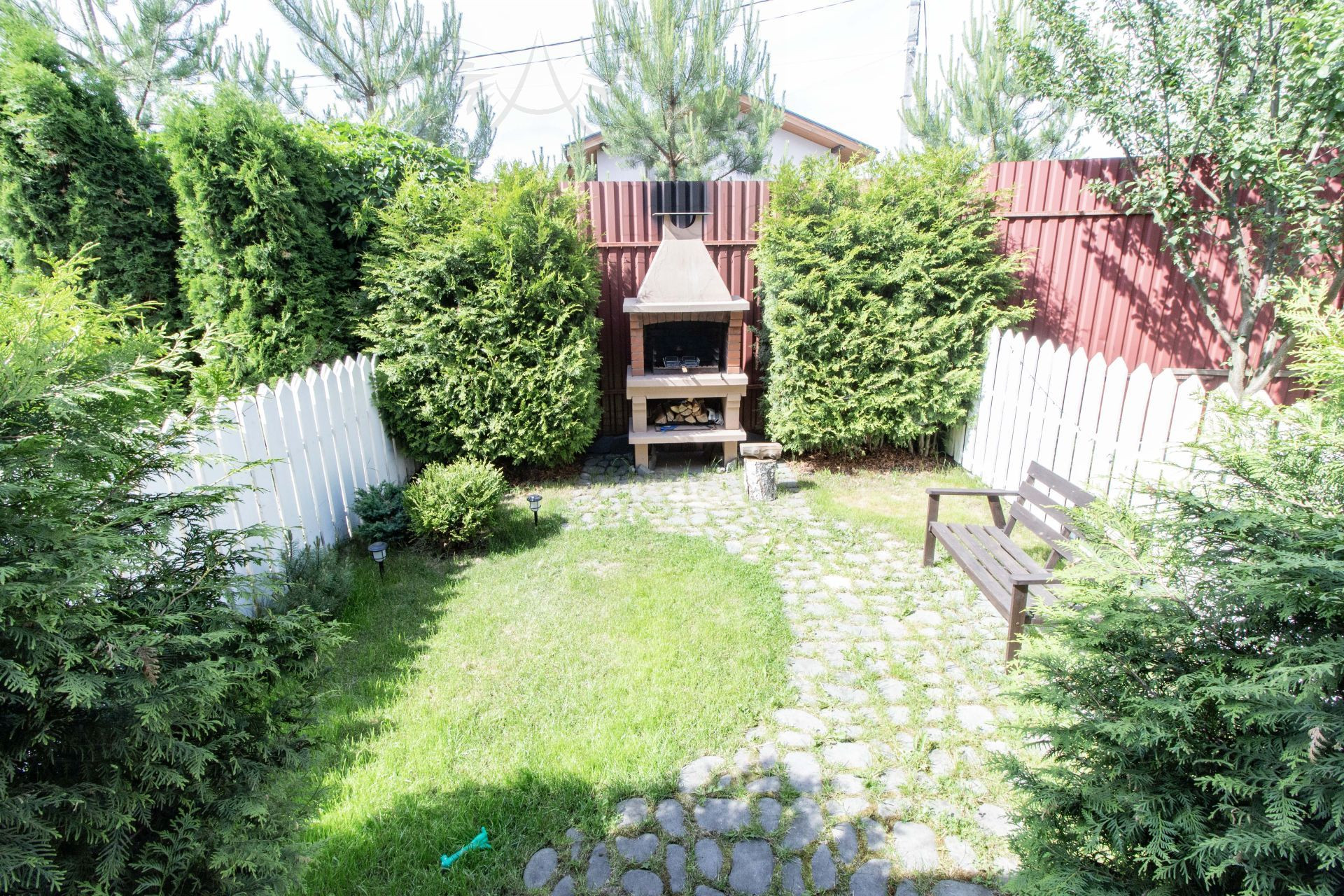 На участке зона барбекю, большая печь, растут туи.