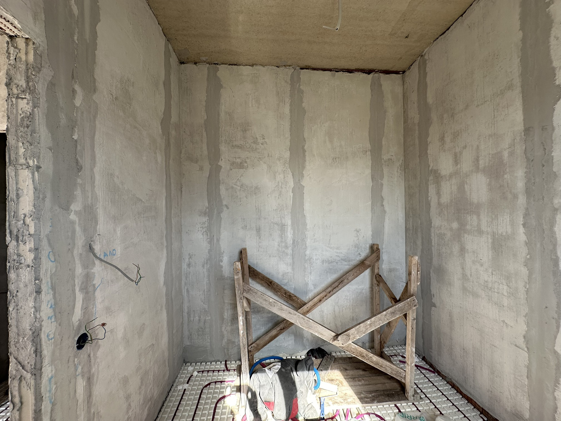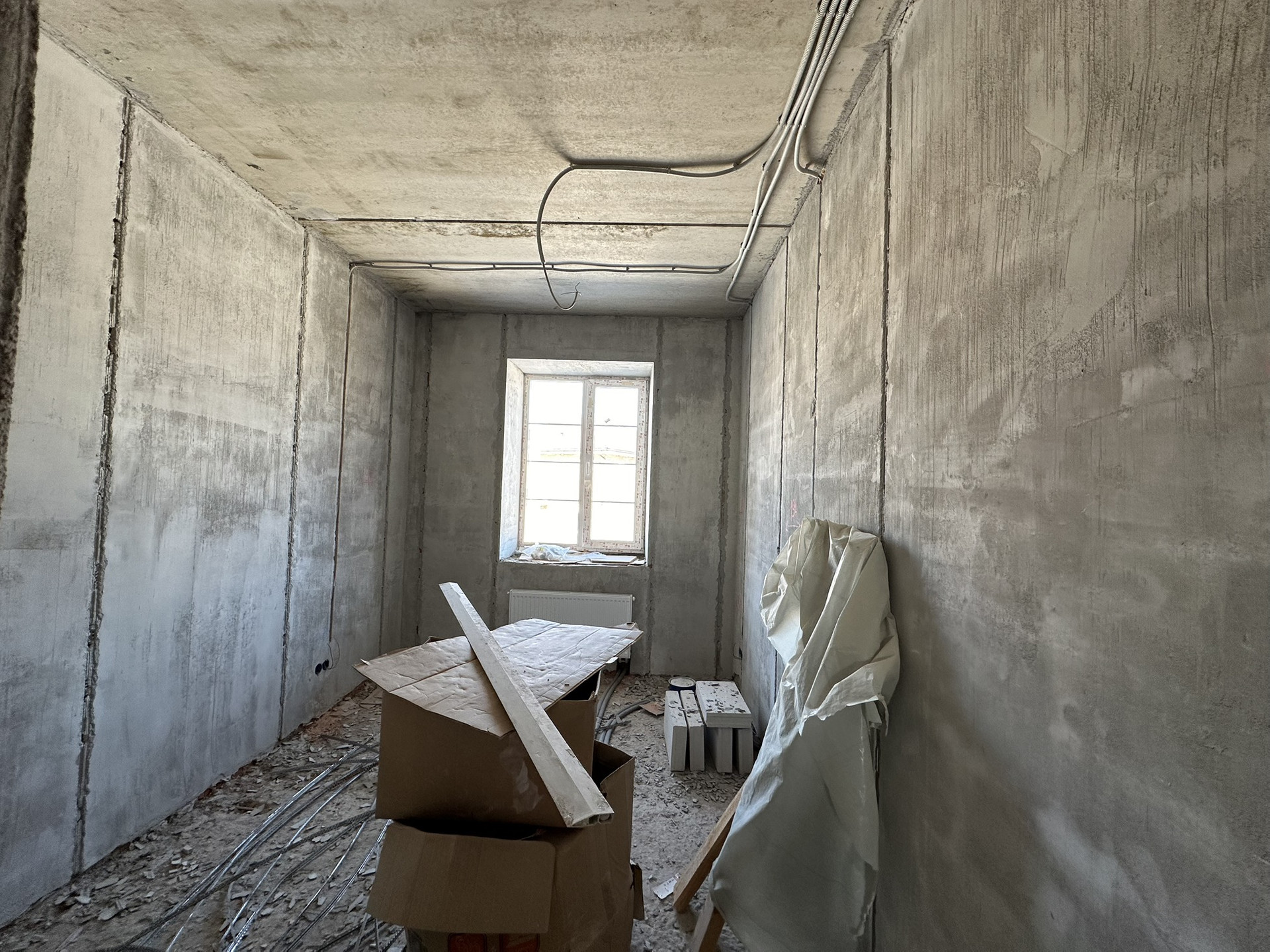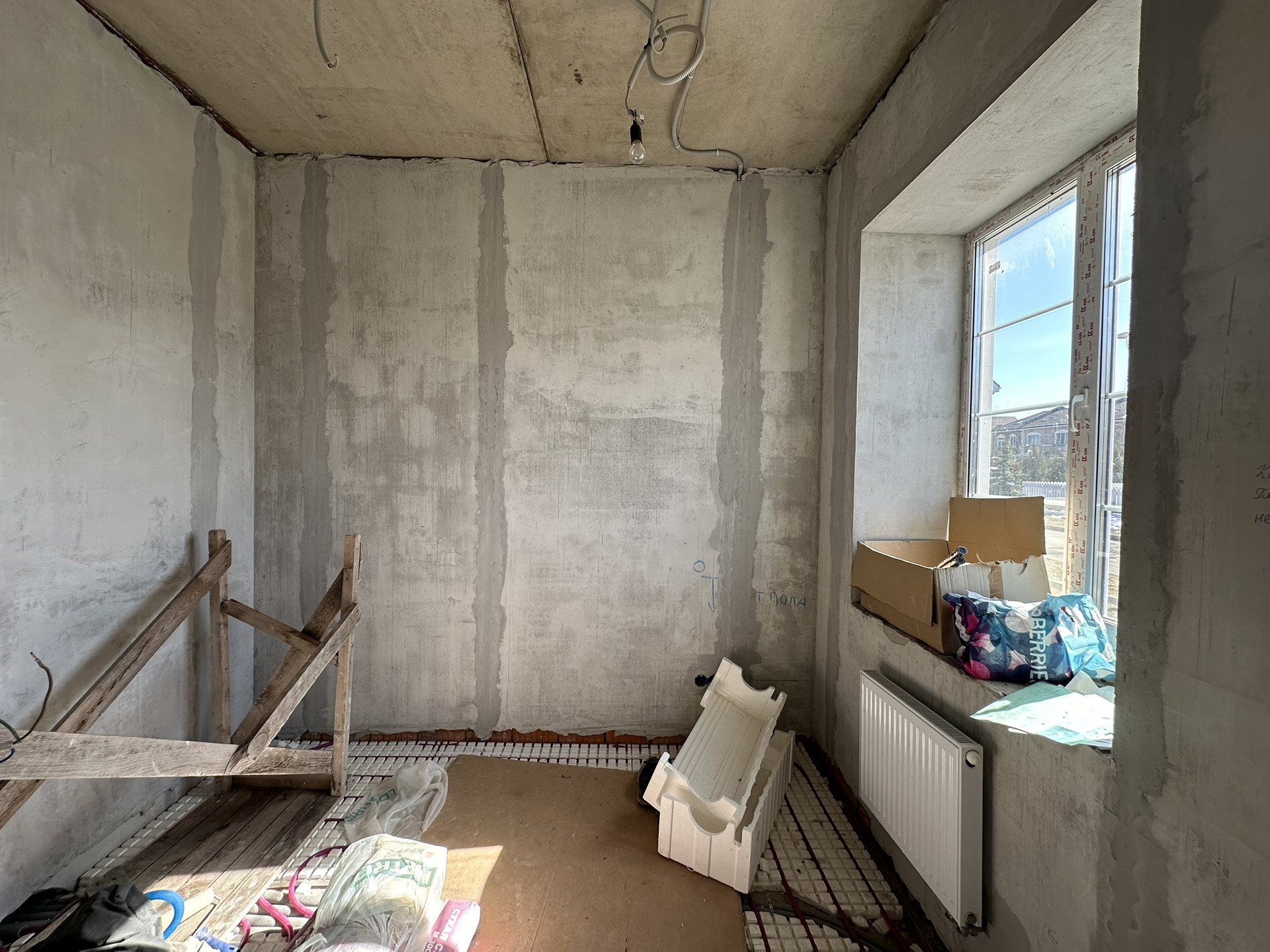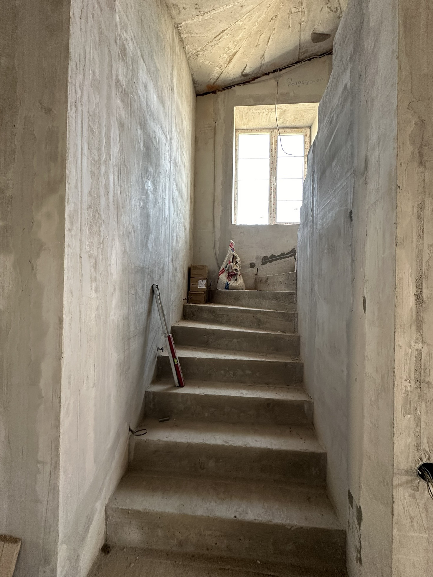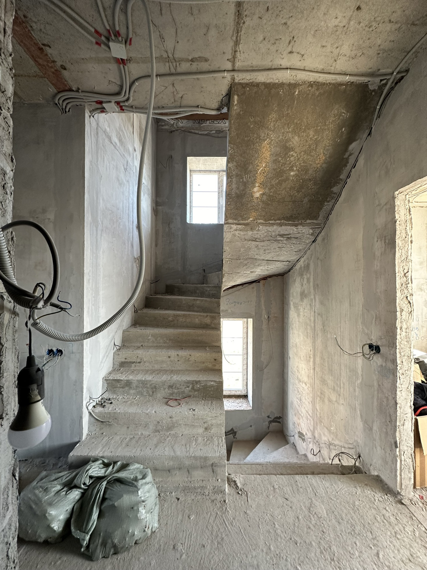 Сделан черновой ремонт: возведены стены из пазогребня, залита межэтажная лестница в с первого на третий этаж, стены поштукатурены, разведена электрика и водоотведение с отоплением по всему дому