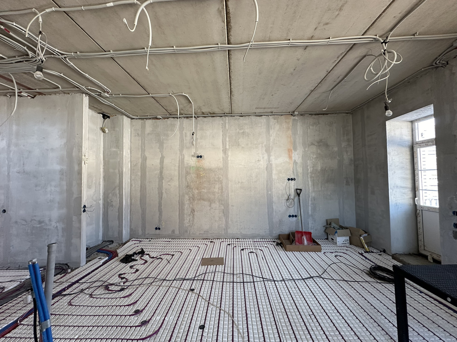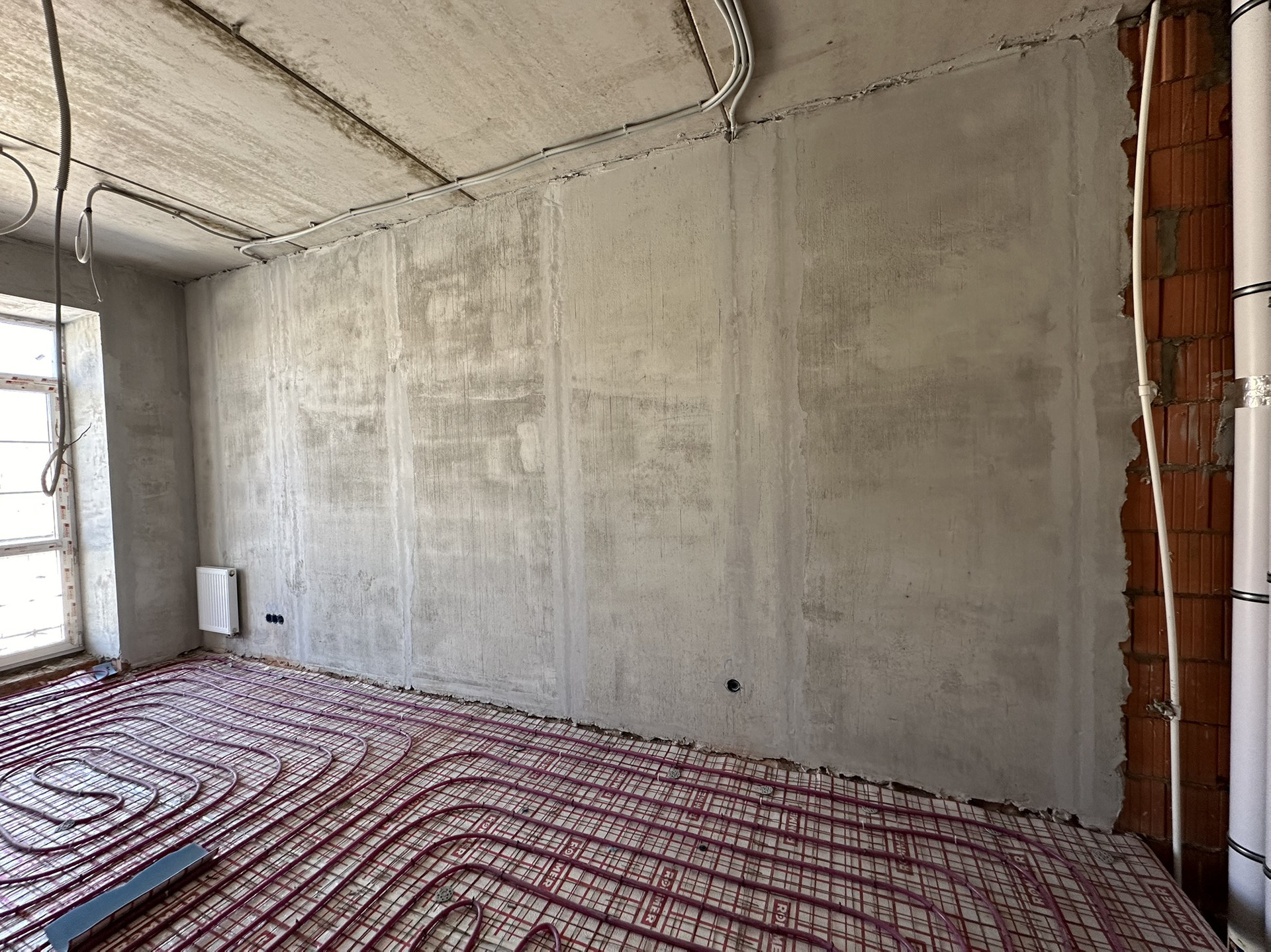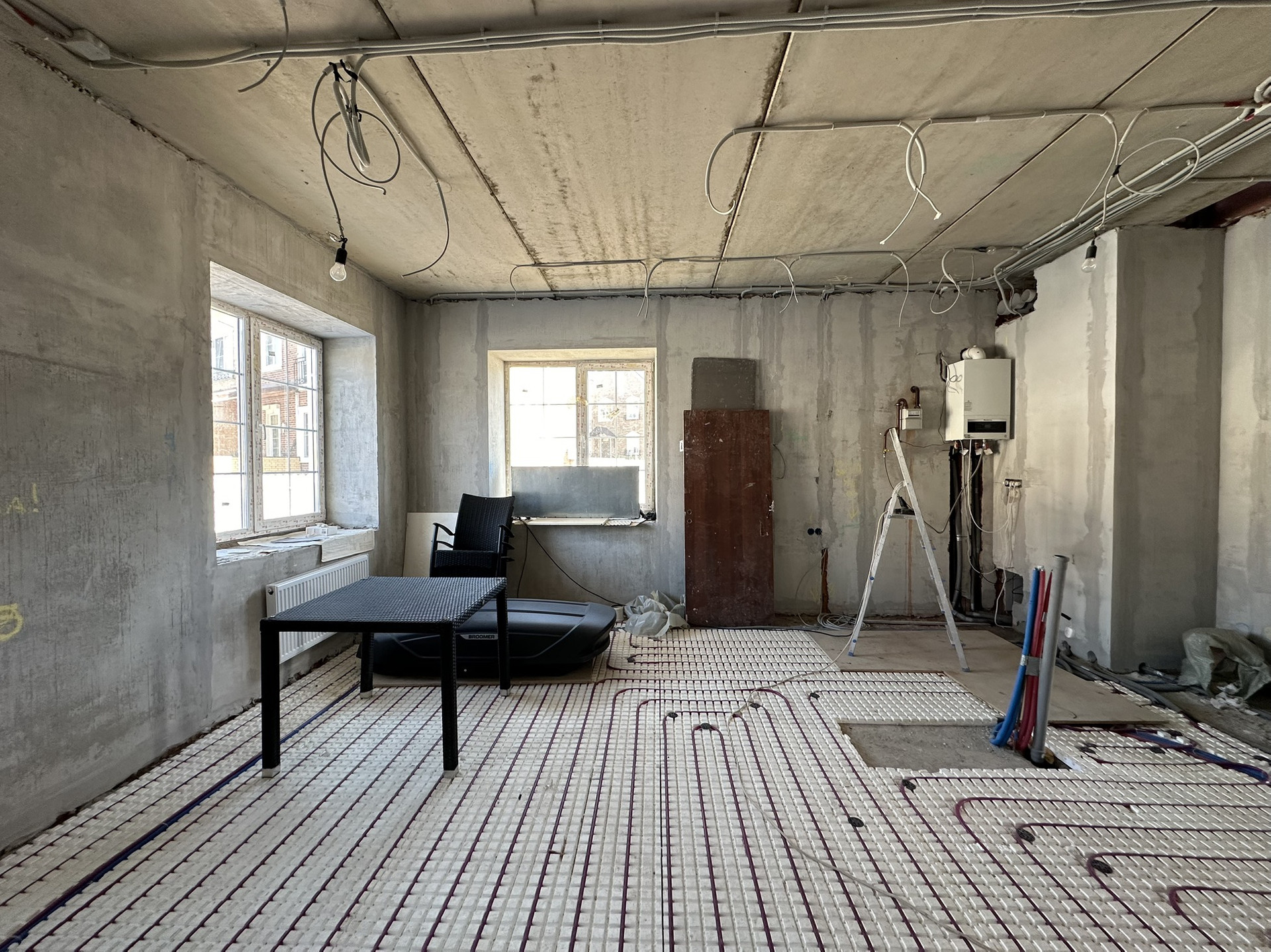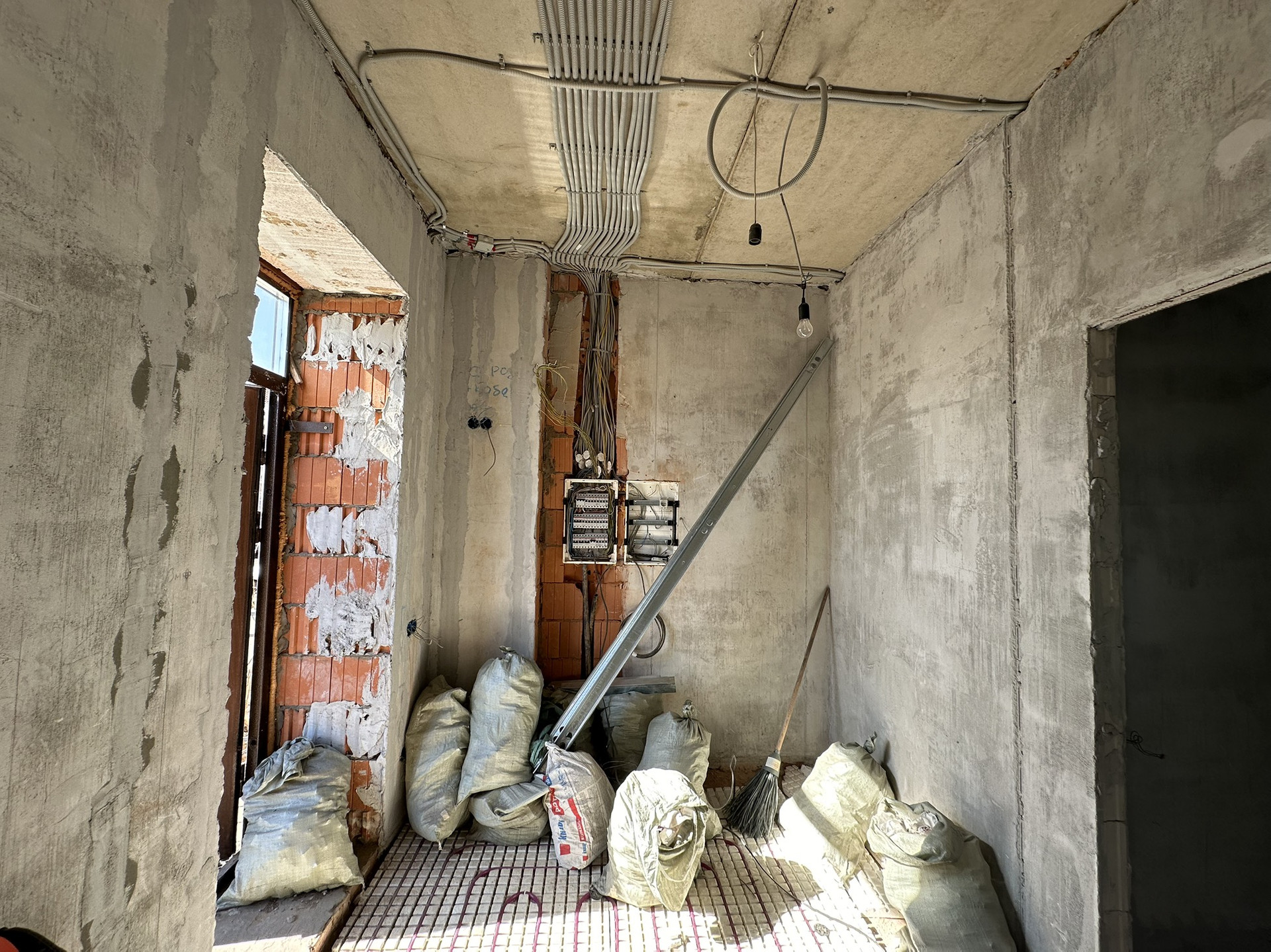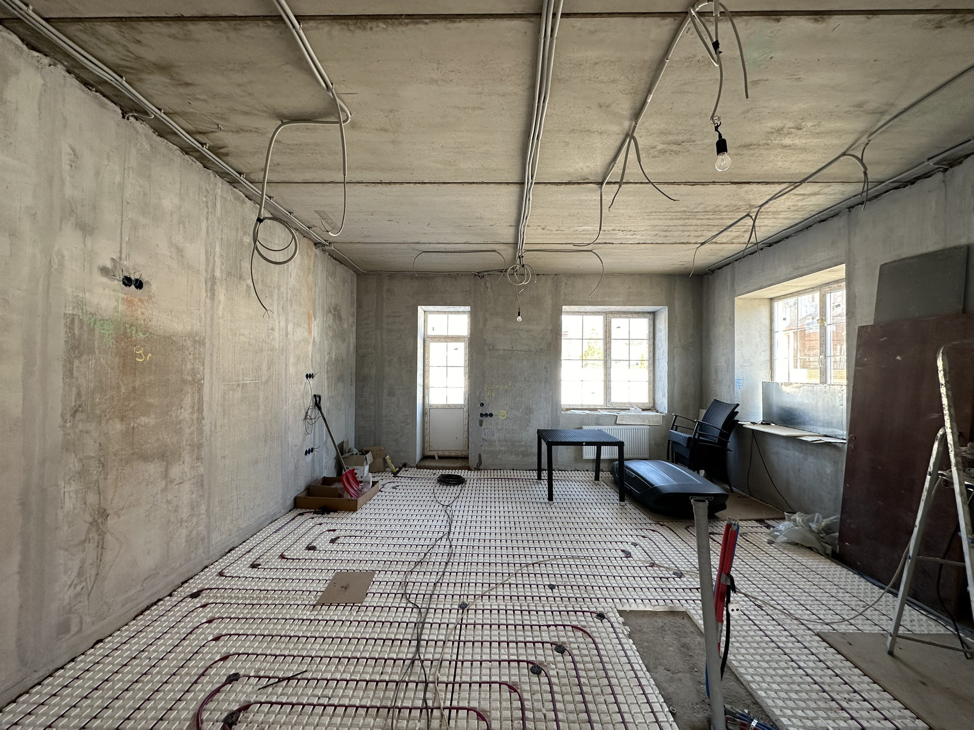 Сделан черновой ремонт: возведены стены из пазогребня, залита межэтажная лестница в с первого на третий этаж, стены поштукатурены, разведена электрика и водоотведение с отоплением по всему дому