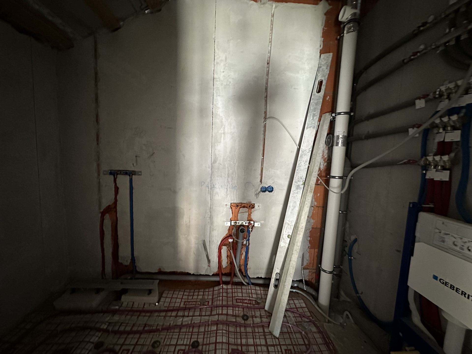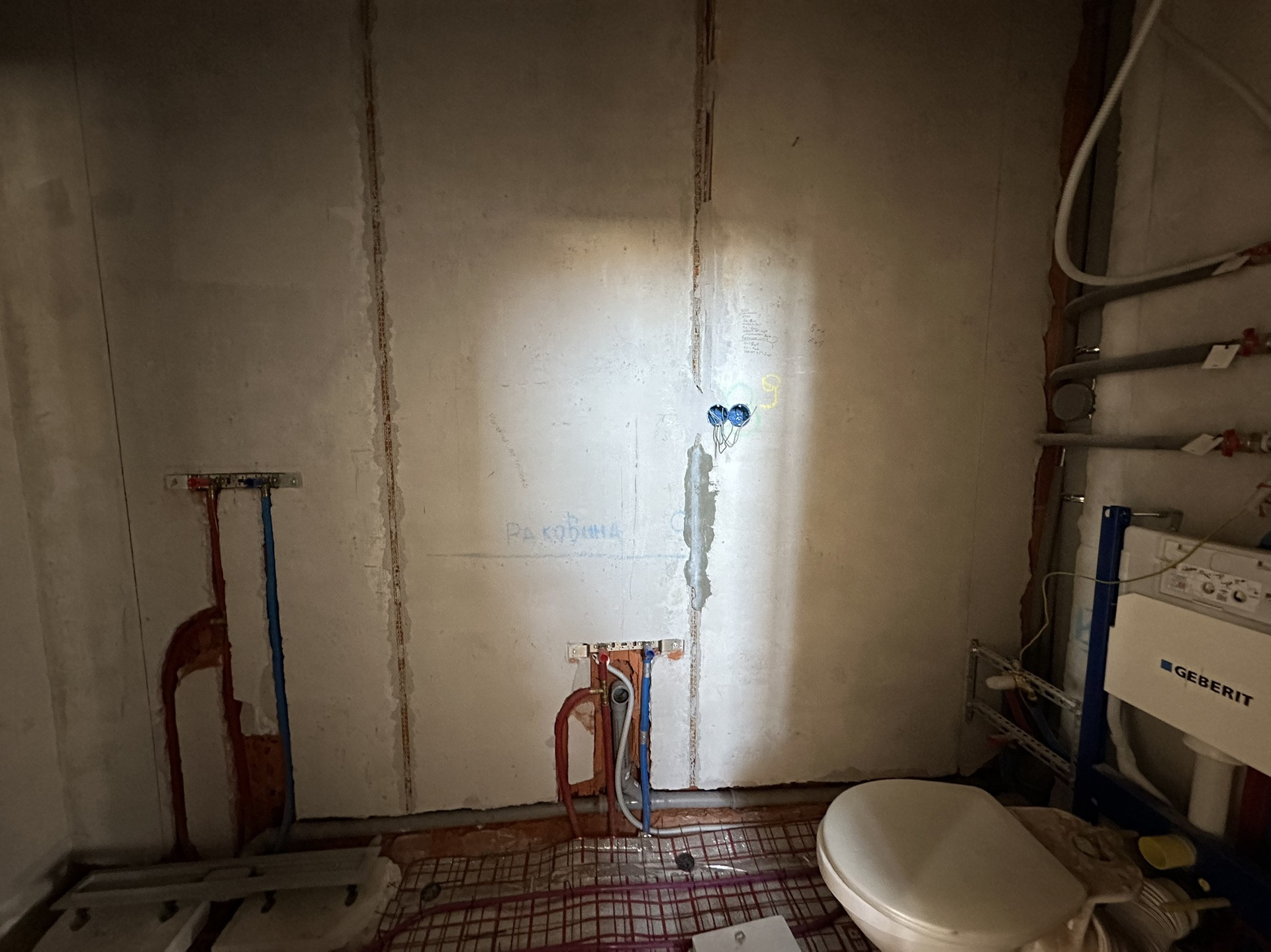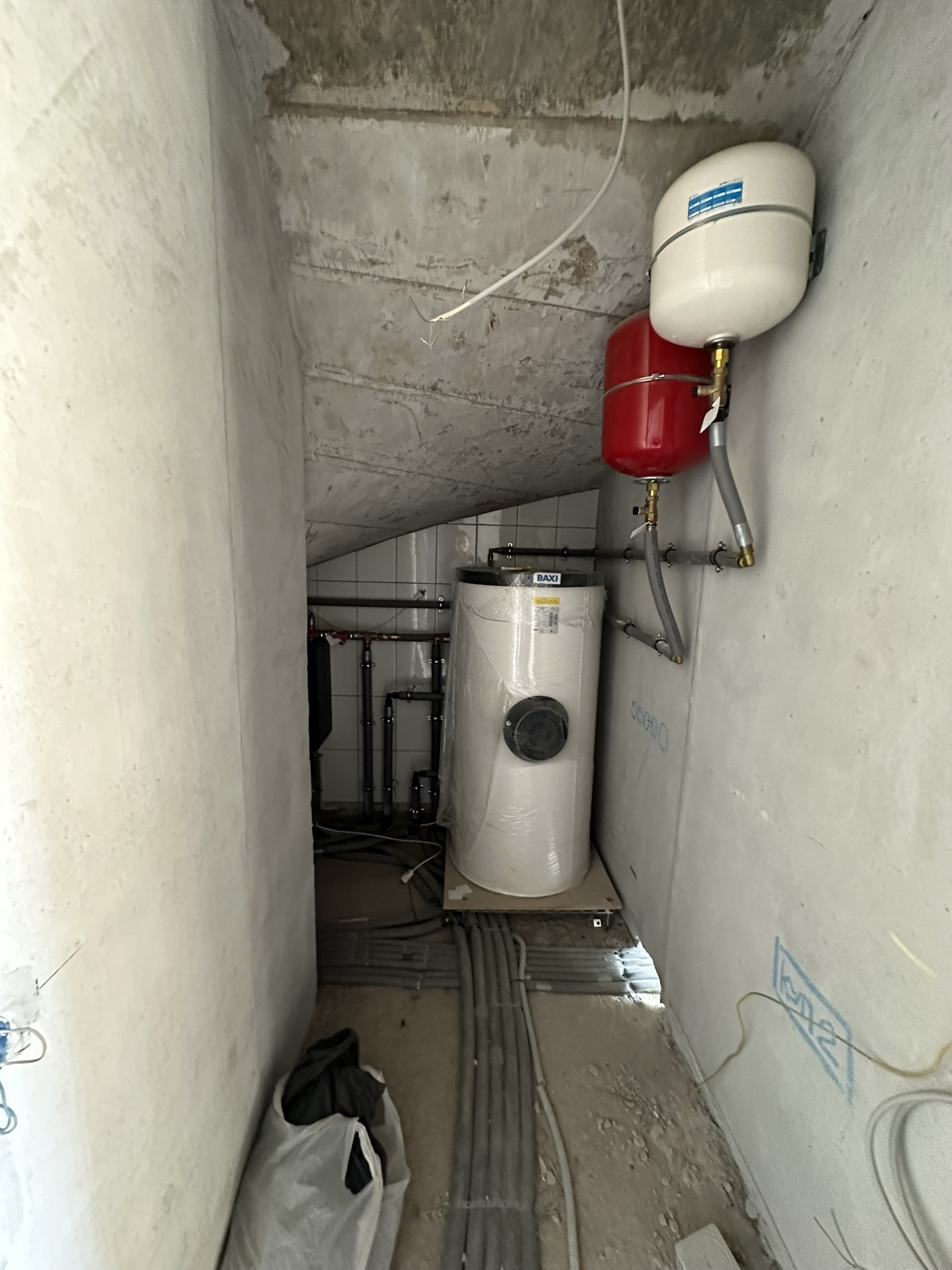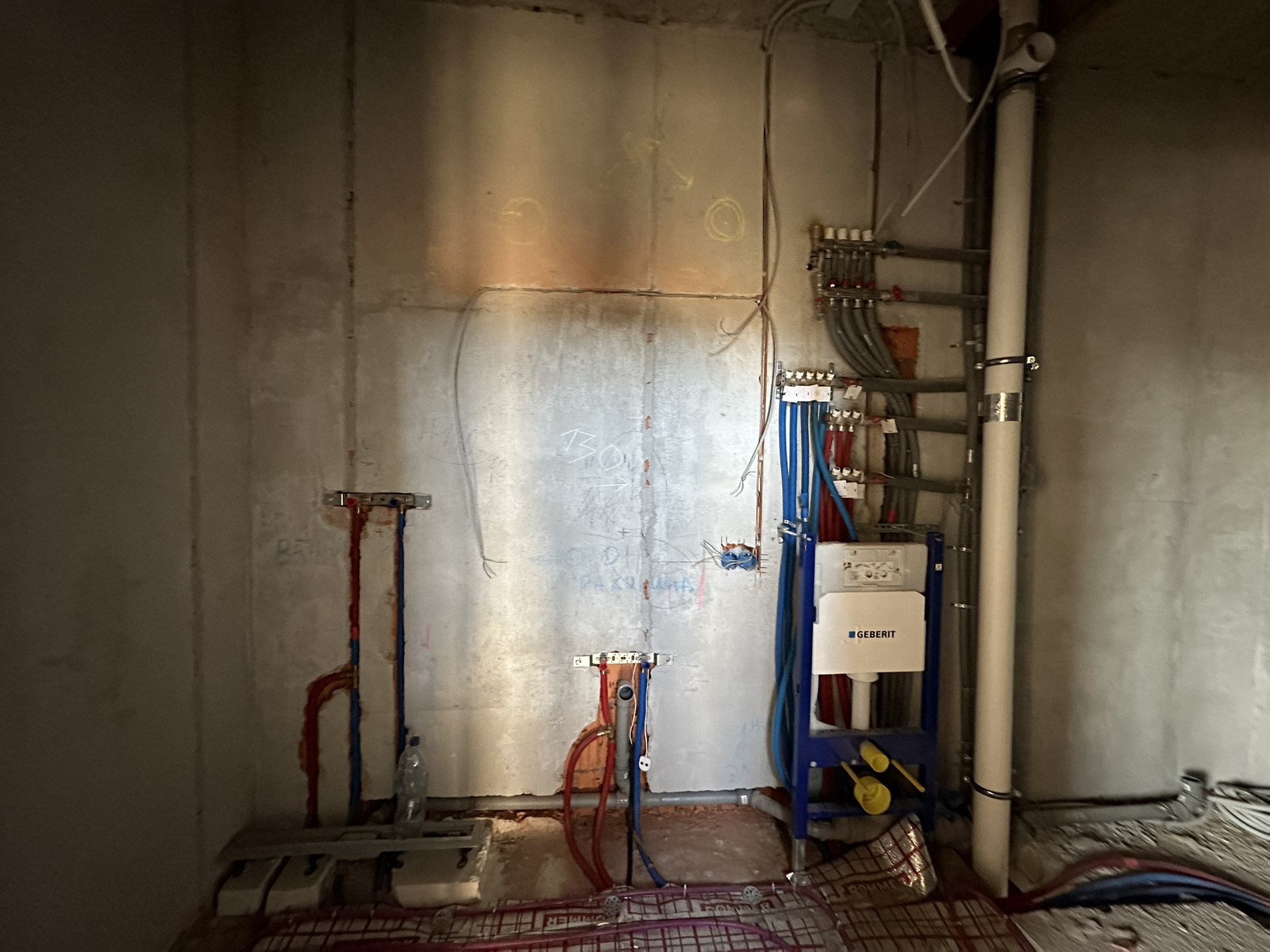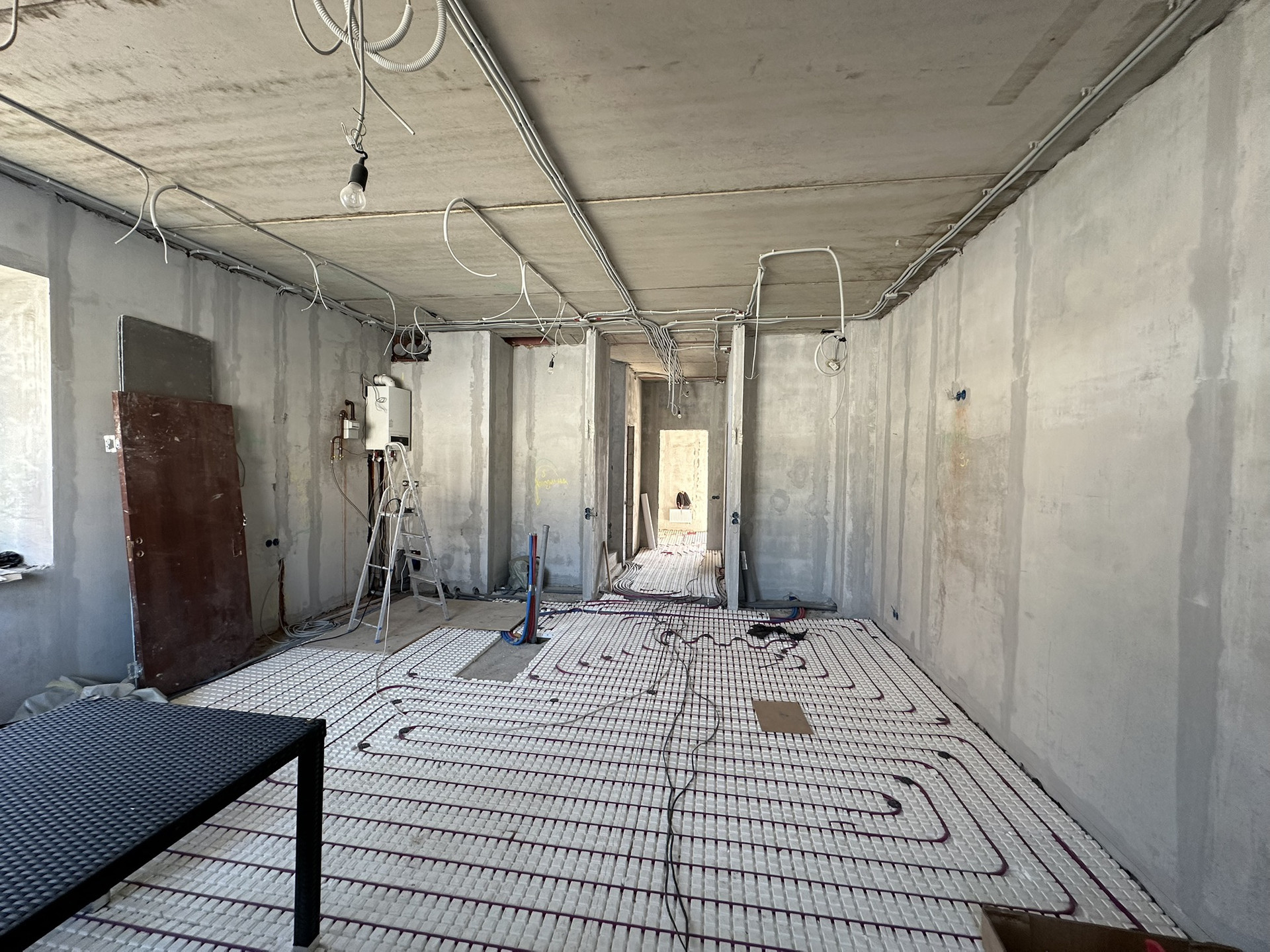 Сделан черновой ремонт: возведены стены из пазогребня, залита межэтажная лестница в с первого на третий этаж, стены поштукатурены, разведена электрика и водоотведение с отоплением по всему дому