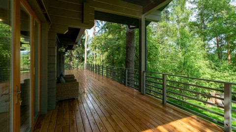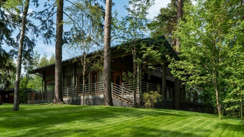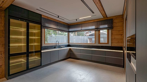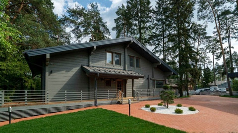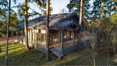 Дом площадью 350 м2 с панорамными окнами и дизайнерской отделкой оборудован всем необходимым: стильная немецкая кухня с техникой Smeg, система "умный дом", приточно-вытяжная вентиляция и кондиционирование, система увлажнения воздуха во всех помещениях, отдельно стоящий теплый современный функциональный гараж на 2 машины и комнатой с су для персонала,  просторная терраса с естественной тенью от могучих сосен, великолепный дровяной камин.