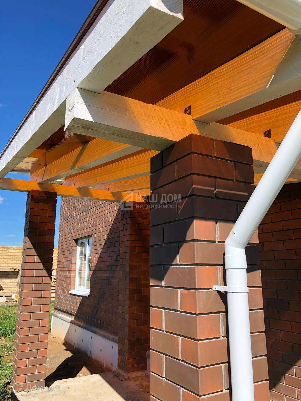 Фундамент монолитная плита 300 мм, стены из силикатного кирпича, с облицовкой керамическим кирпичом "Баварская кладка". Кровля выполнена из металлочерепицы с утеплением 200 мм, подбой, водосточная система.
