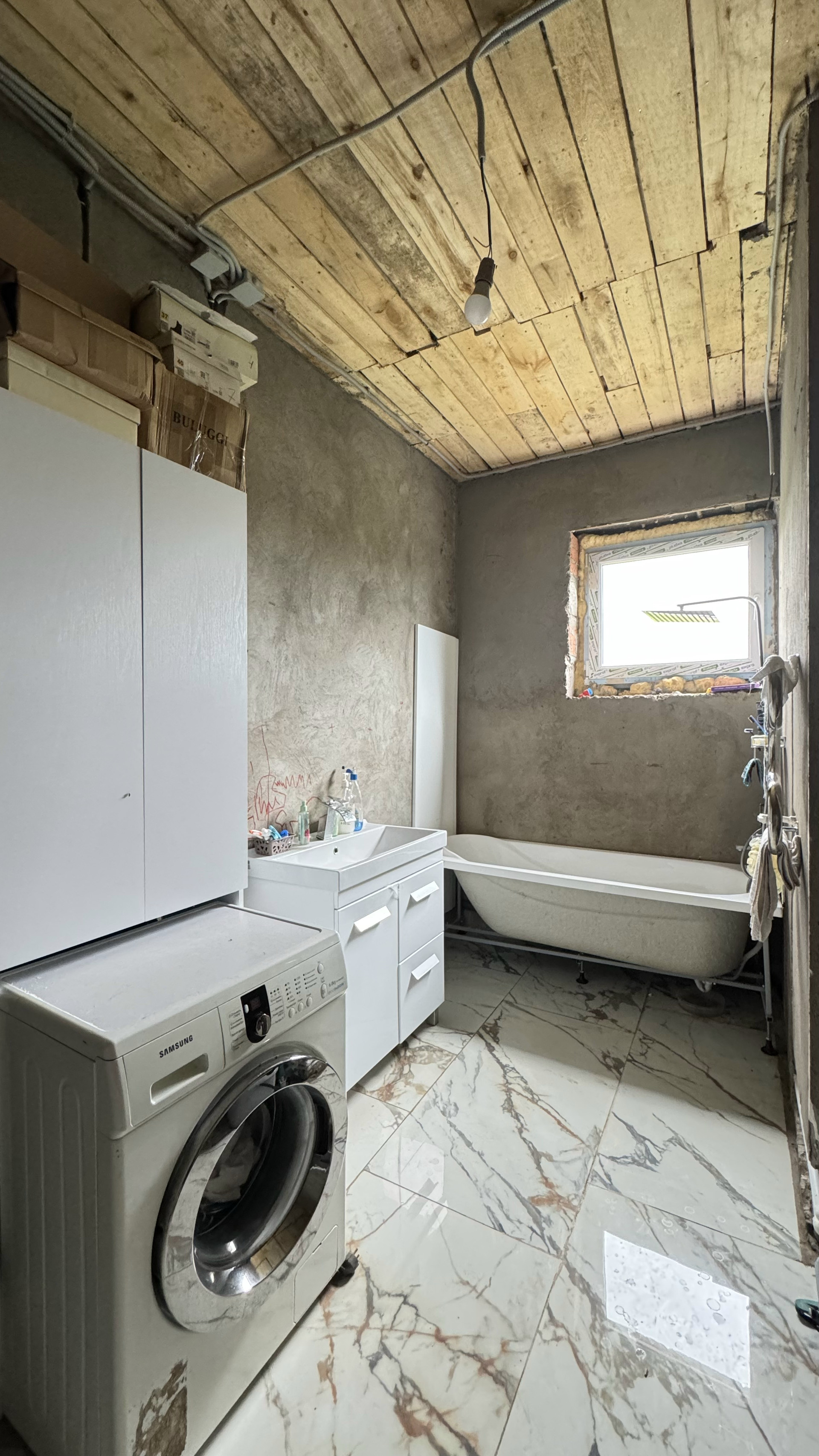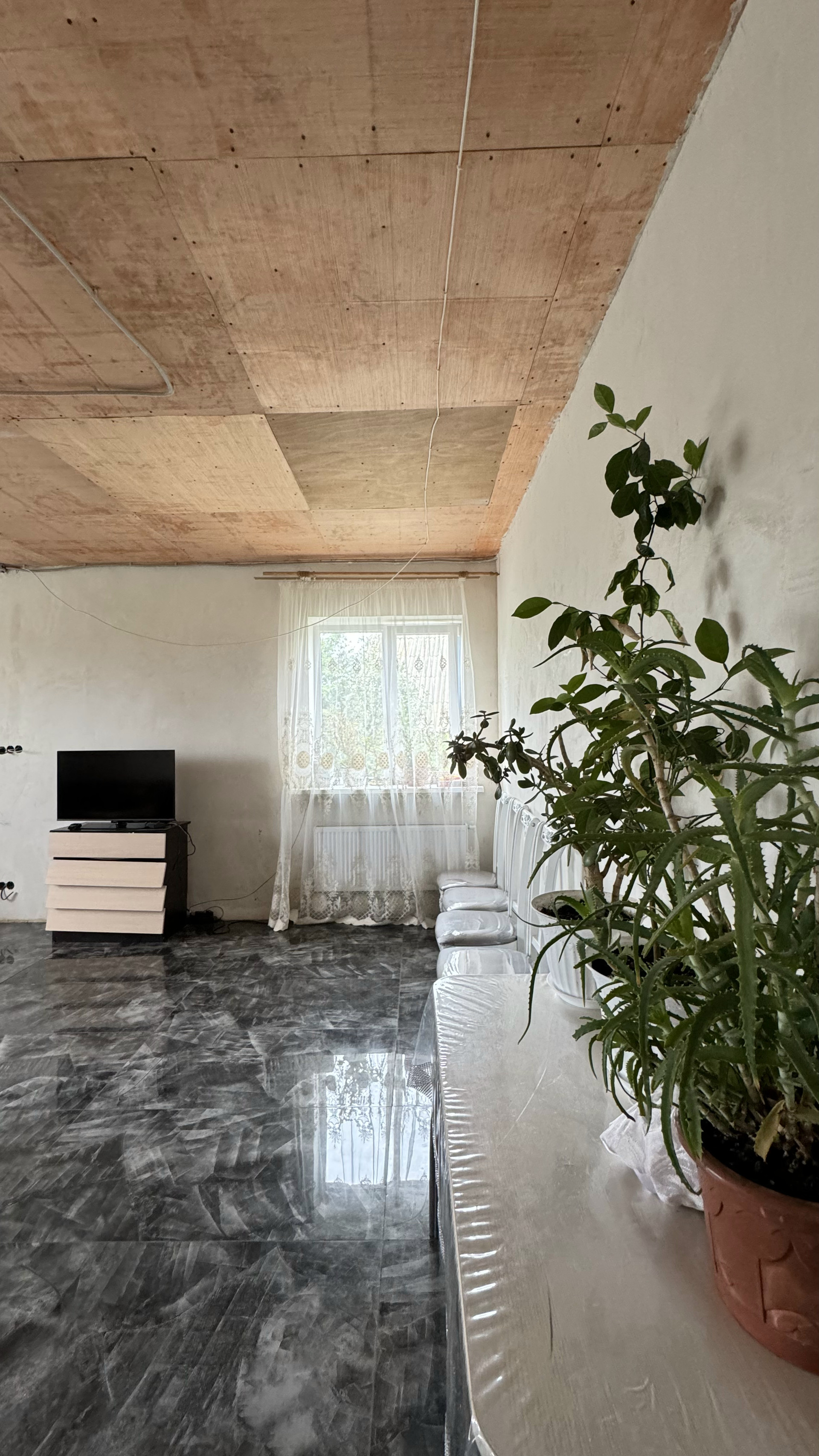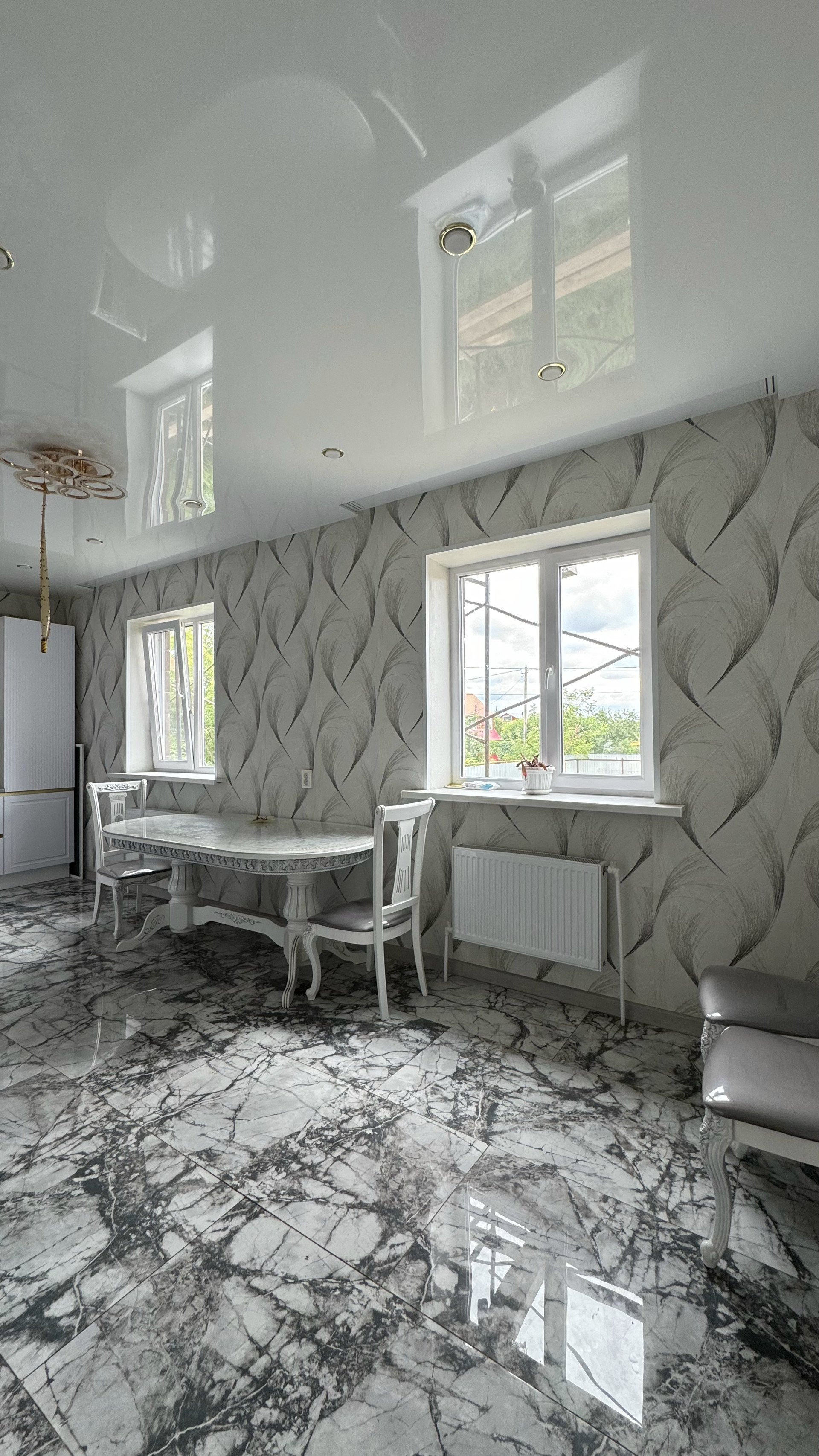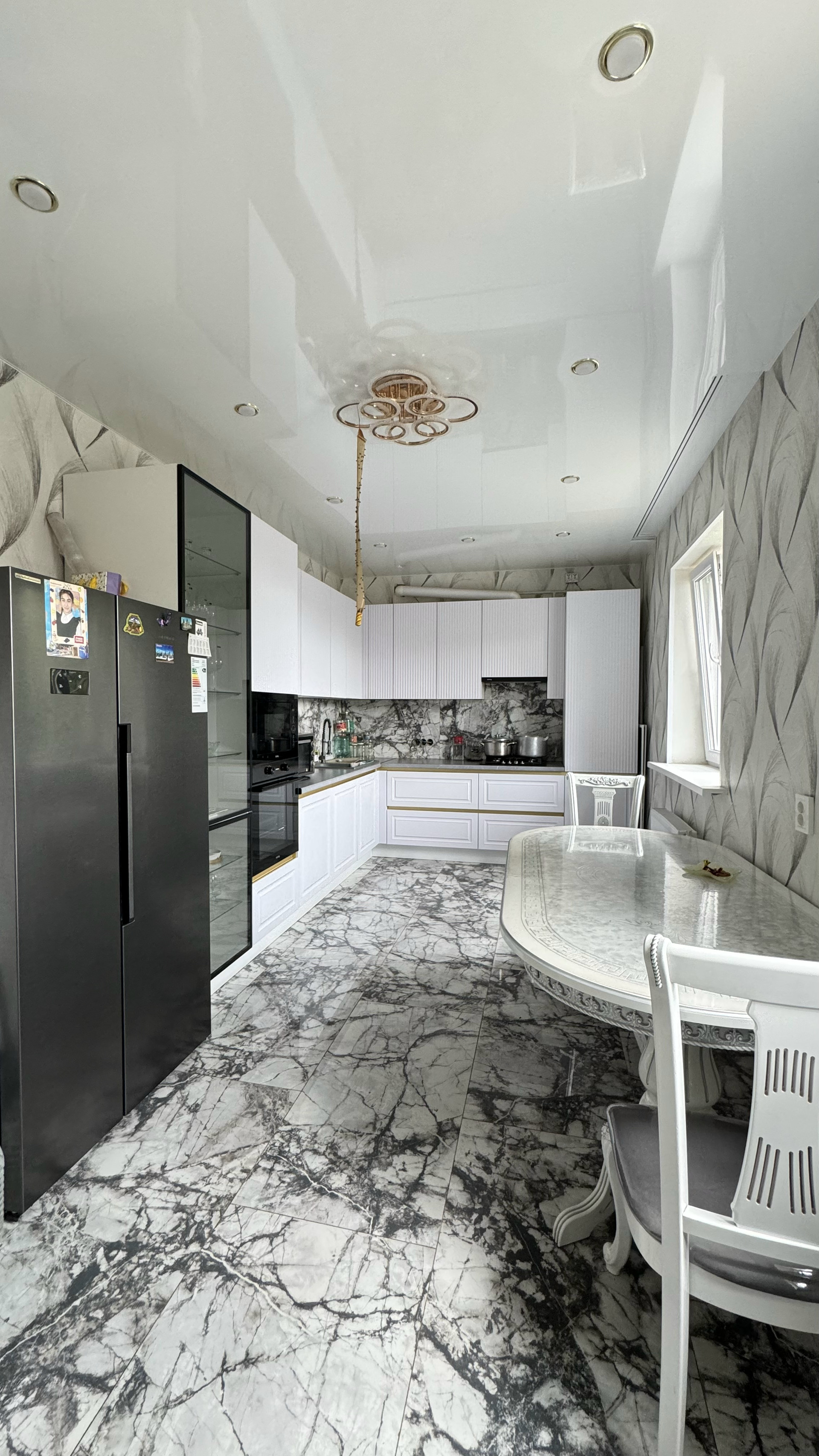 1 этаж: на полу уложена керамогранитная плитка под мрамор, натяжной потолок, на стенах наклеены обои, вся необходимая техника и сантехника установлены