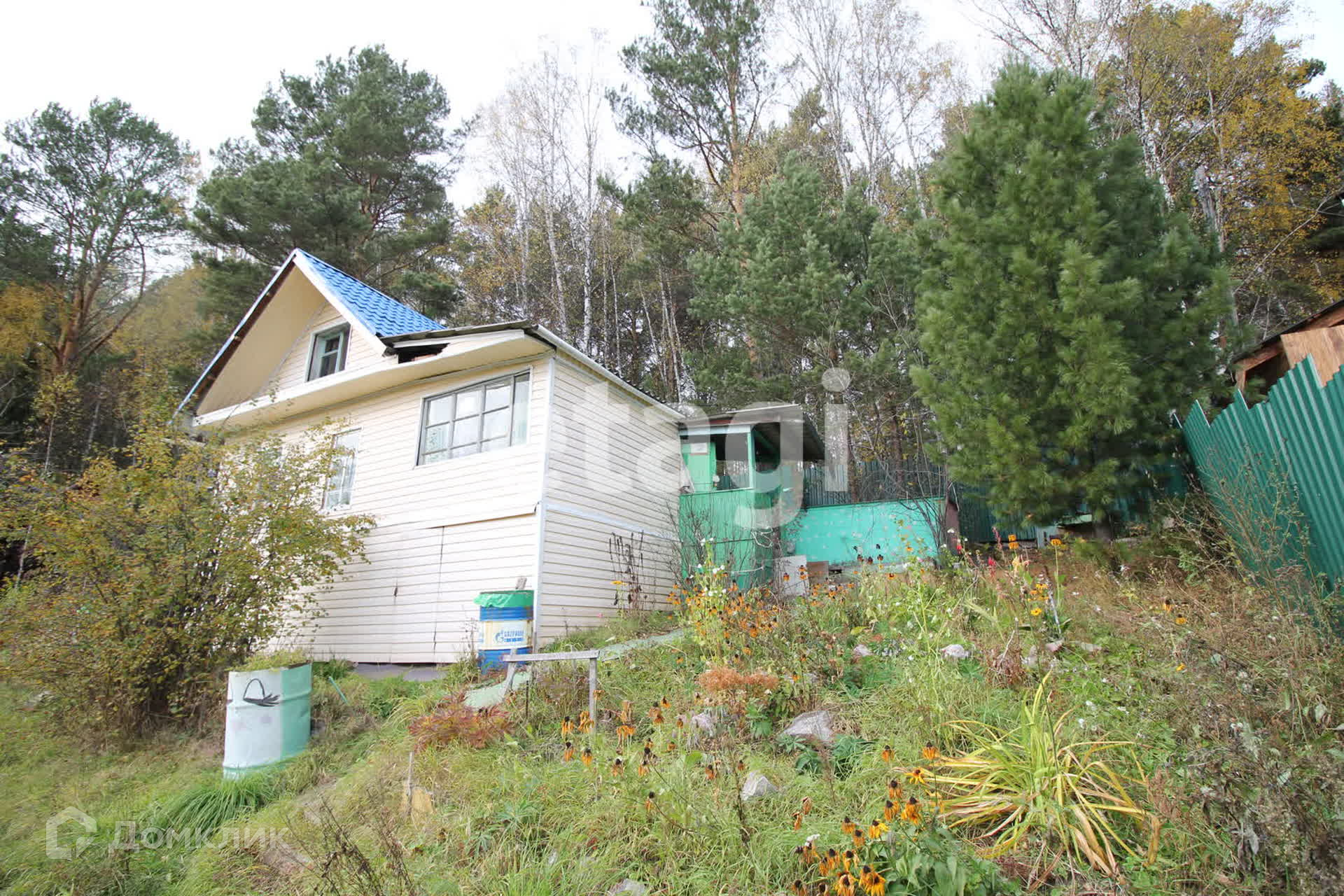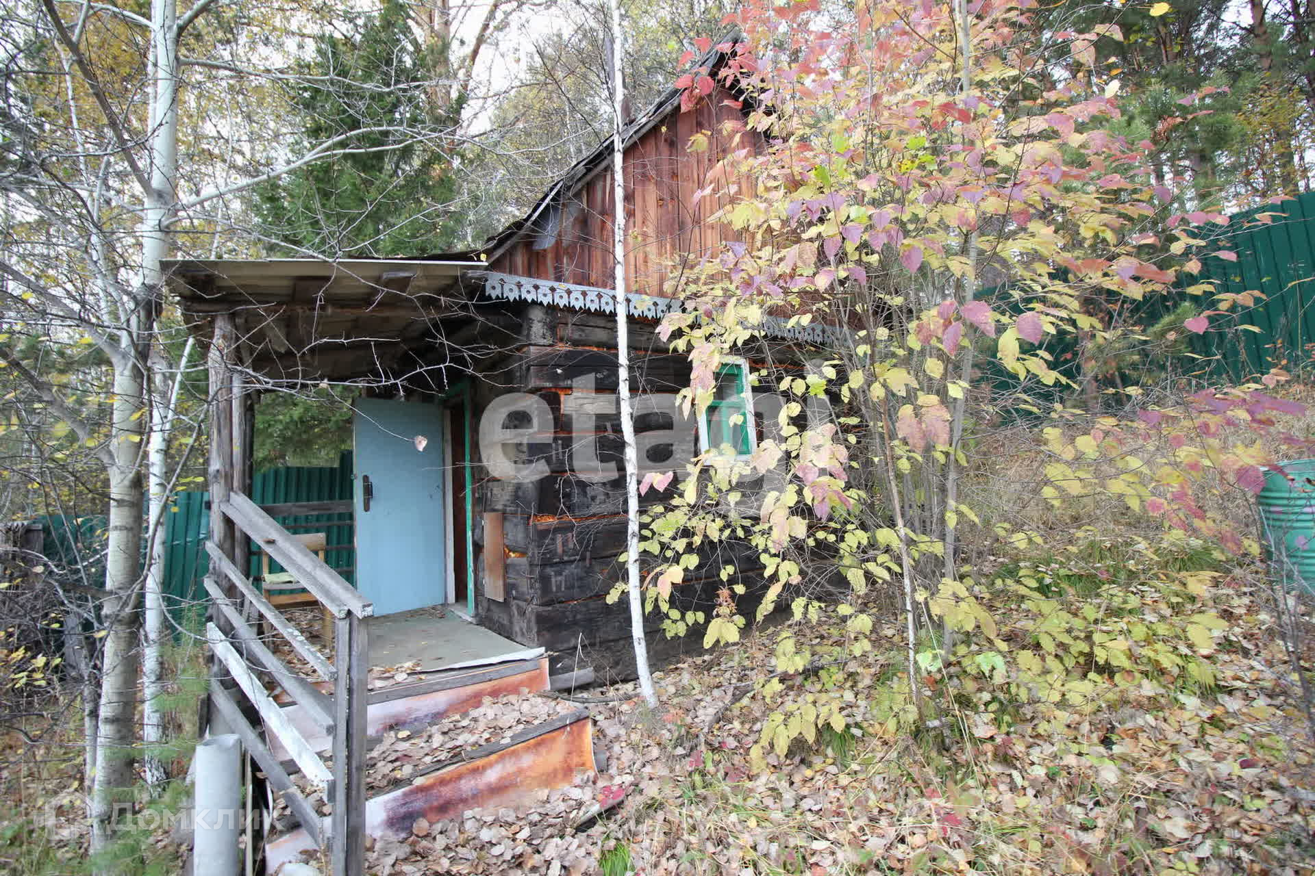 На участке расположен брусовой дом площадью 40 квадратов. Снаружи отделан сайдингом, внутри веранда оборудованная кухней и большая комната с кирпичной печкой.