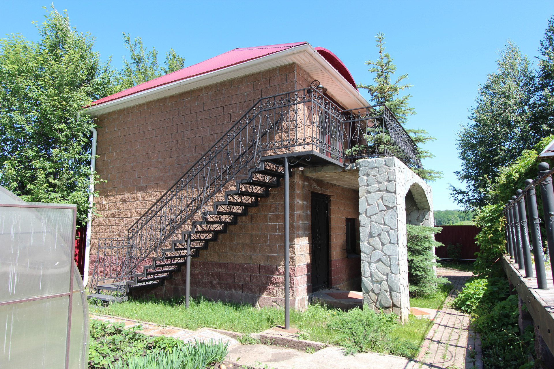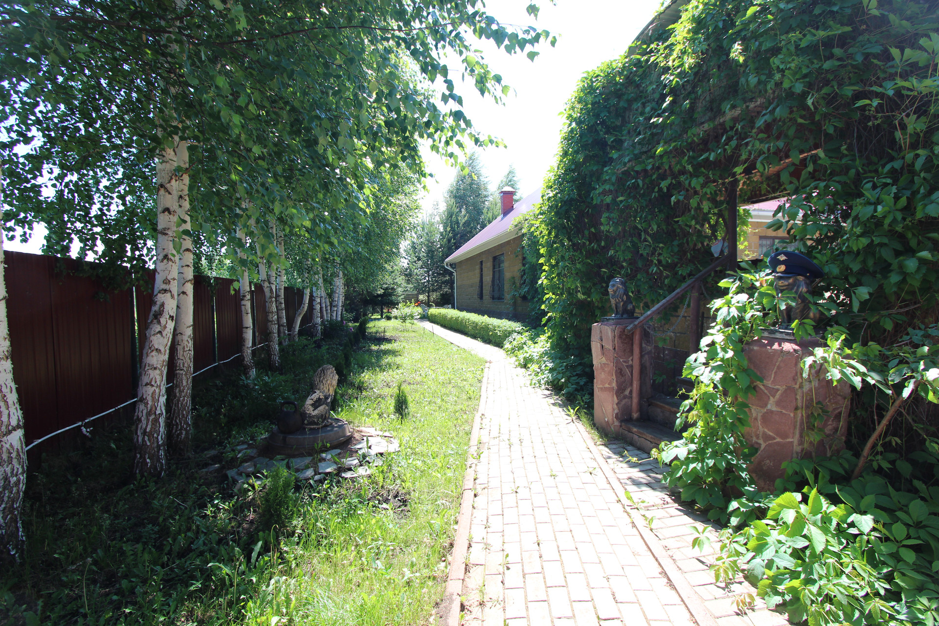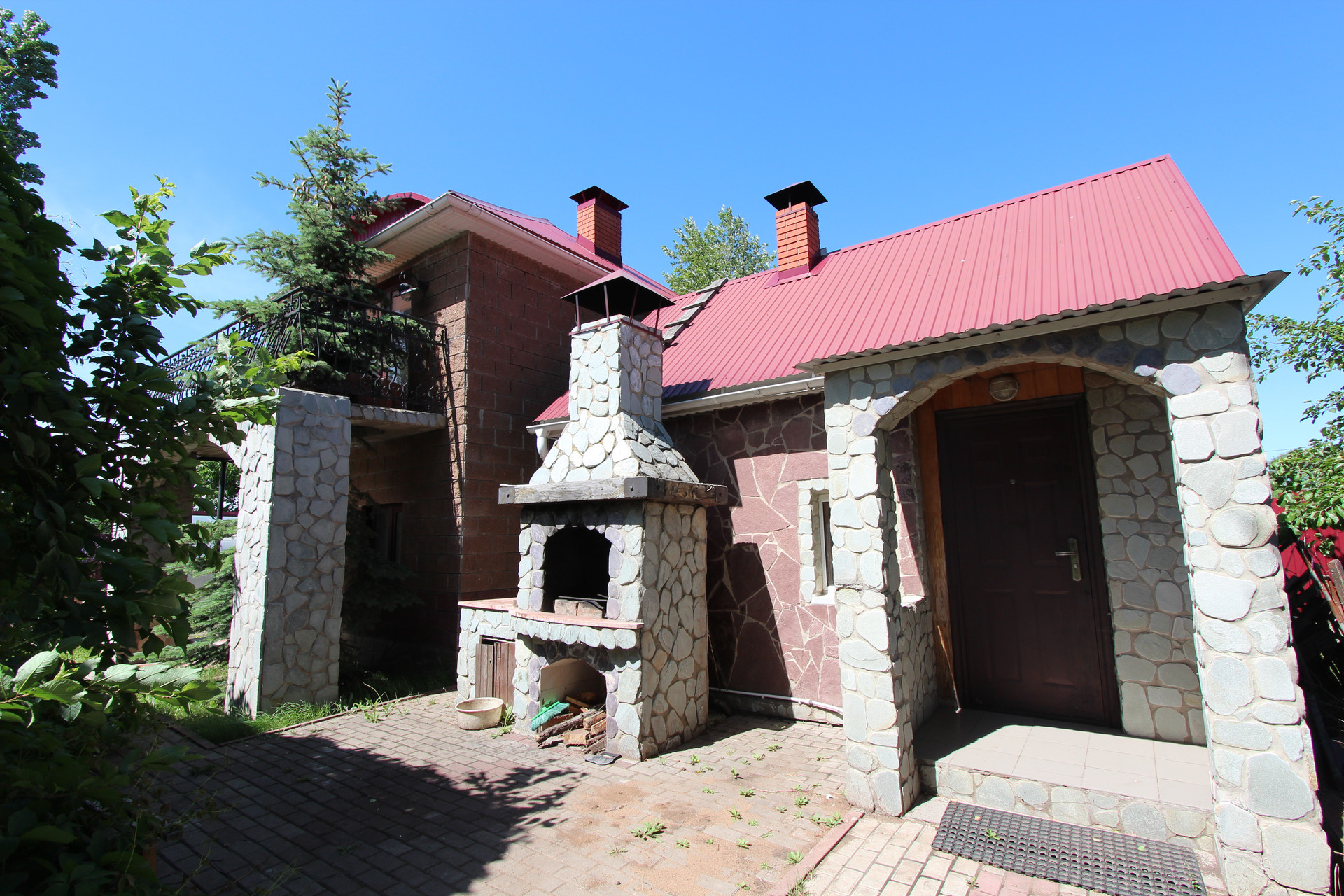 На участке имеется: двухэтажный гостевой дом с камином на каждом этаже, шикарная баня, беседка в форме корабля с летним бассейном, водопад, небольшой пруд, мангальная зона.