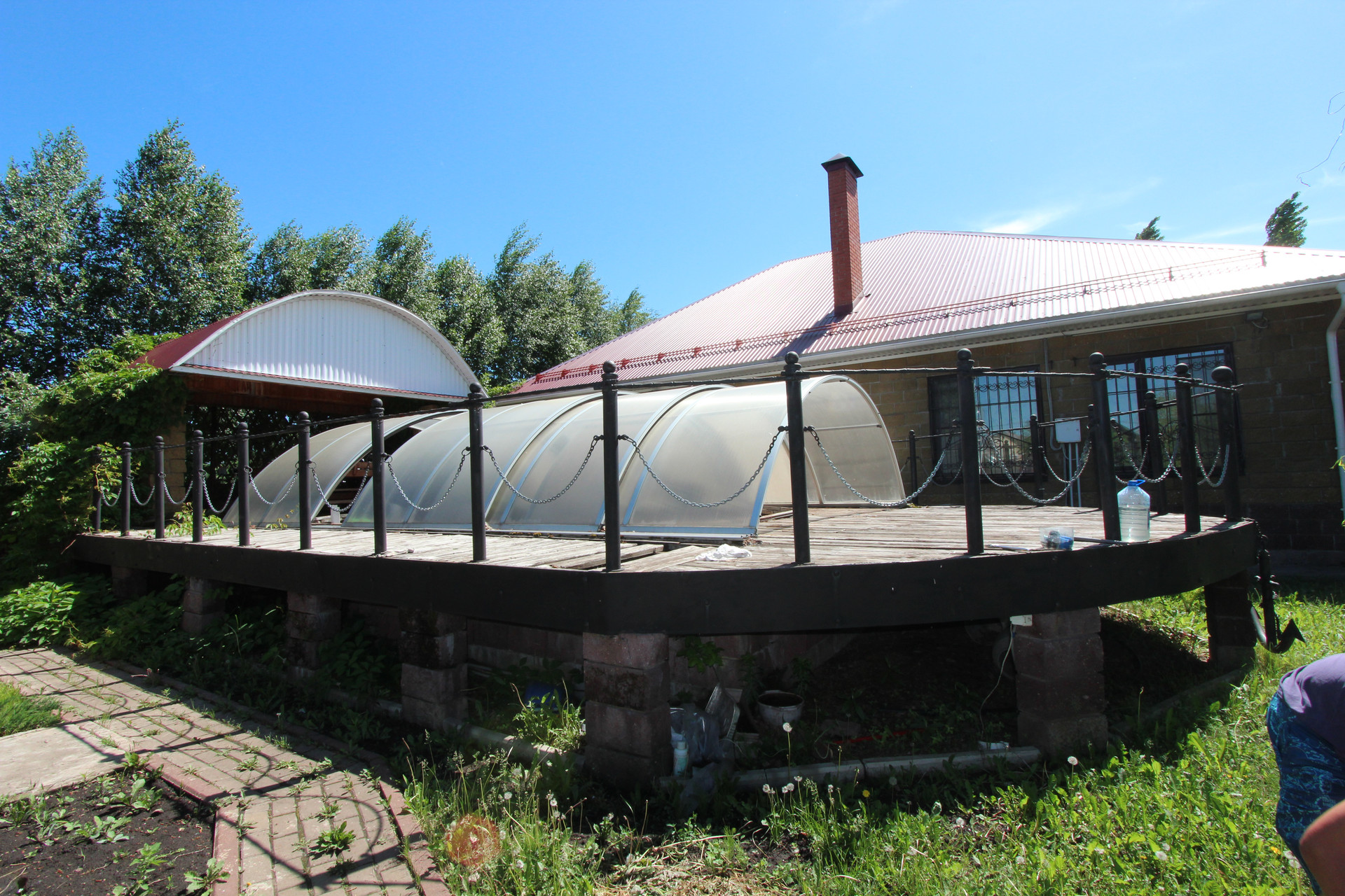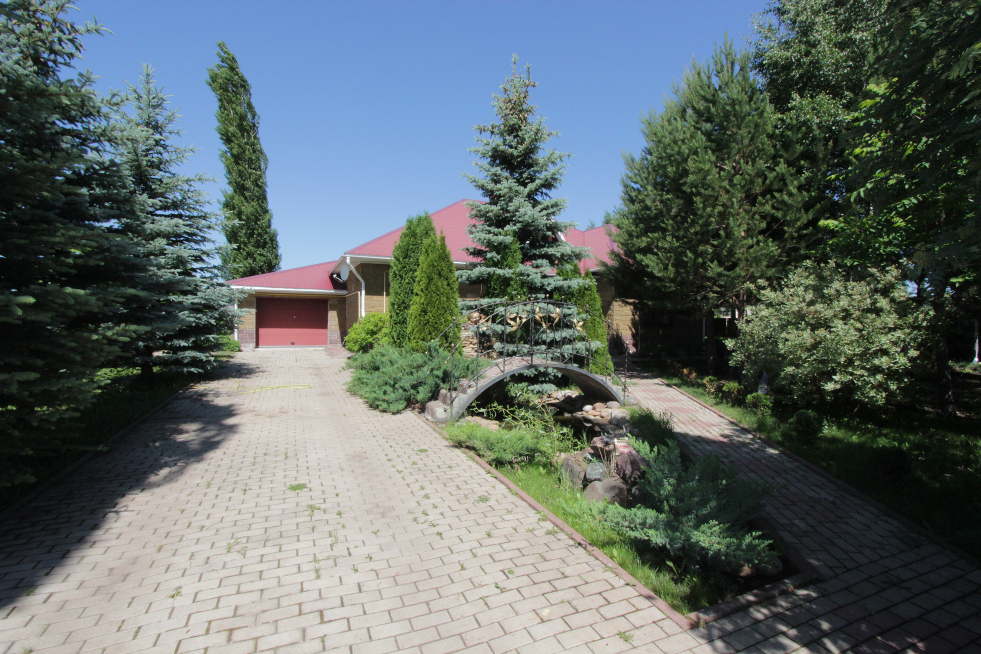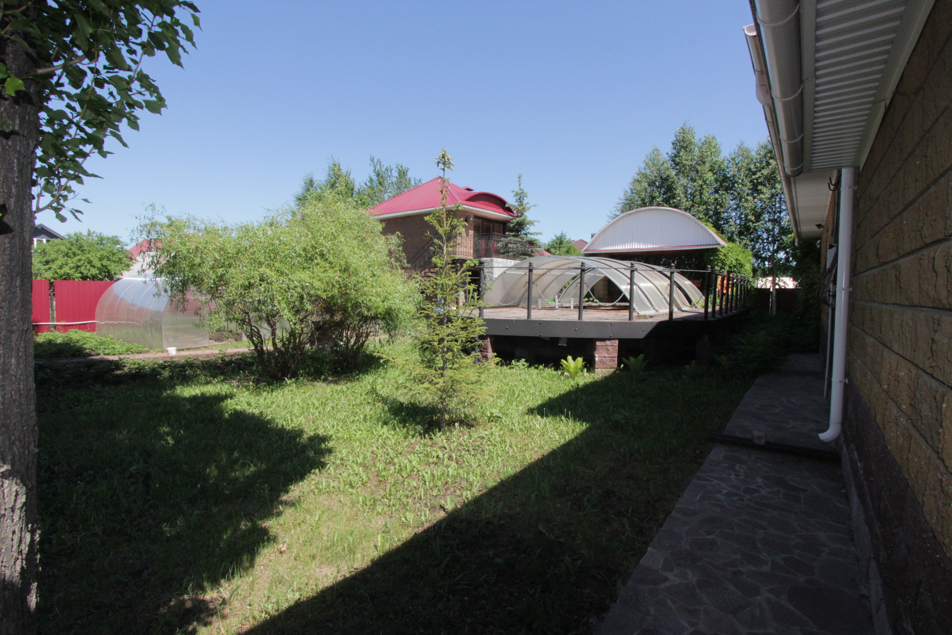 На участке имеется: двухэтажный гостевой дом с камином на каждом этаже, шикарная баня, беседка в форме корабля с летним бассейном, водопад, небольшой пруд, мангальная зона.