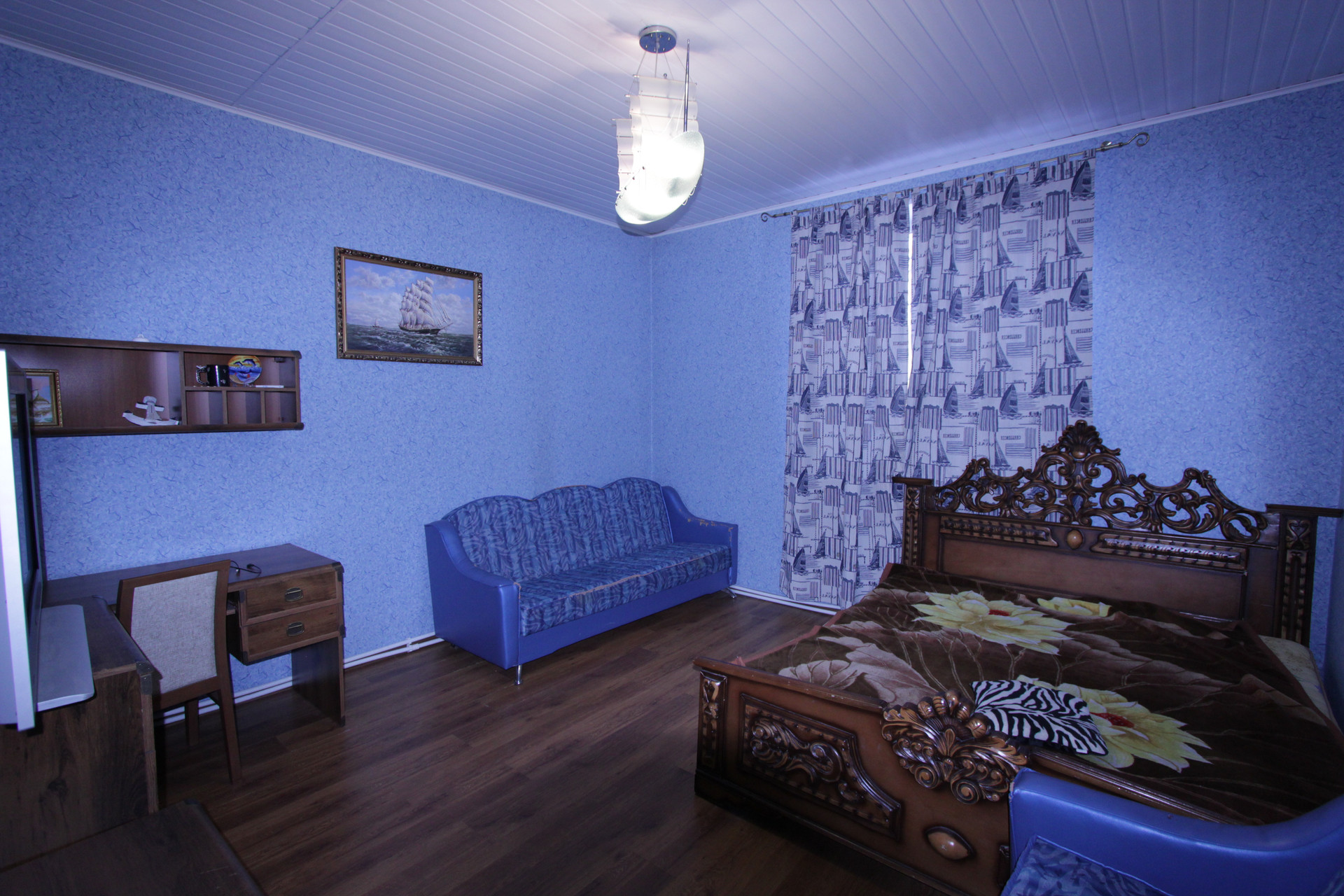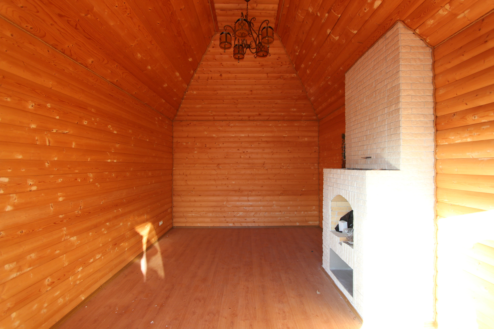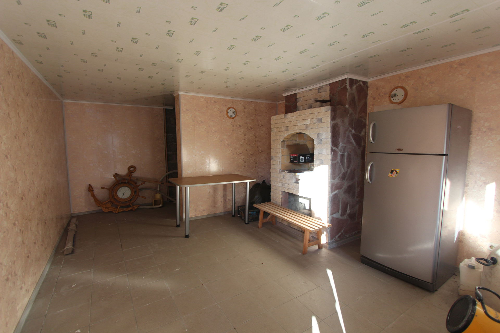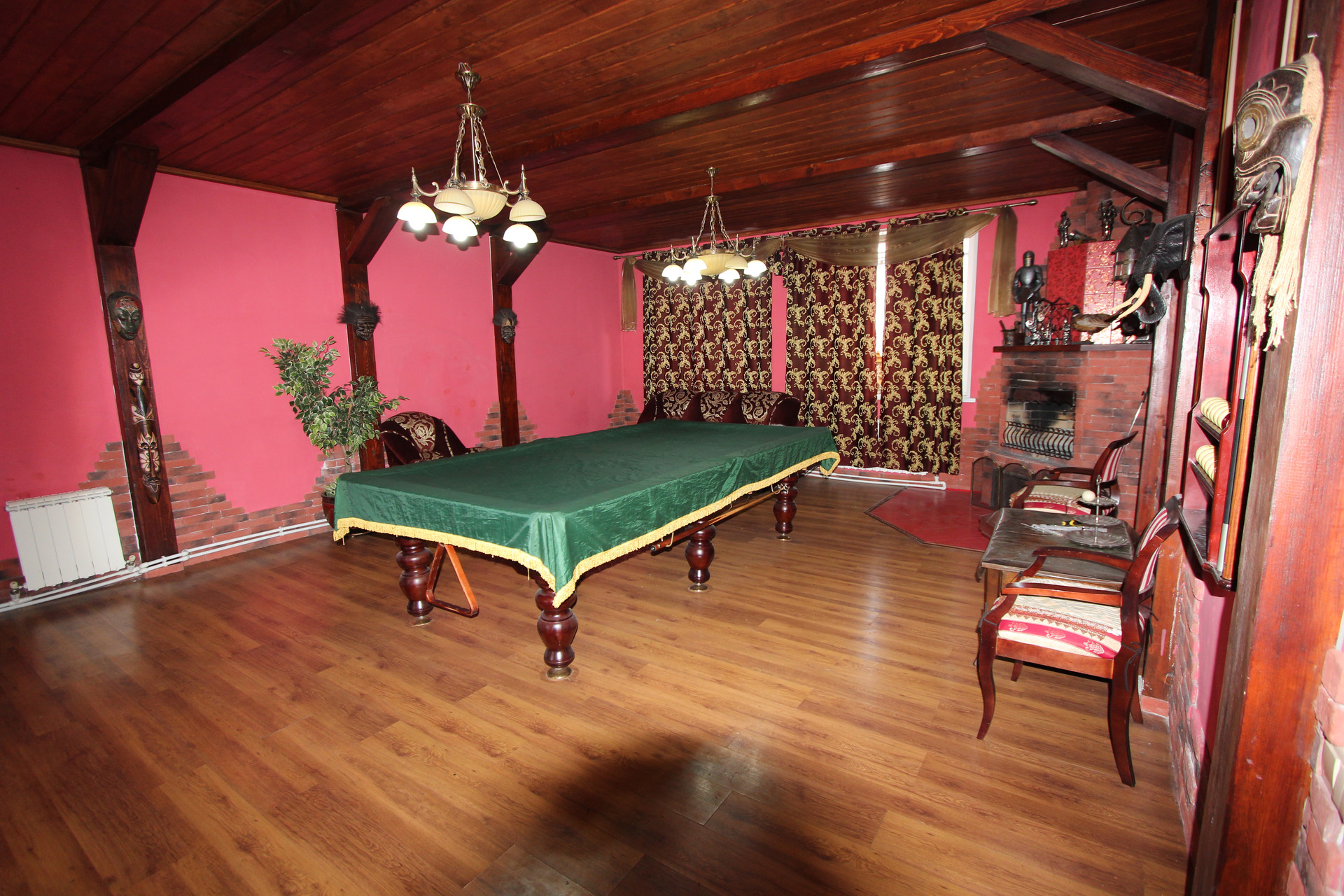 В планировке предусмотрено: просторная кухня, огромная гостиная с камином и с бильярдным столом, холл, спальные комната, бойлерная, прачечная.