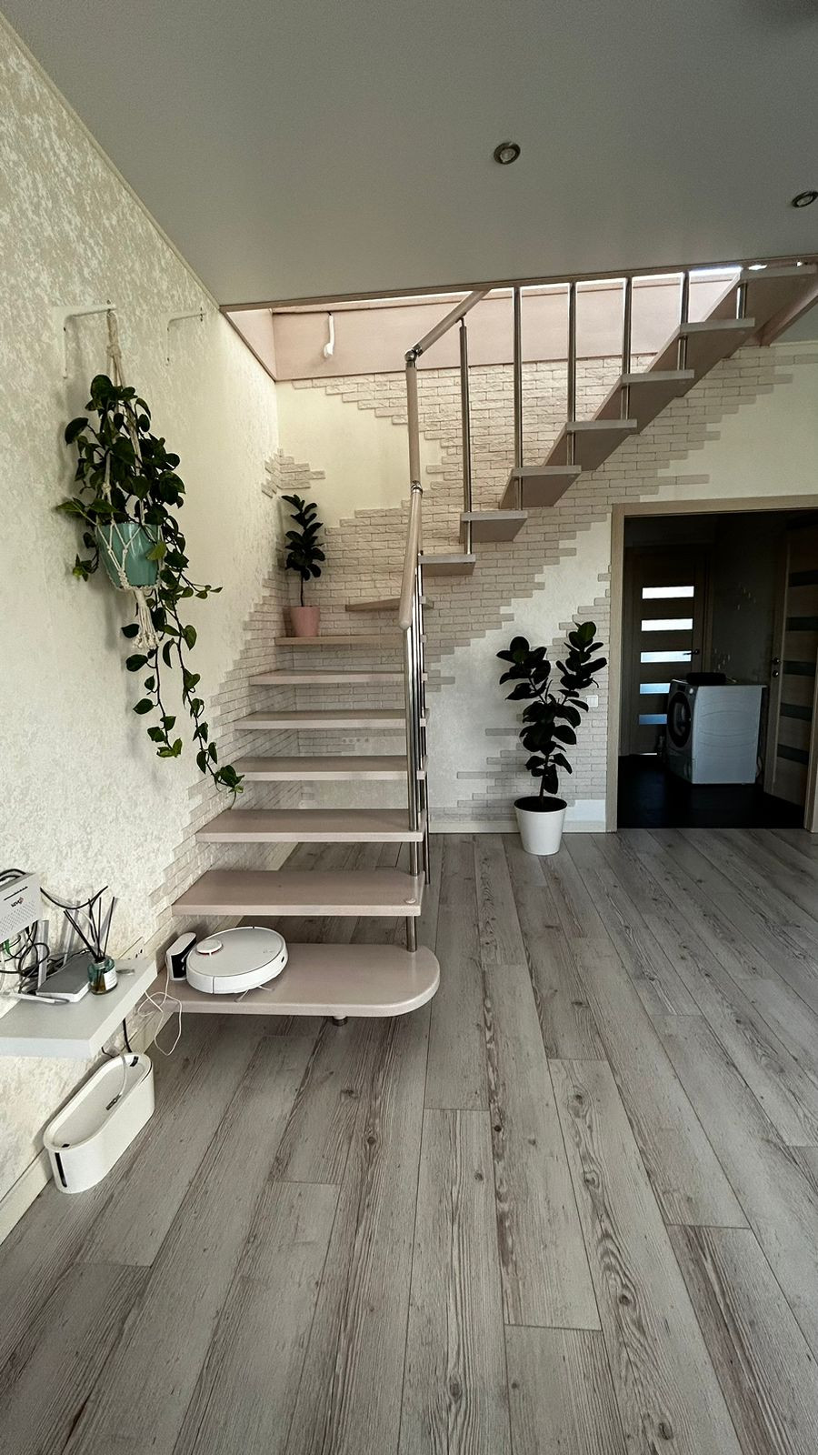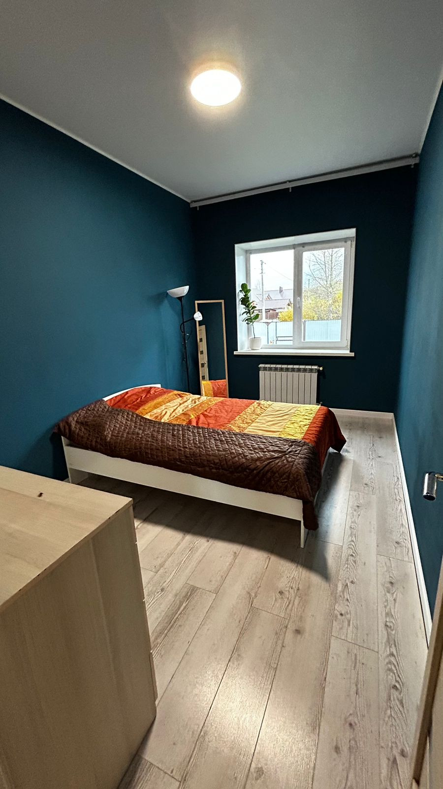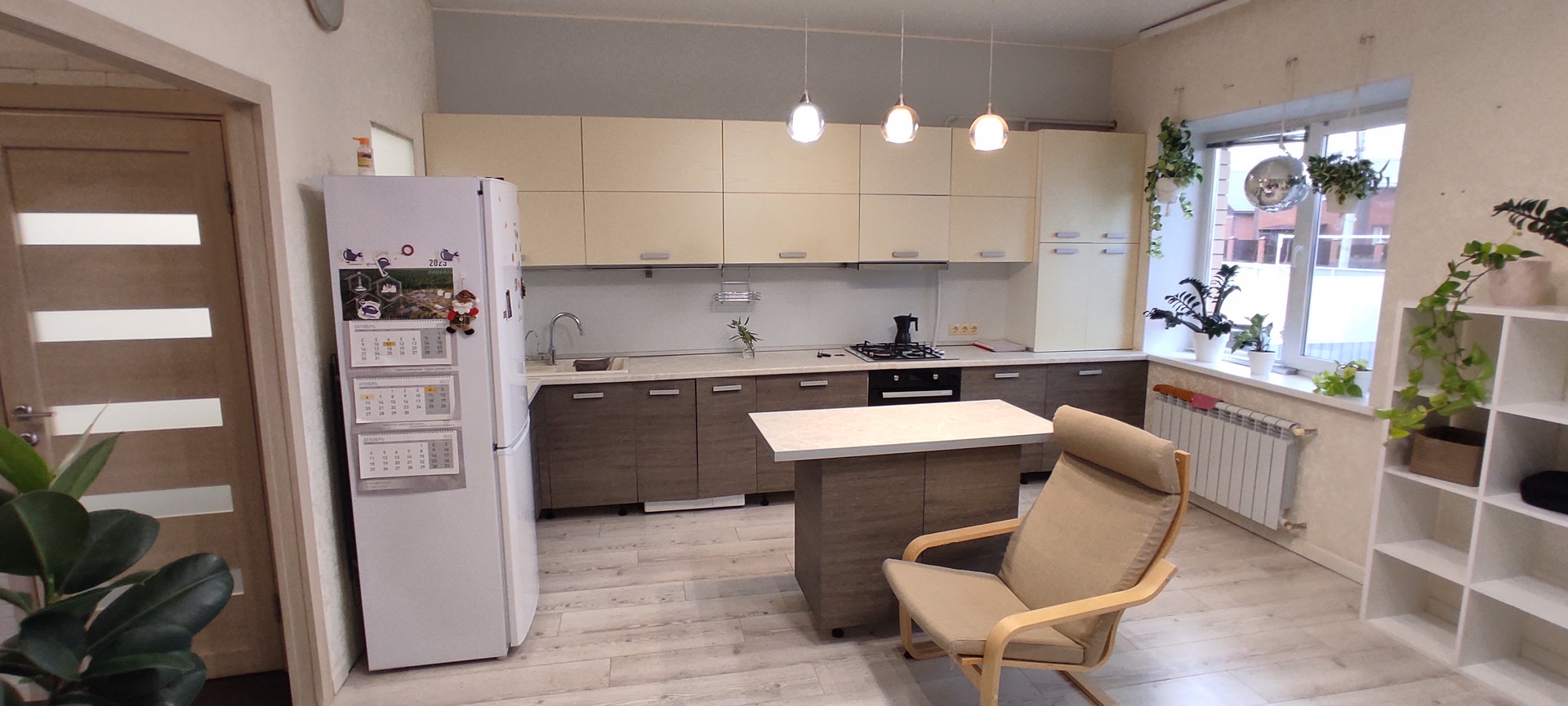 1-й этаж: кухня - гостиная, две спальни ( на полу ламинат), санузел и коридор (теплый пол, кафель), натяжной, матовый потолок.