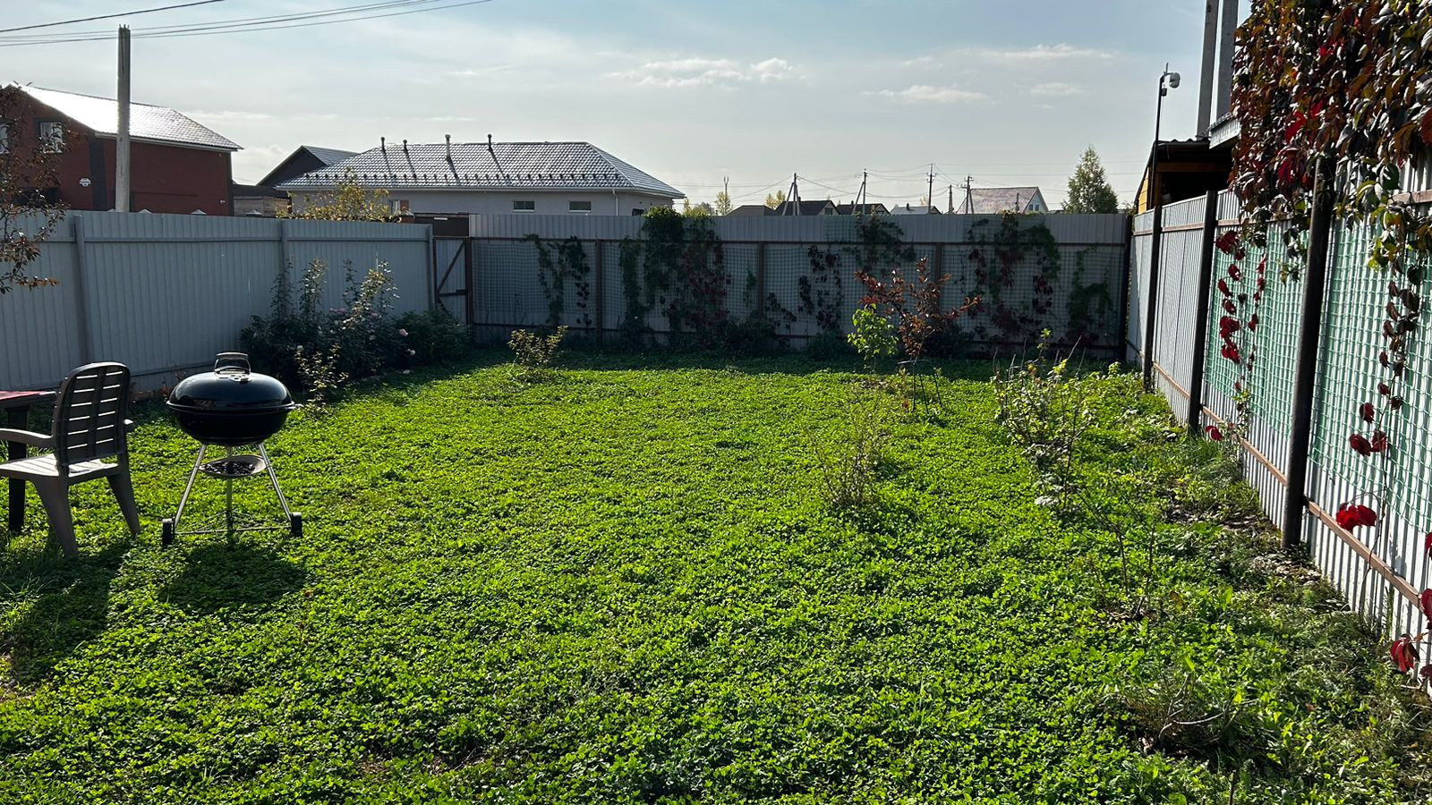 Участок огорожен забором со всех сторон, установлены распашные ворота с калиткой, с обратной стороны также есть калитка. Достаточно места , для парковки автомобиля. Газон из клевера.