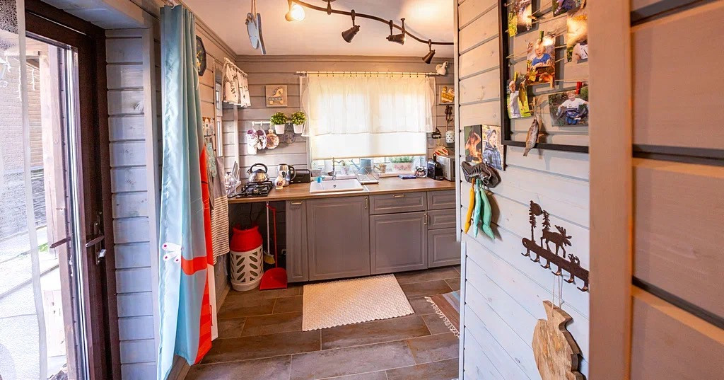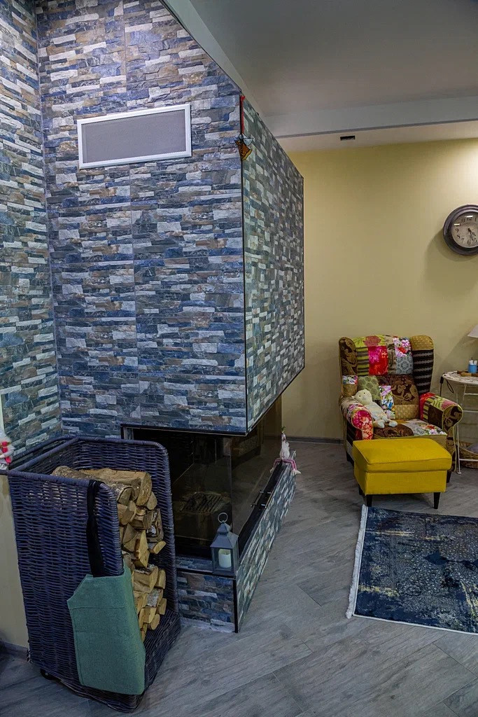 На первом этаже: кухня полностью оборудованная техникой, гостиная с камином и зоной отдыха, большая терраса с панорамными окнами .