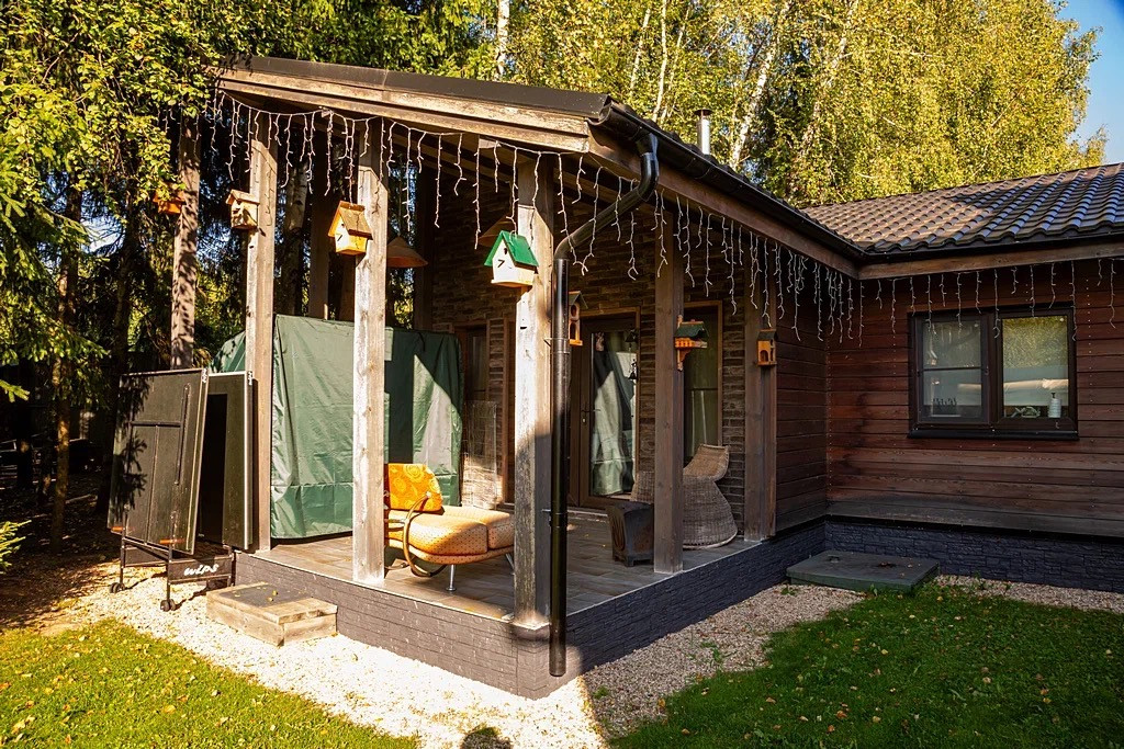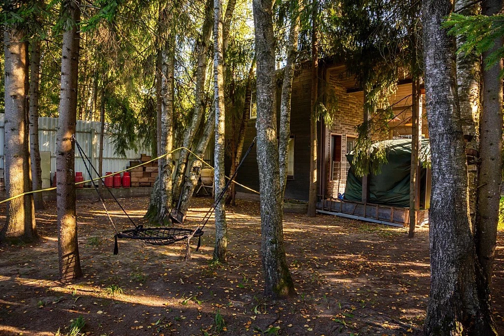 Участок прямоугольный, ухоженный, с зоной барбекью, выходом в лес.
