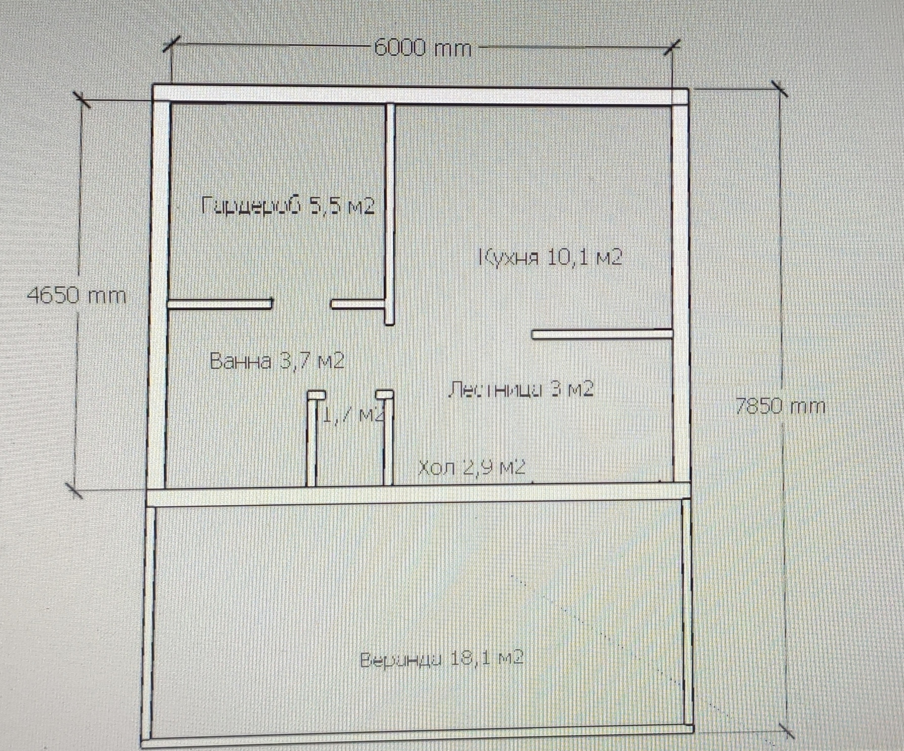 1 этаж: Веранда (18,1 м2), прихожая, тех. помещение, санузел, ванна, кухня, гардеробная.