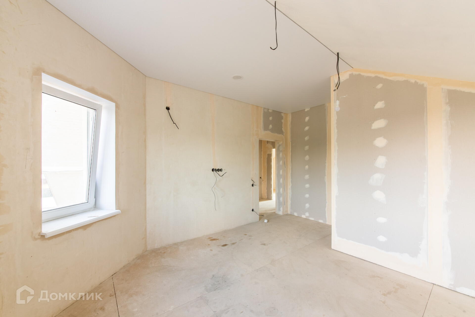 Полы: подготовлены под финишную отделку, стены оштукатурены под финишную отделку, потолки - натяжные, полная разводка электрики и сантехники.