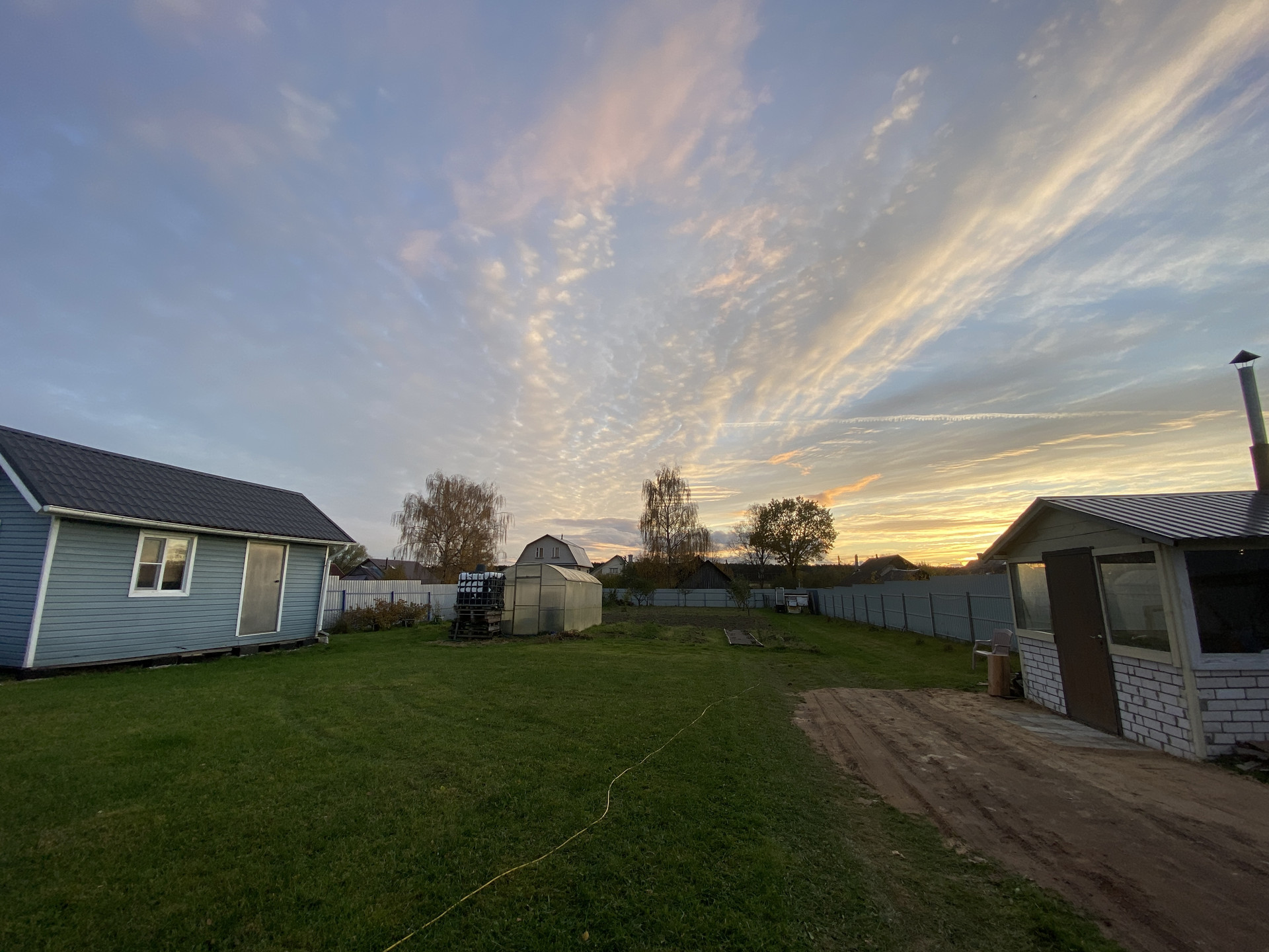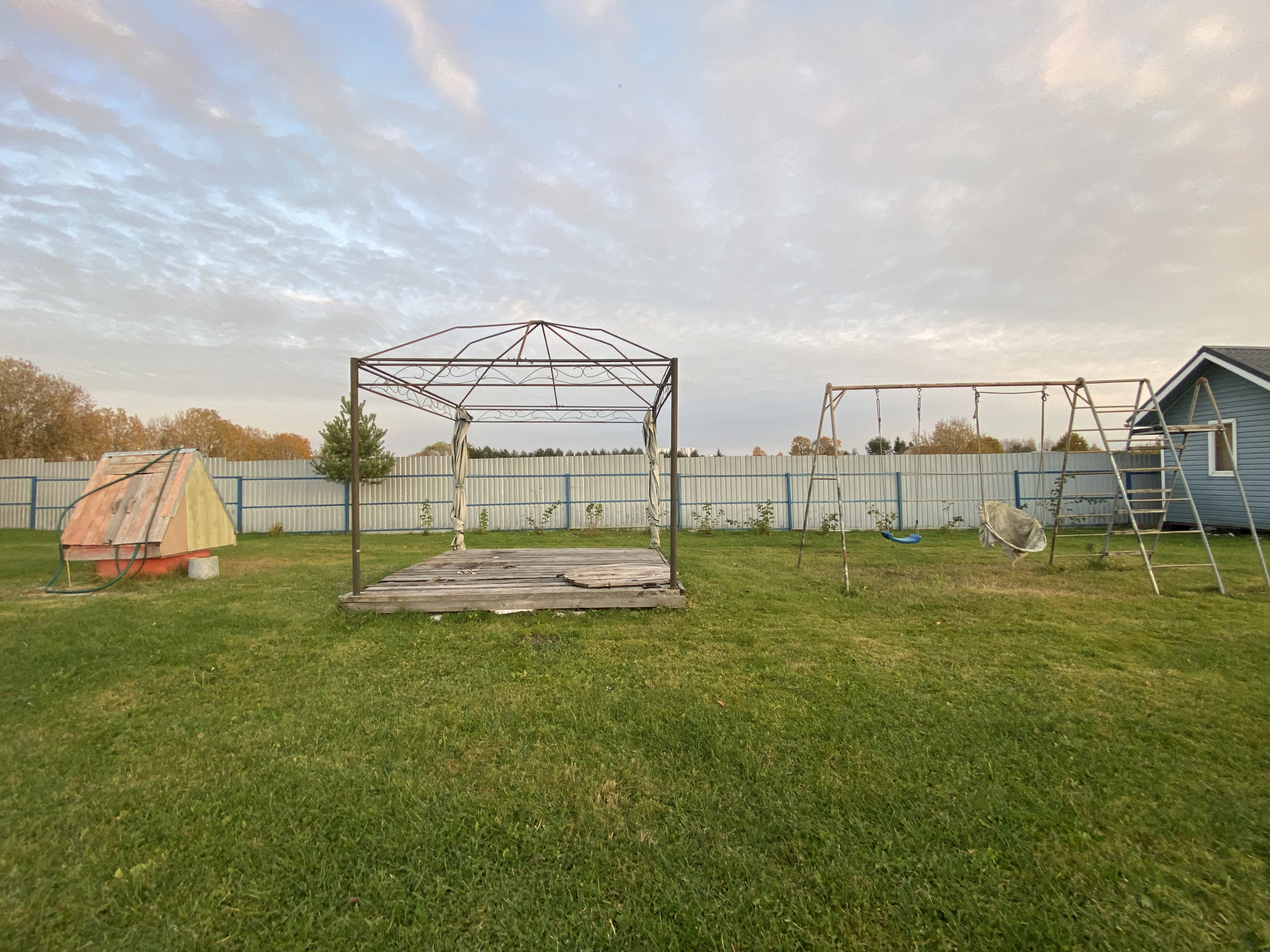 Участок поднят привозным грунтом, выровнен. Посажены молодые кустарники и сад.