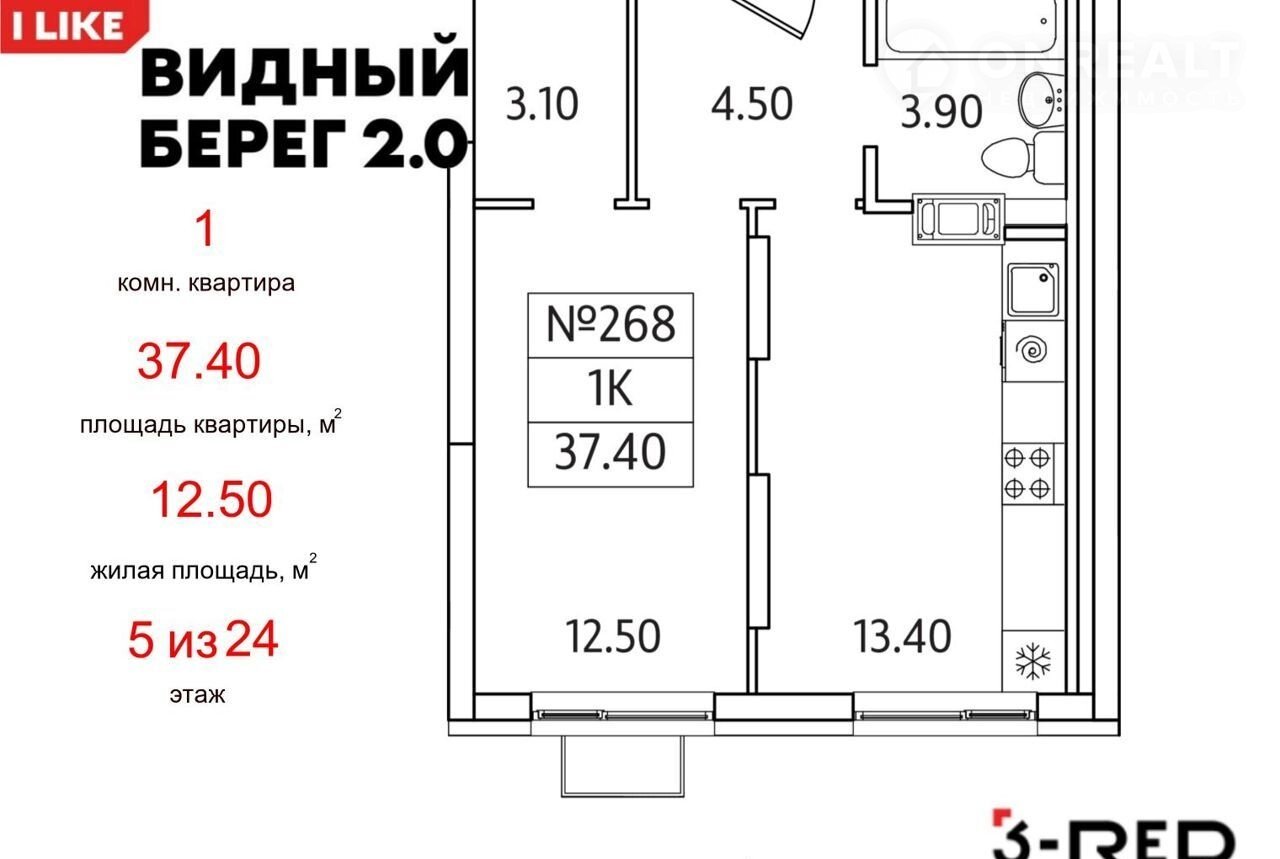 1-комнатная квартира, 37.4 м2, этаж 5 / 24, на продажу в деревне Сапроново