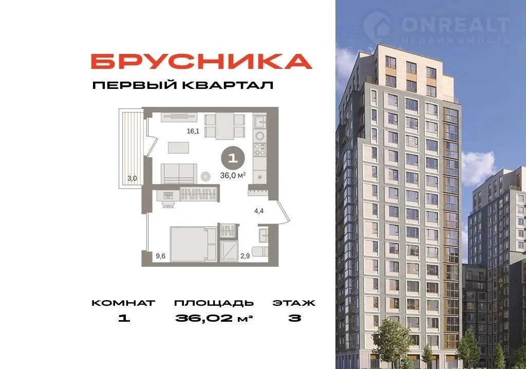 1-комнатная квартира, 36 м2, этаж 3 / 9, на продажу в деревне Сапроново, Калиновая улица, 9