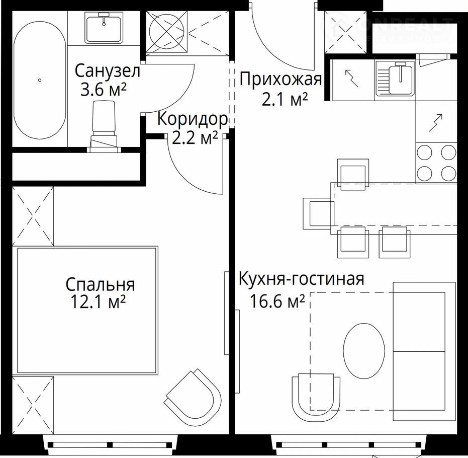 Общая площадь 36.6 м2