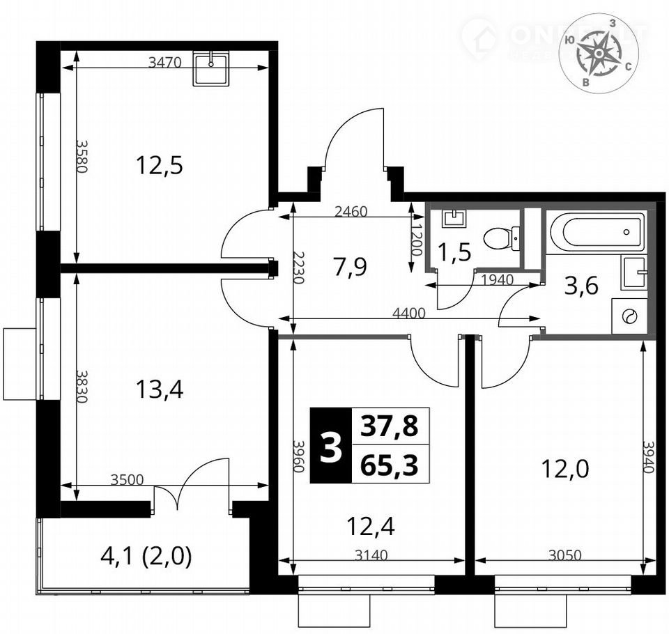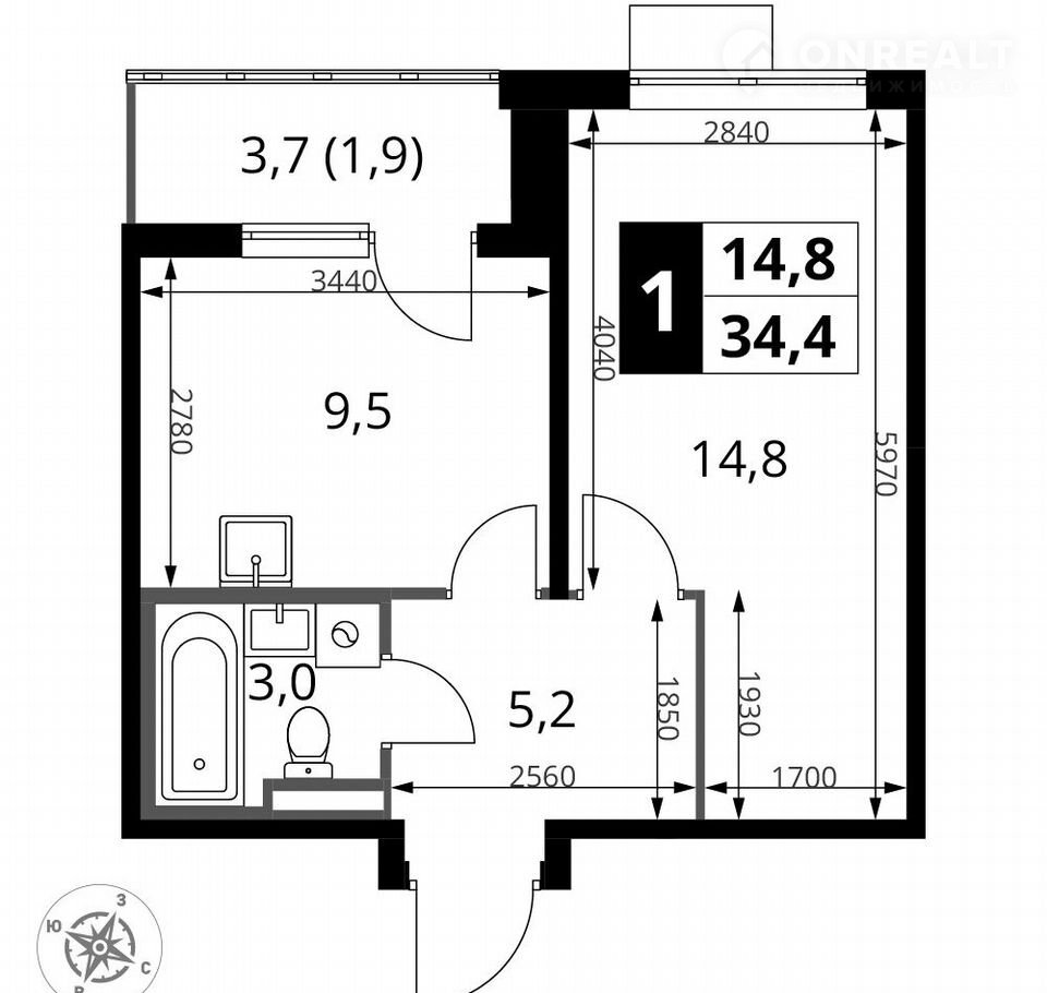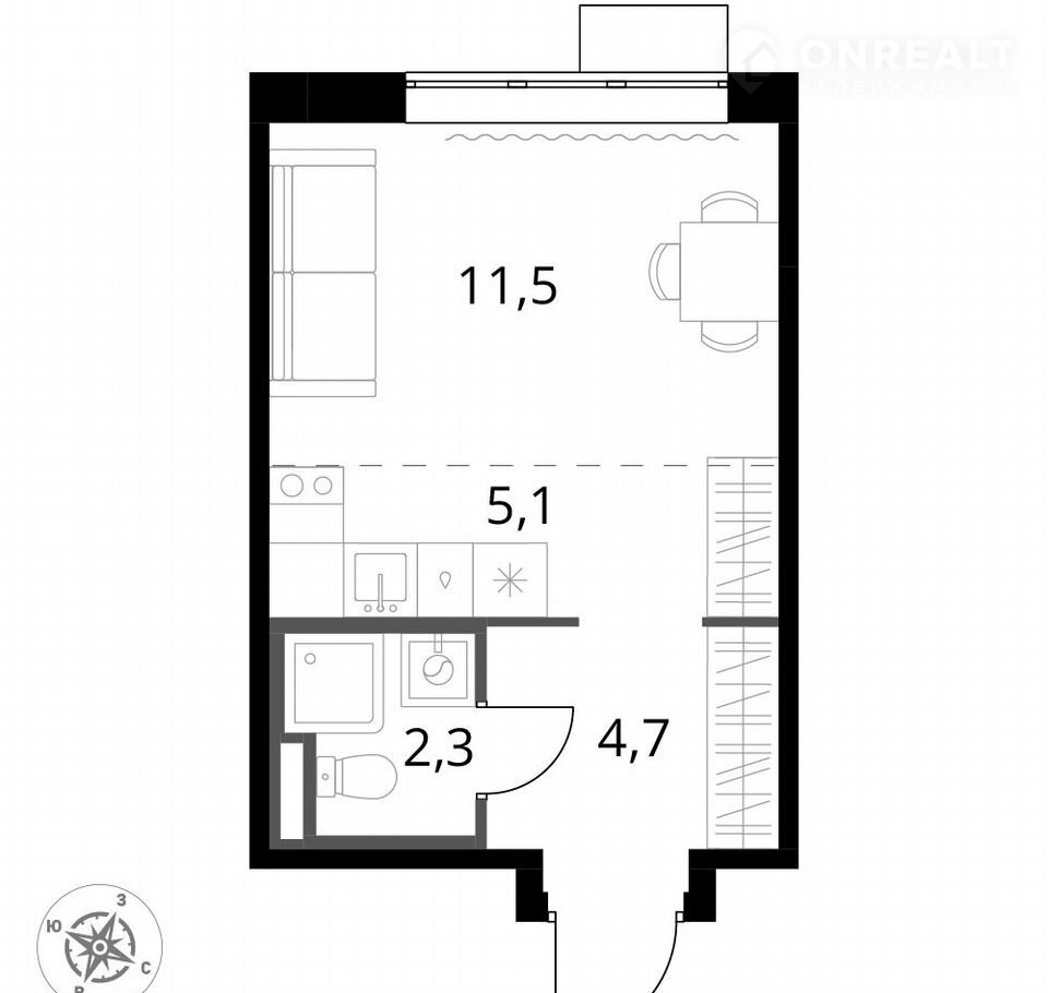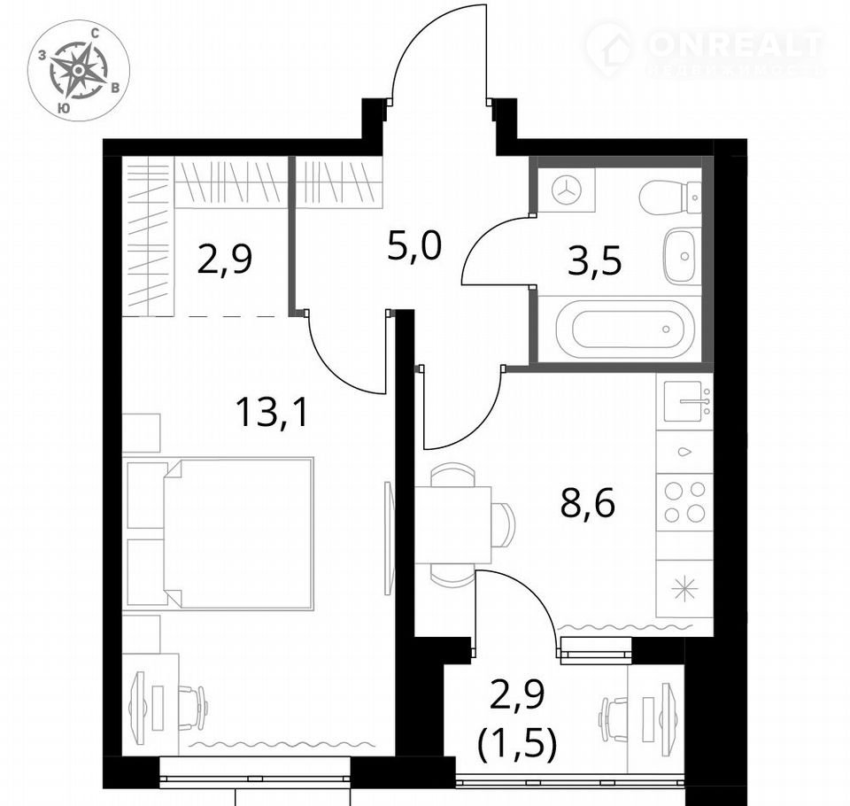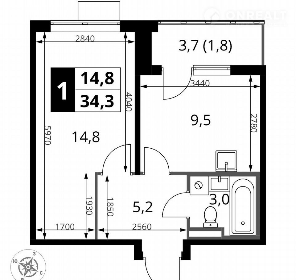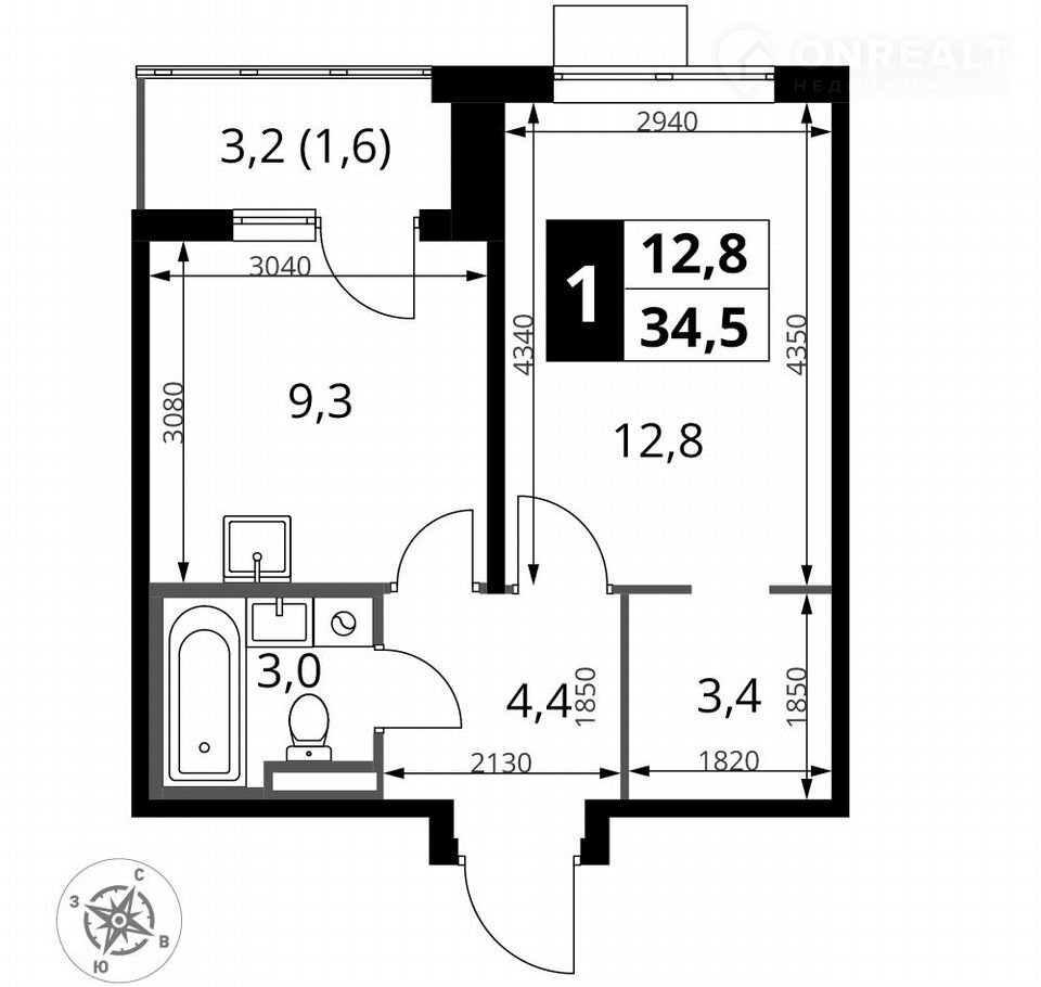 Общая площадь 34.5 м2