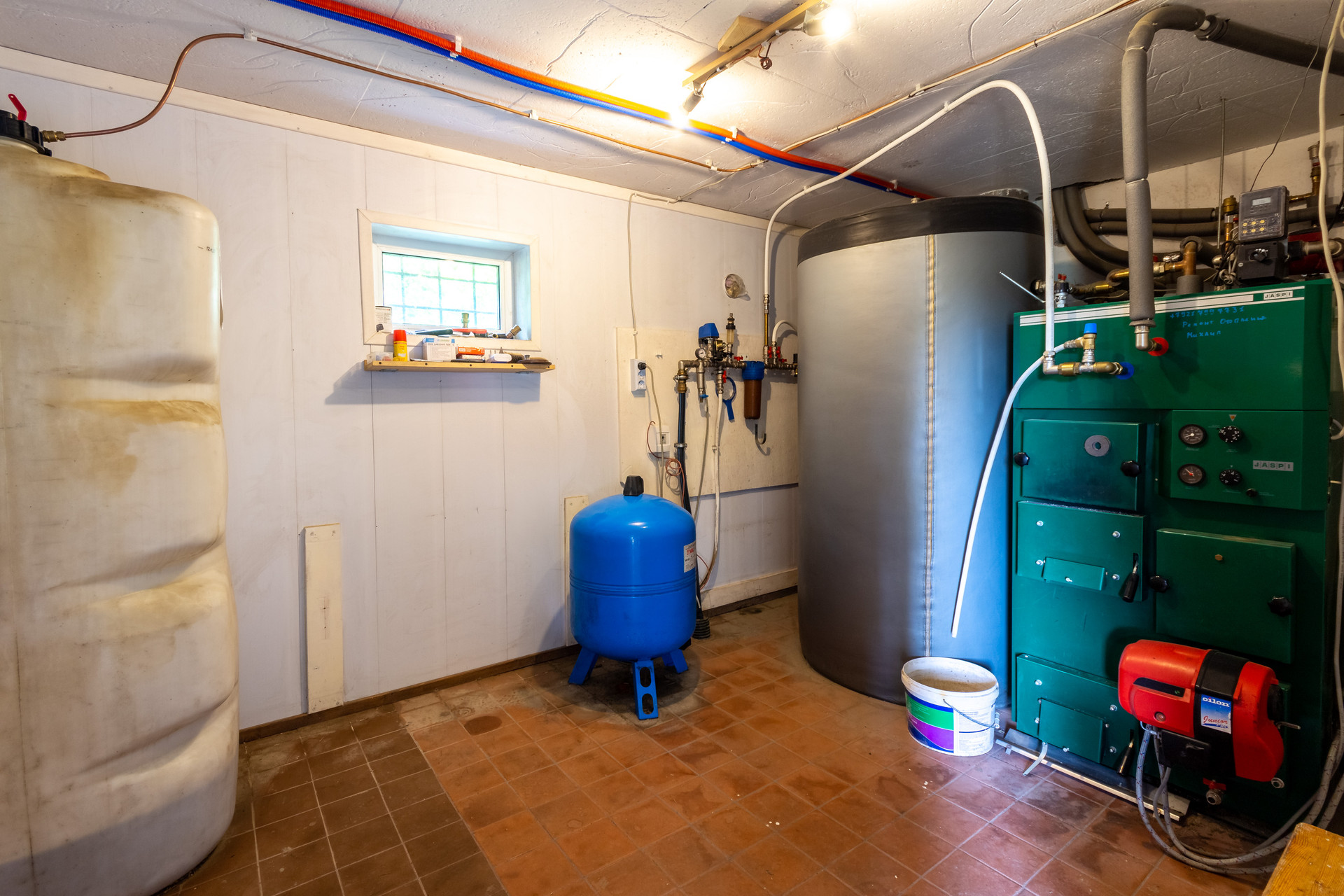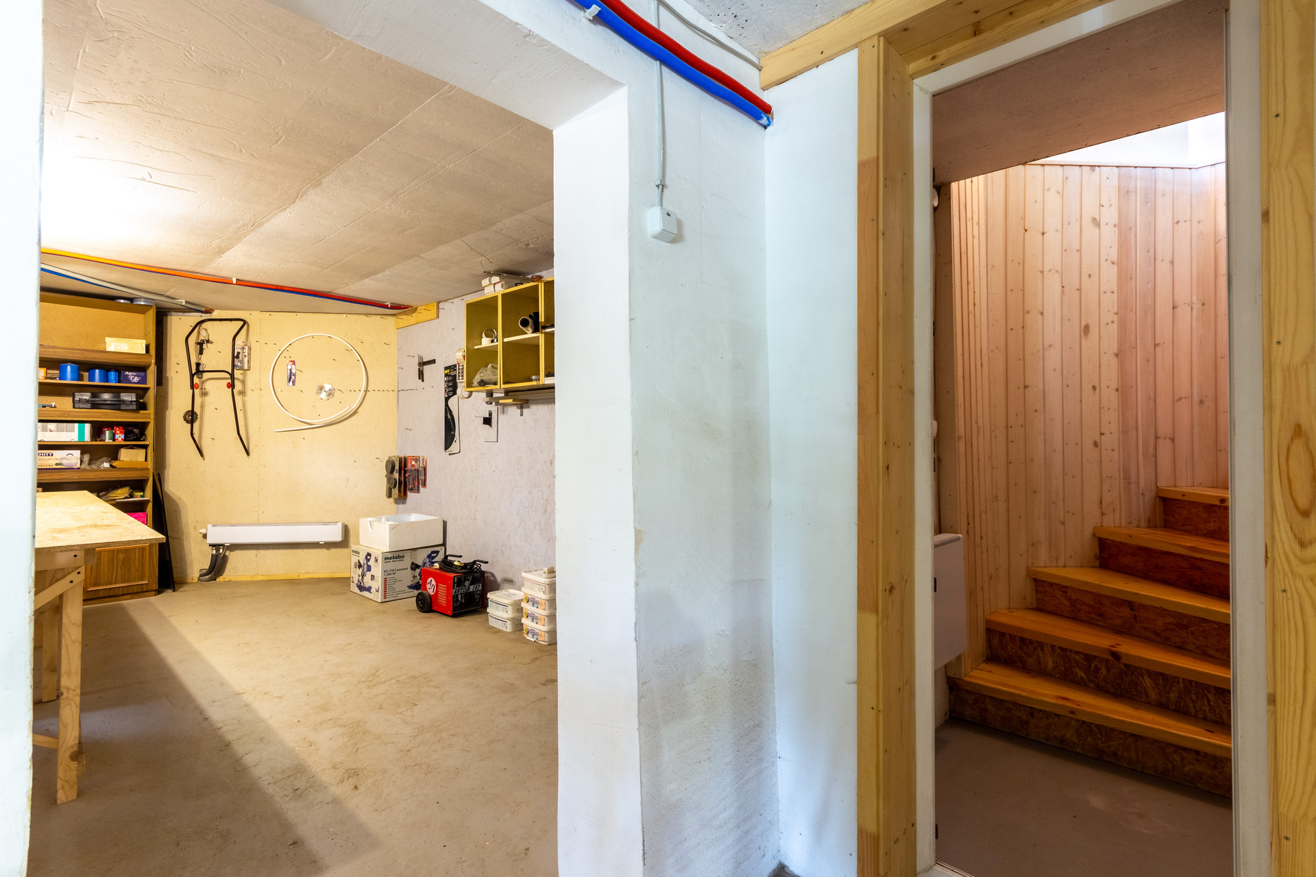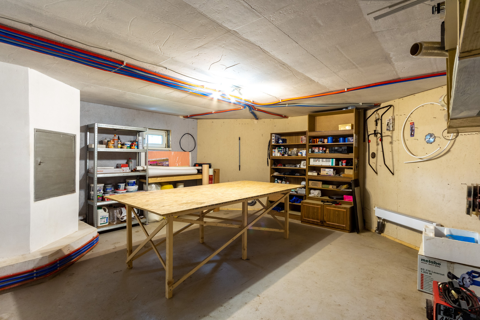 В цокольном этаже находится большая мастерская, котельная, кладовая под лестницей и гараж с подъёмными секционными воротами.