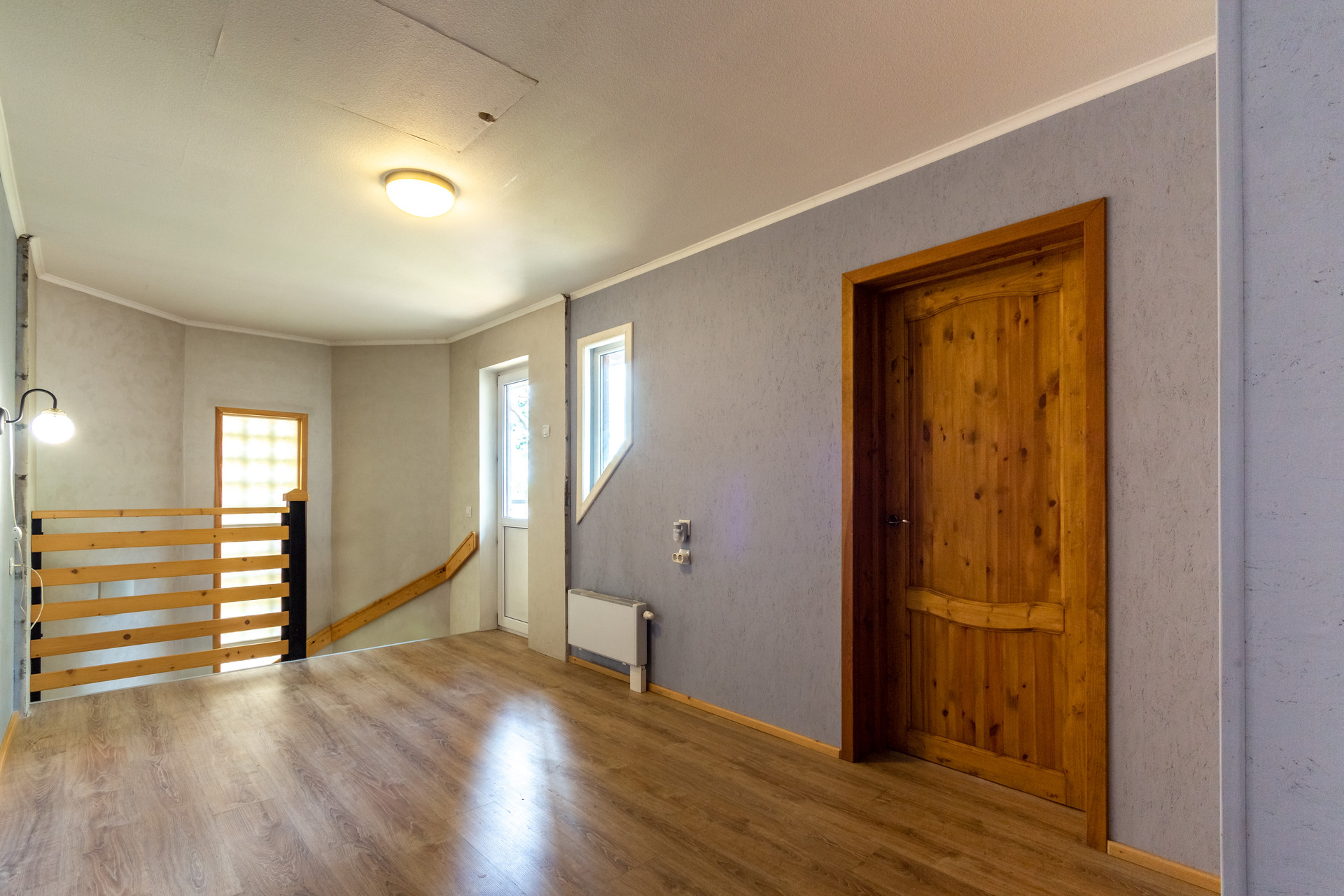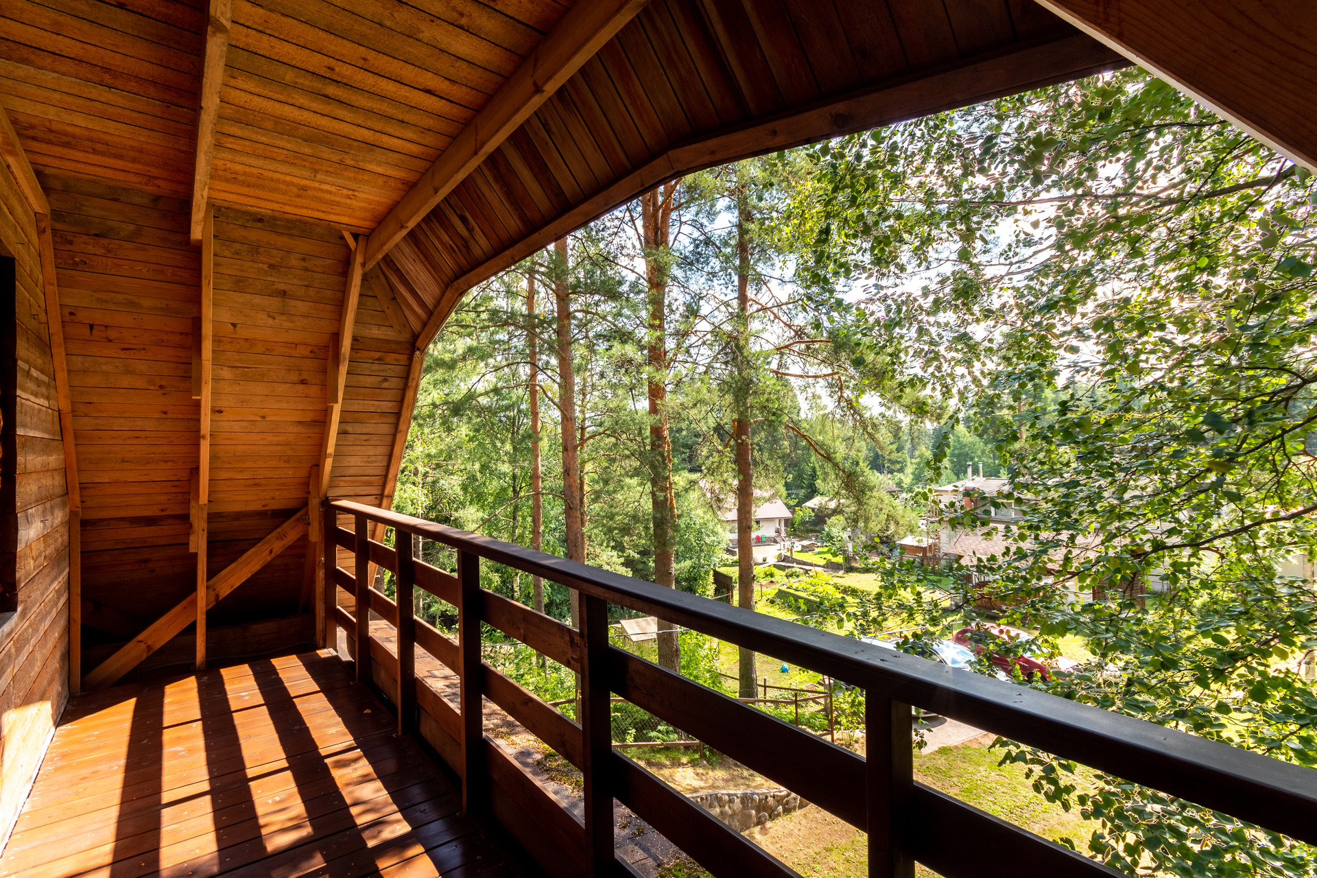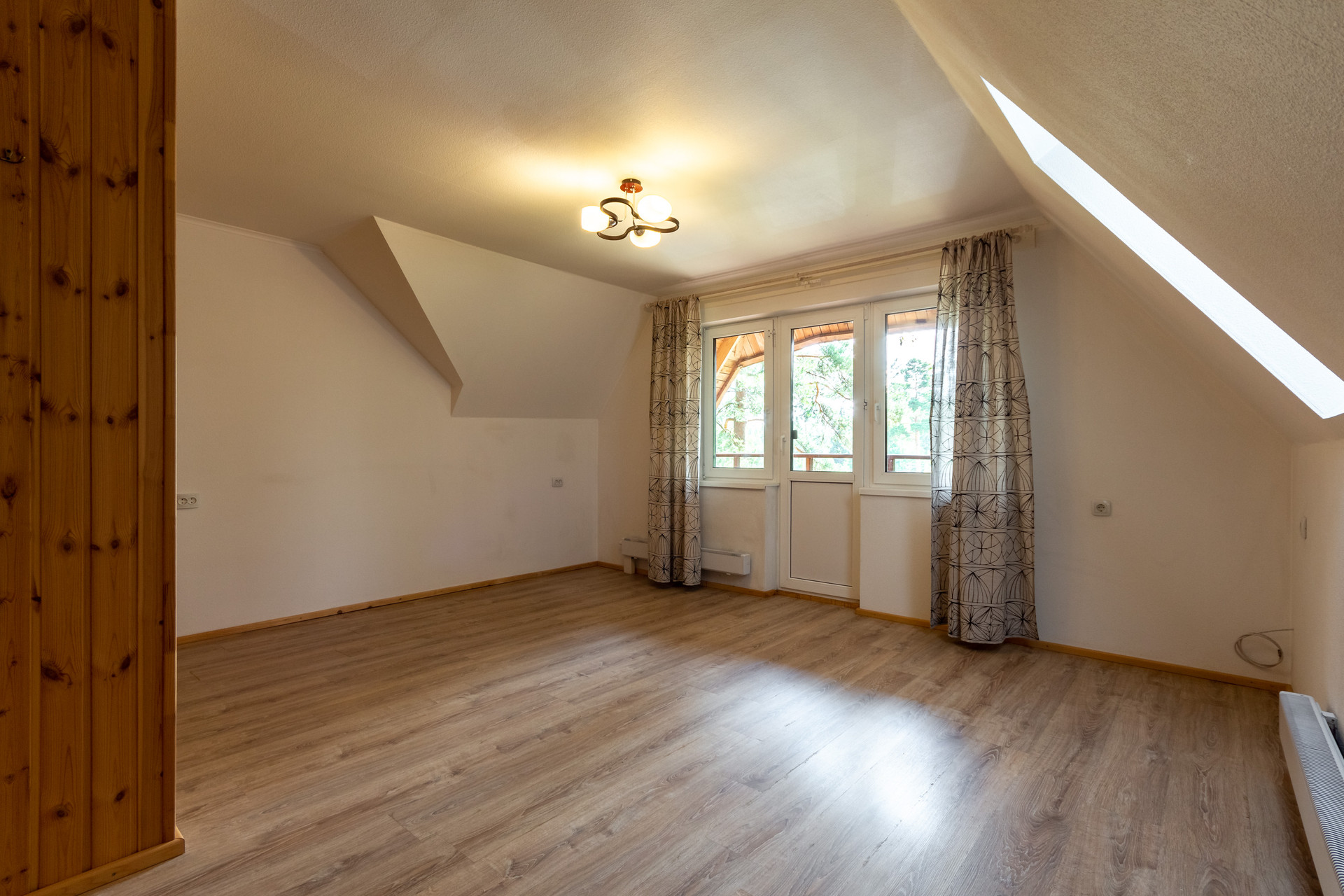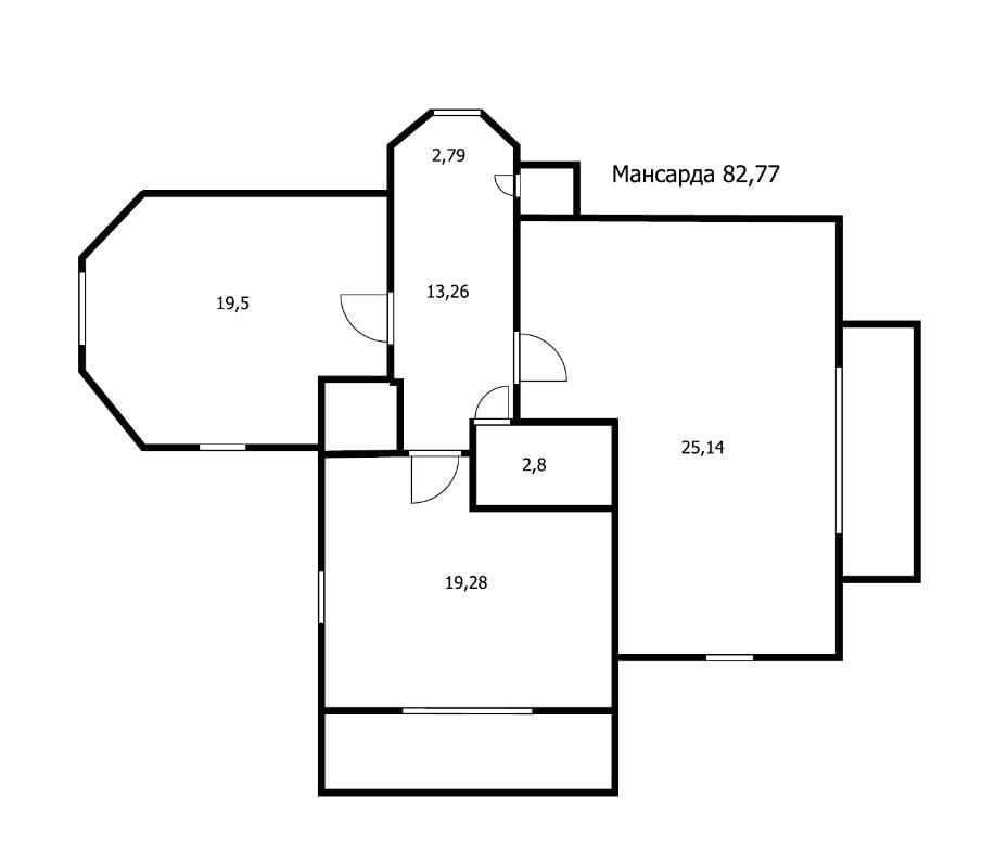 Комфортная лестница ведет на 2-ой этаж, где расположены три спальни: 19.5 кв м + 19.28 кв м + 25.14 кв м. 2 спальни с балконами с красивыми видами на зеленый участок. Есть туалетная комната, которую можно немного расширить и установить душевую кабину. Так же есть чердак, на котором можно устроить чилл-зону.