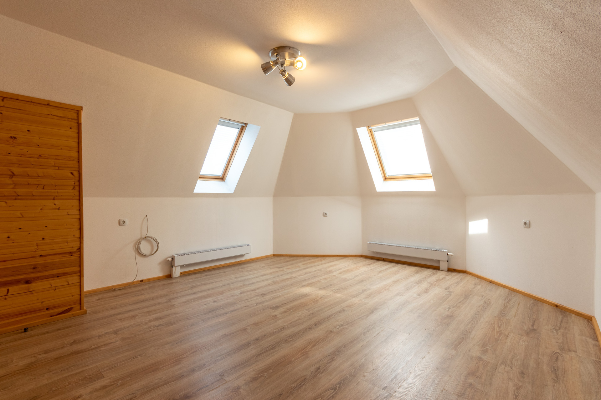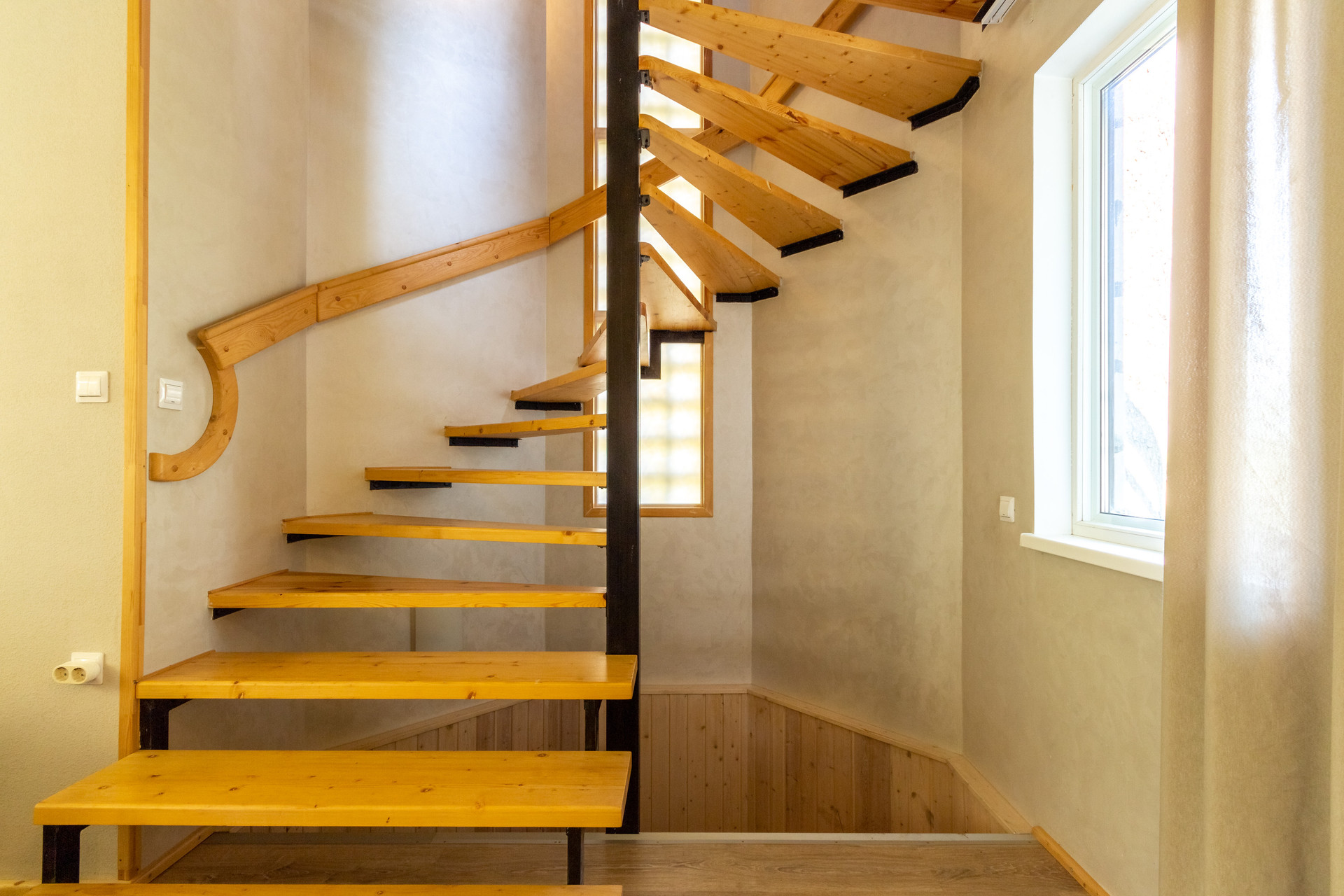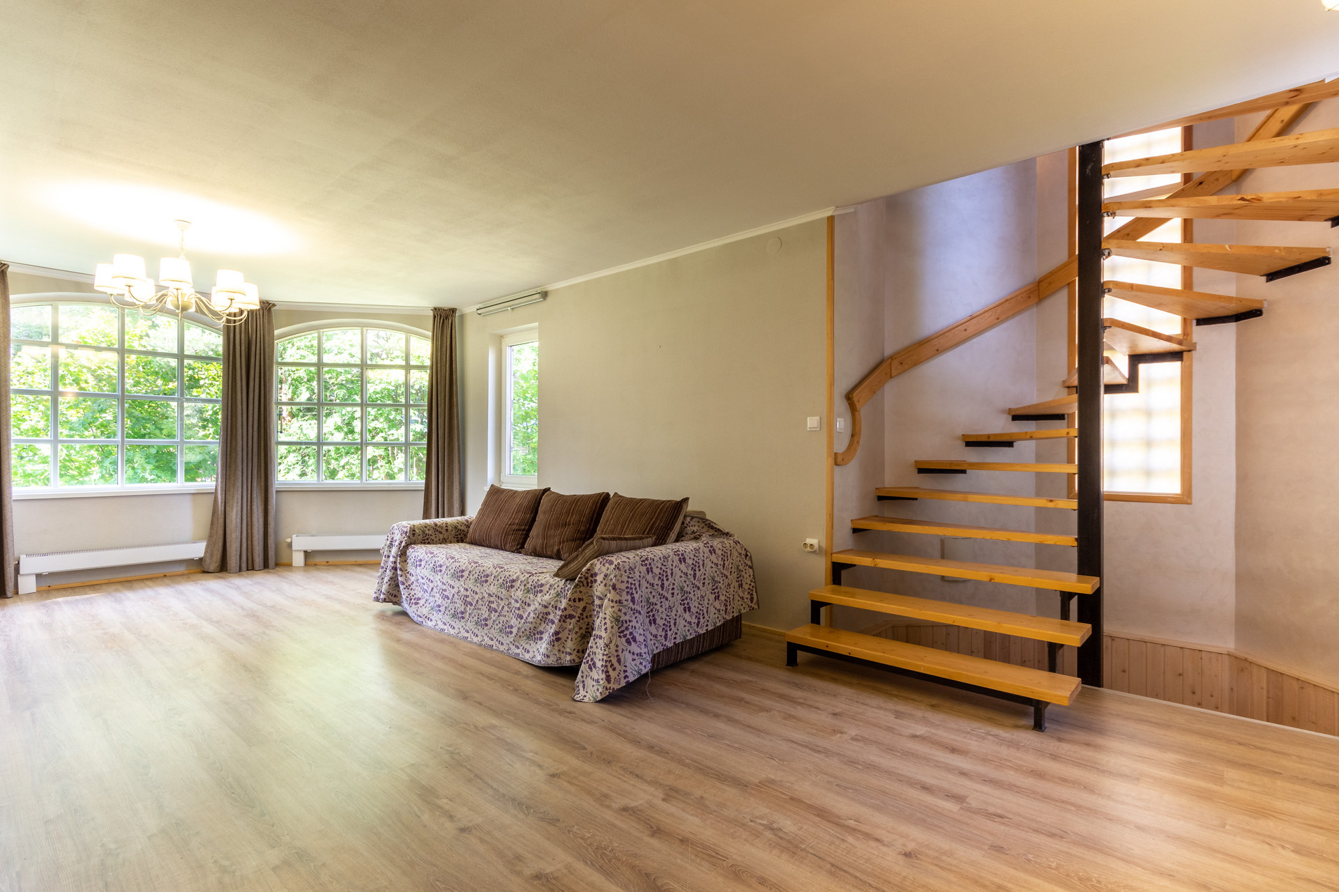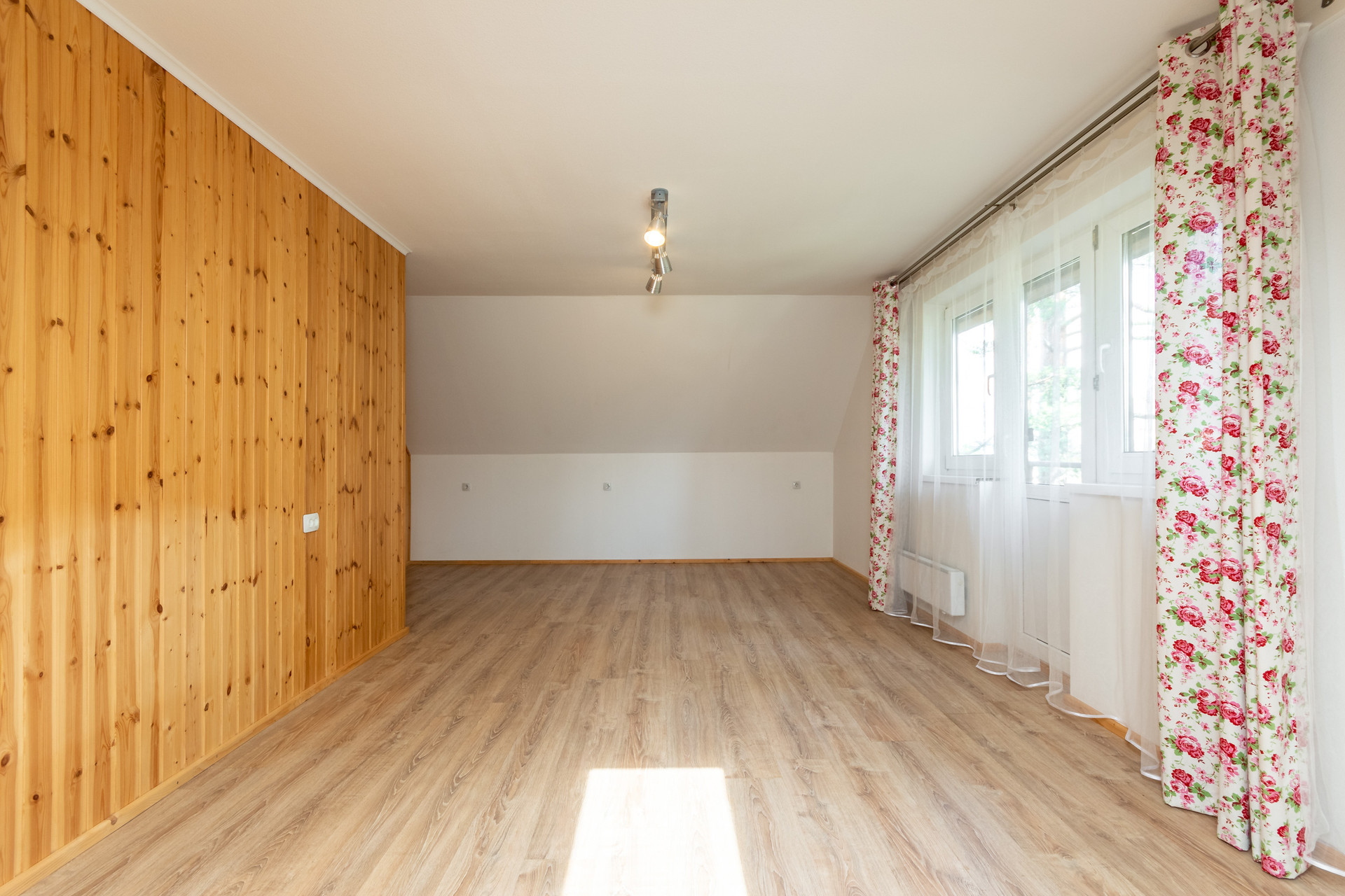 Комфортная лестница ведет на 2-ой этаж, где расположены три спальни: 19.5 кв м + 19.28 кв м + 25.14 кв м. 2 спальни с балконами с красивыми видами на зеленый участок. Есть туалетная комната, которую можно немного расширить и установить душевую кабину. Так же есть чердак, на котором можно устроить чилл-зону.