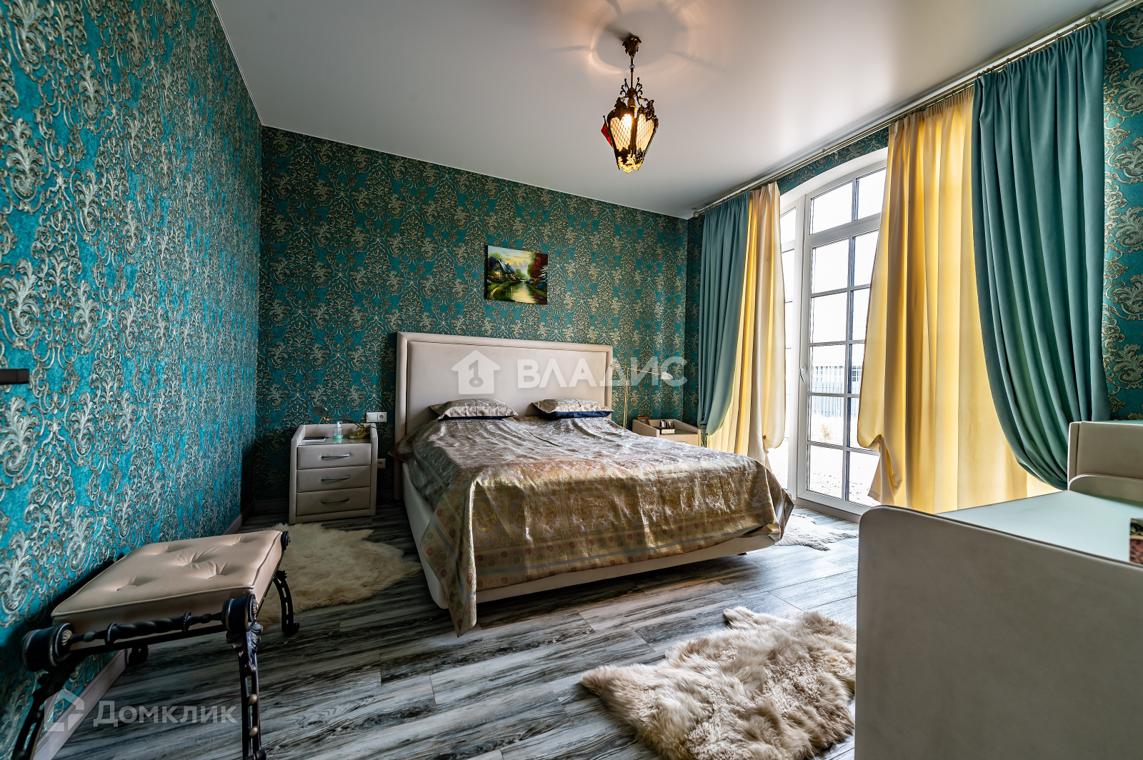 Во всем доме большие витражные окна. Из кухни есть выход на террасу. В гостиной - настоящий камин.
