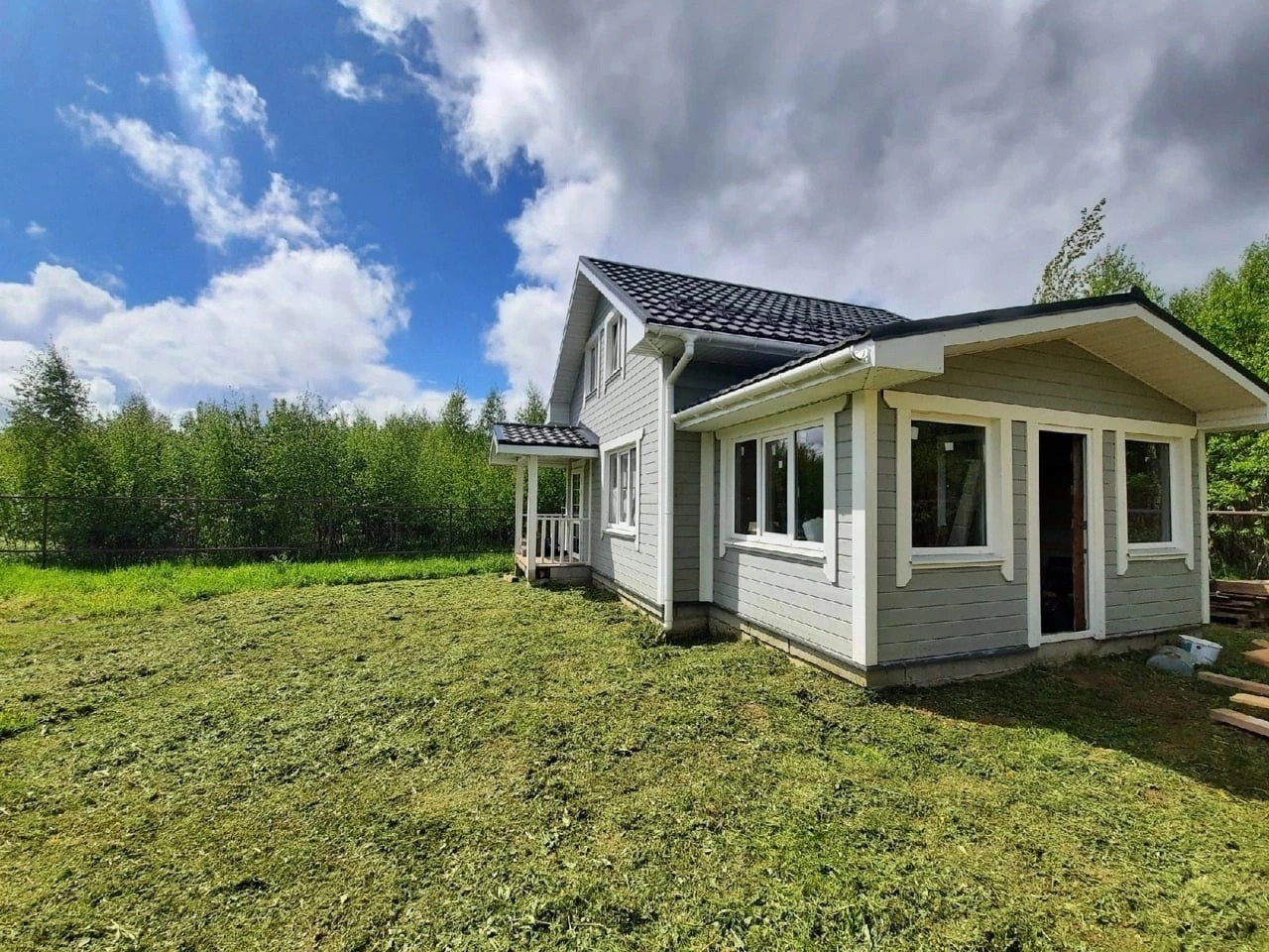 Дом новый без чистовой отделки. Дом каркасный, с наружи отделан имитацией бруса и покрашен. Крыша металлочерепица, фундамент железобетонный монолит, лента на сваях.