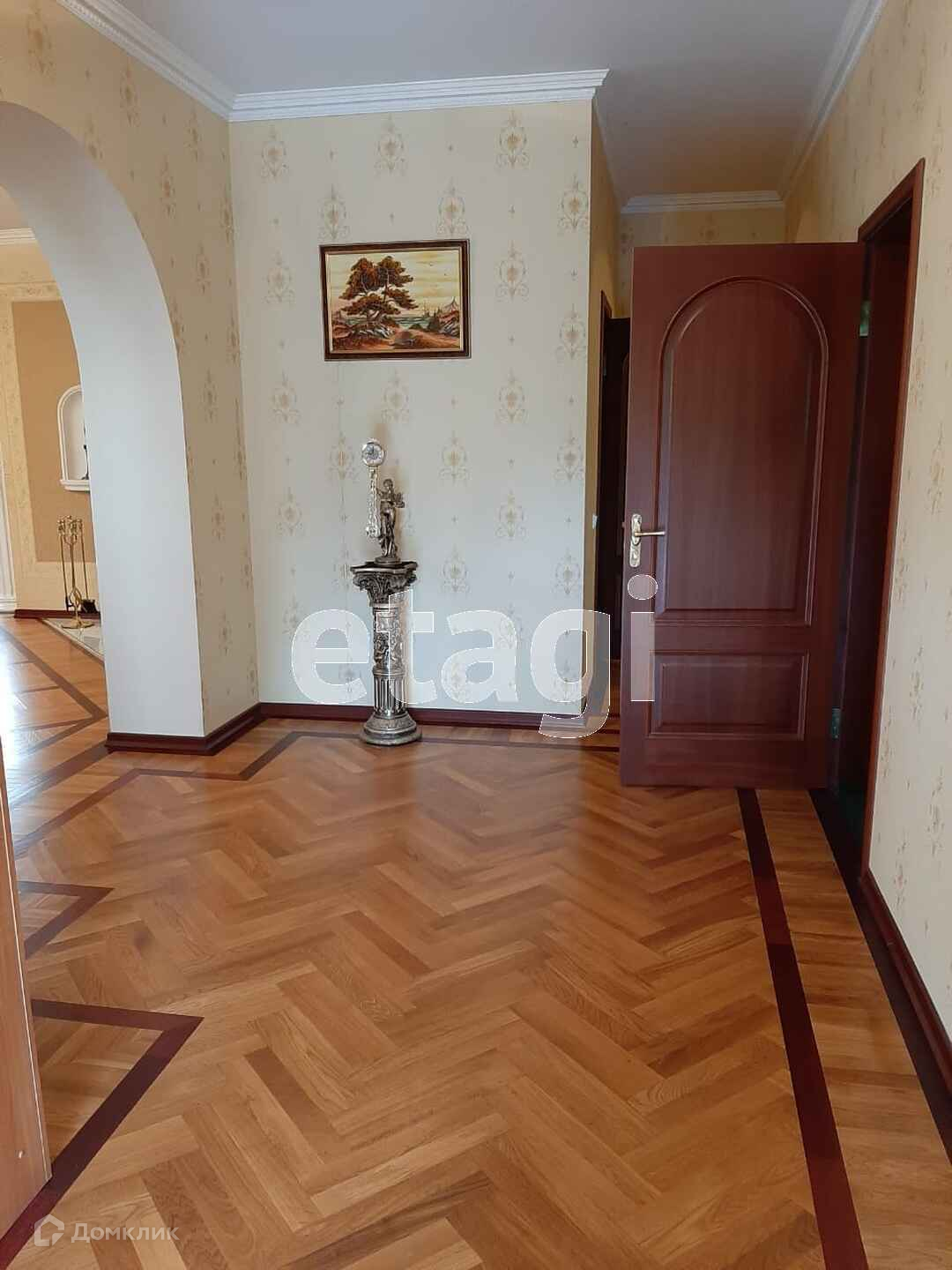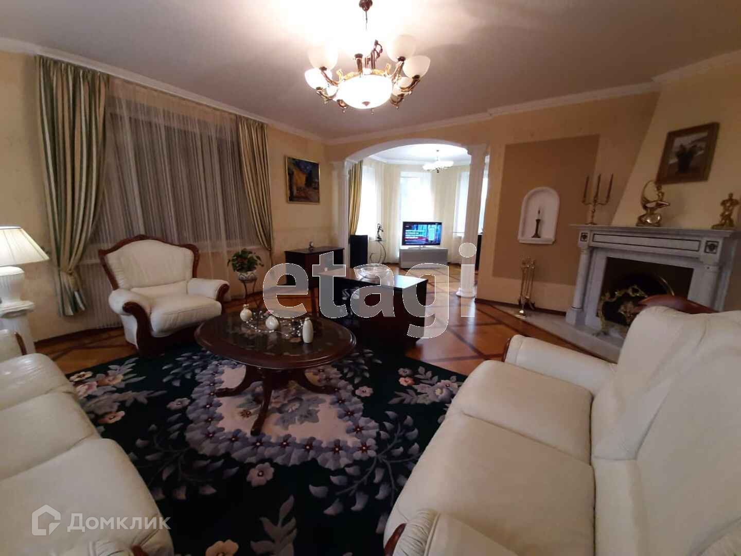 На первом этаже гостиная переходящая в столовую, а столовая переходит в уютную кухню, и все это по кругу вокруг красивого дизайнерского камина.