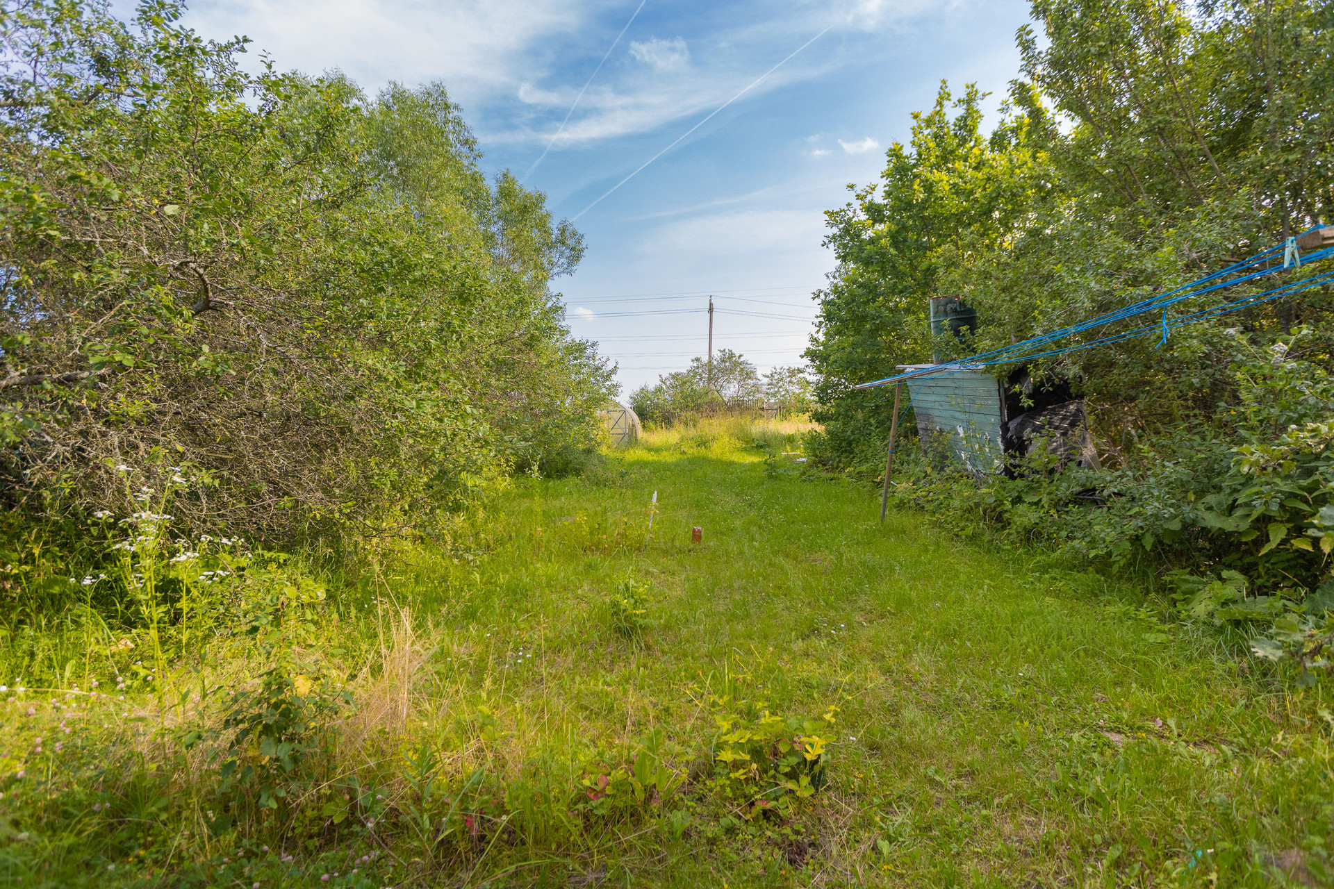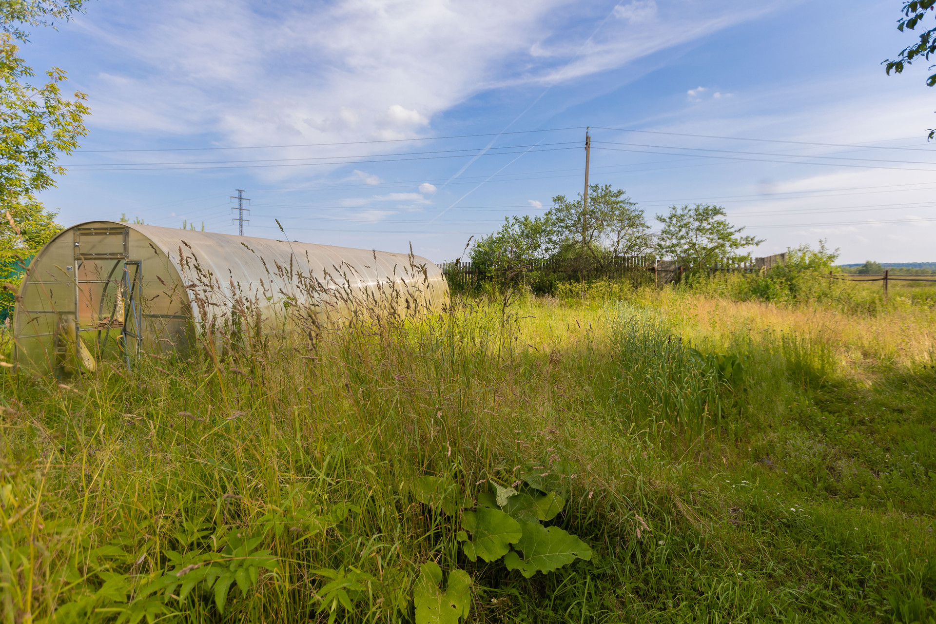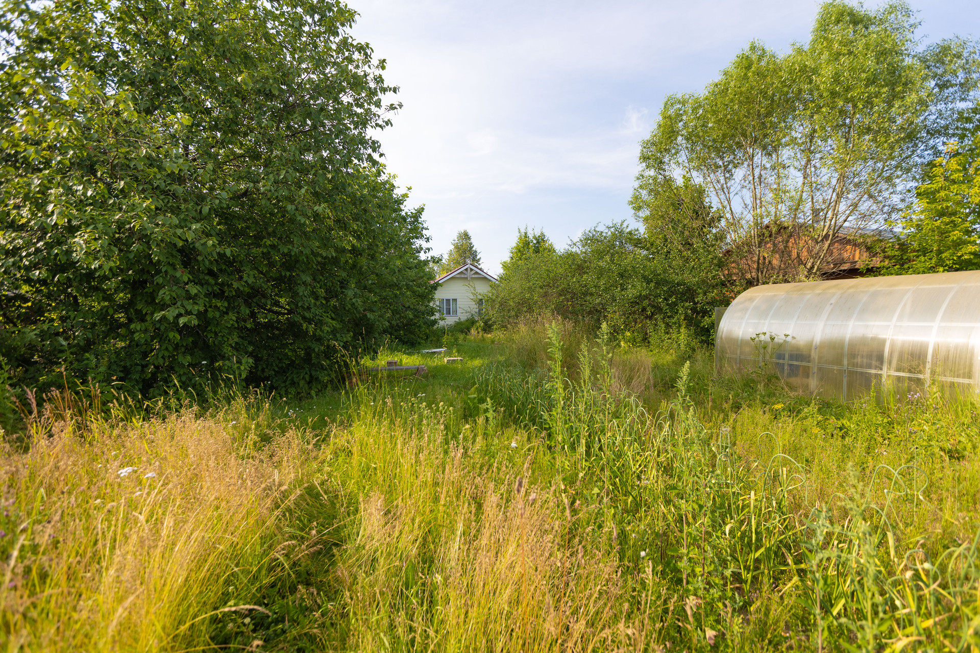 На участке теплица. Растут плодоносящие деревья и кустарники.