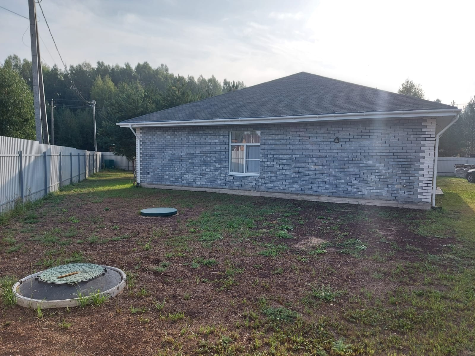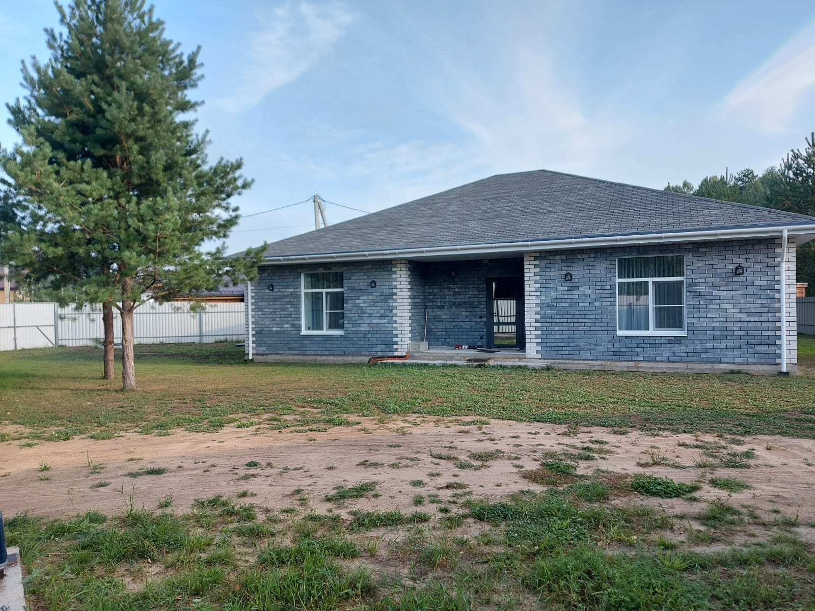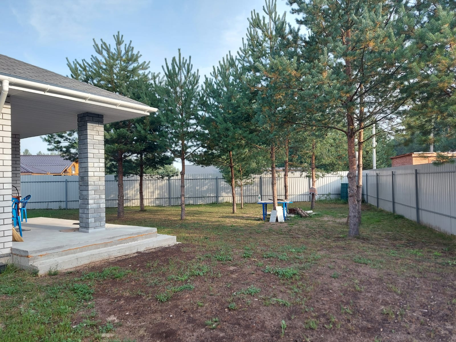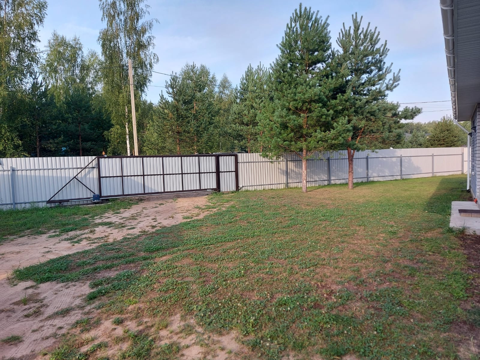 Участок высокий, ровный. Посажены сосны. На участке гараж 7*7 м. +3 м. навес. Установлен забор с откатными воротами.