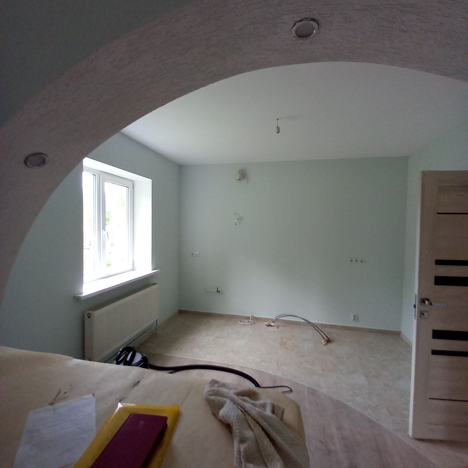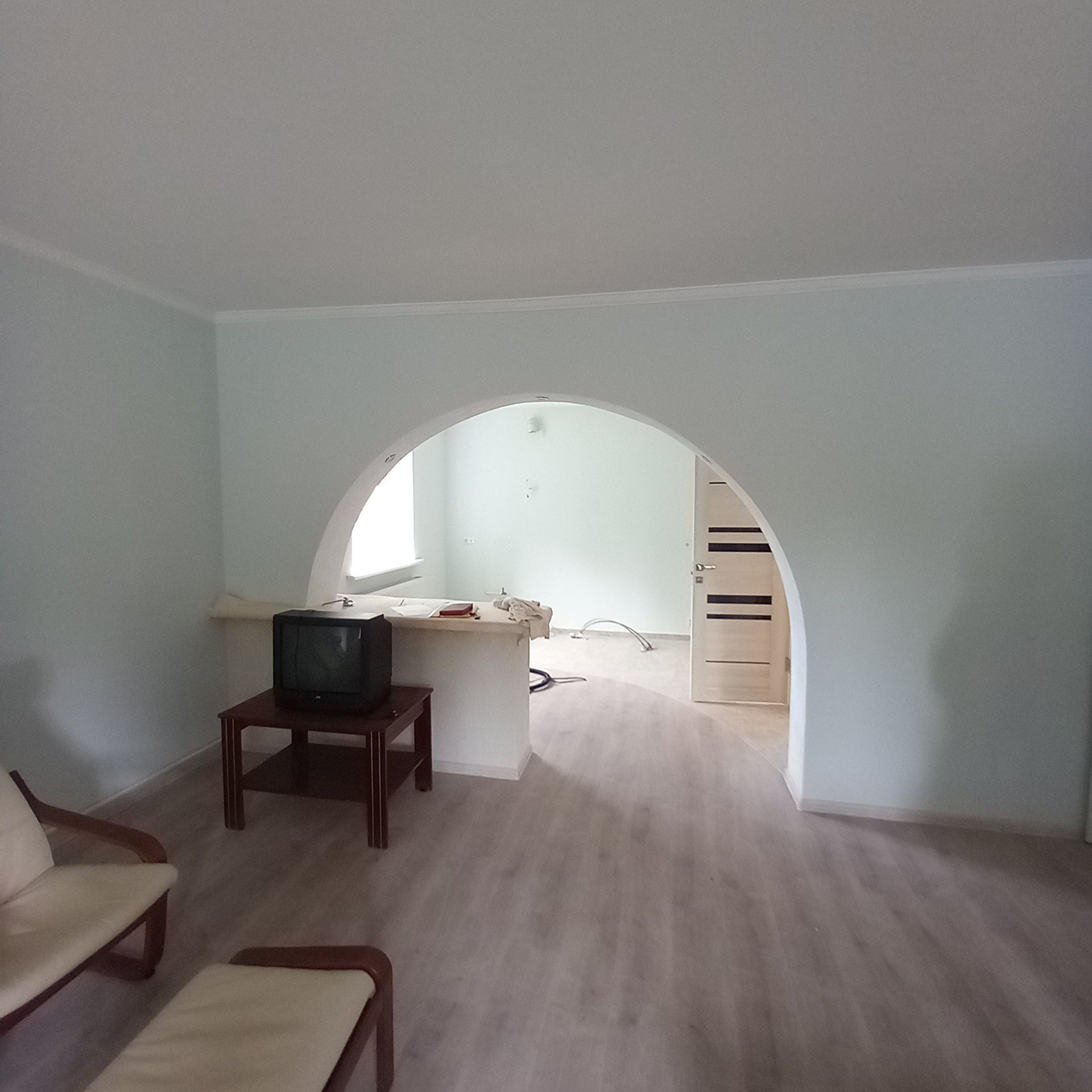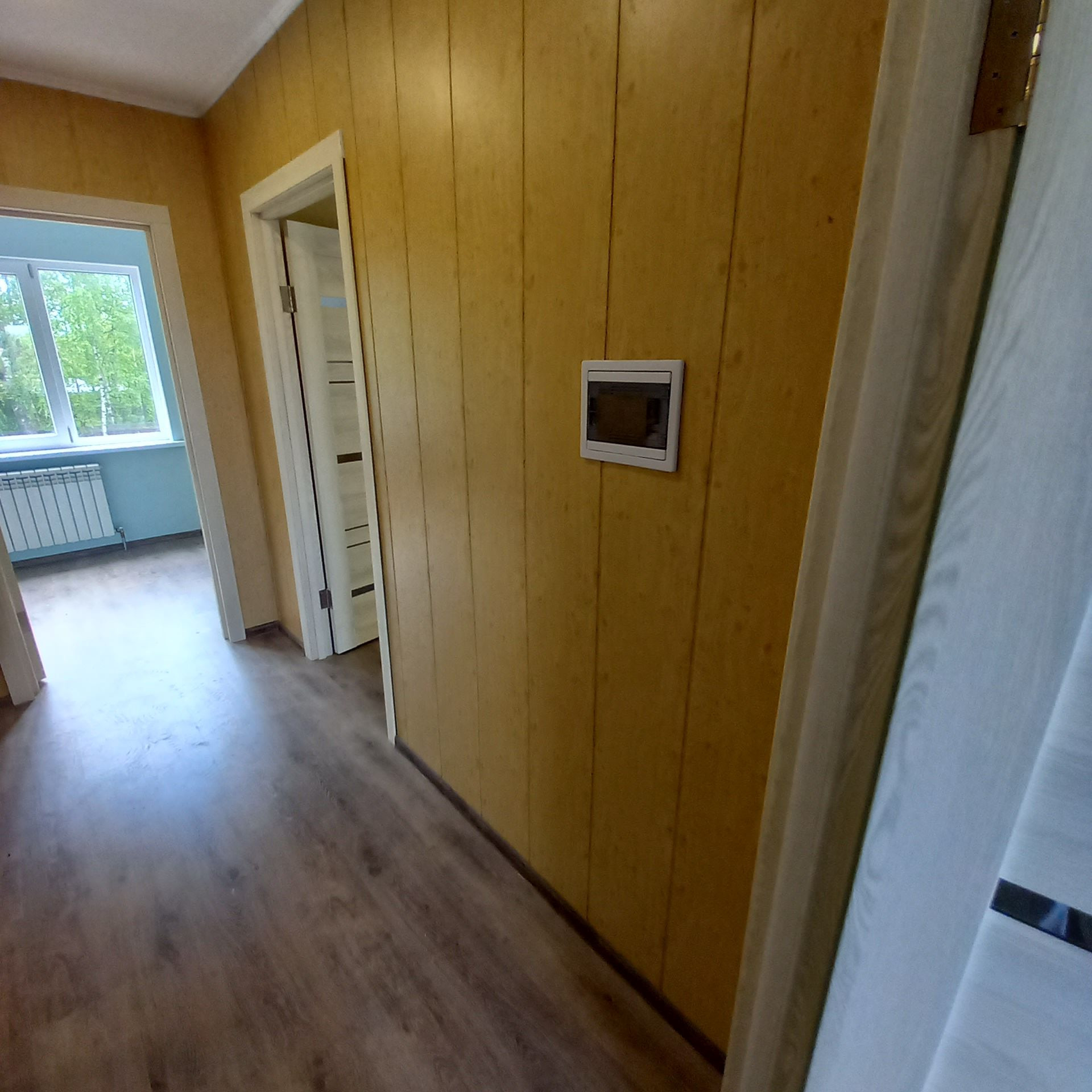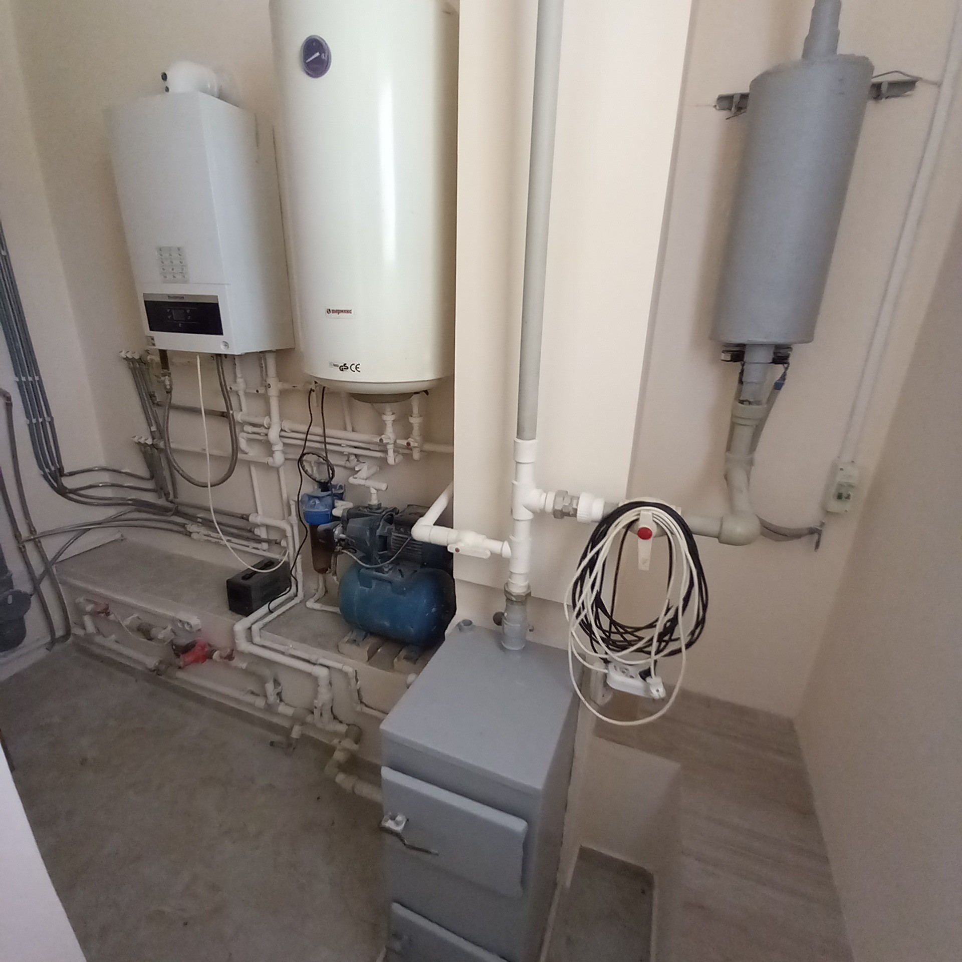 Площадь дома составляет 150 м. На первом этаже расположены спальня, просторная гостиная, кухня, санузел и и техническое помещение. В котельне размещены электрокотёл, твердотопливный котёл, газовый котёл с бойлером для бесперебойной подачи горячей воды. Основное отопление производится газовым котлом.
