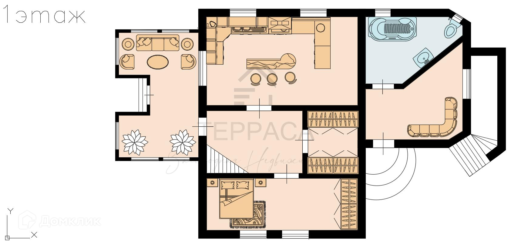 1 этаж – гостиная с русской печью, лежанкой и плитой; кухня, крытая терраса, сауна, душевая, с/у.