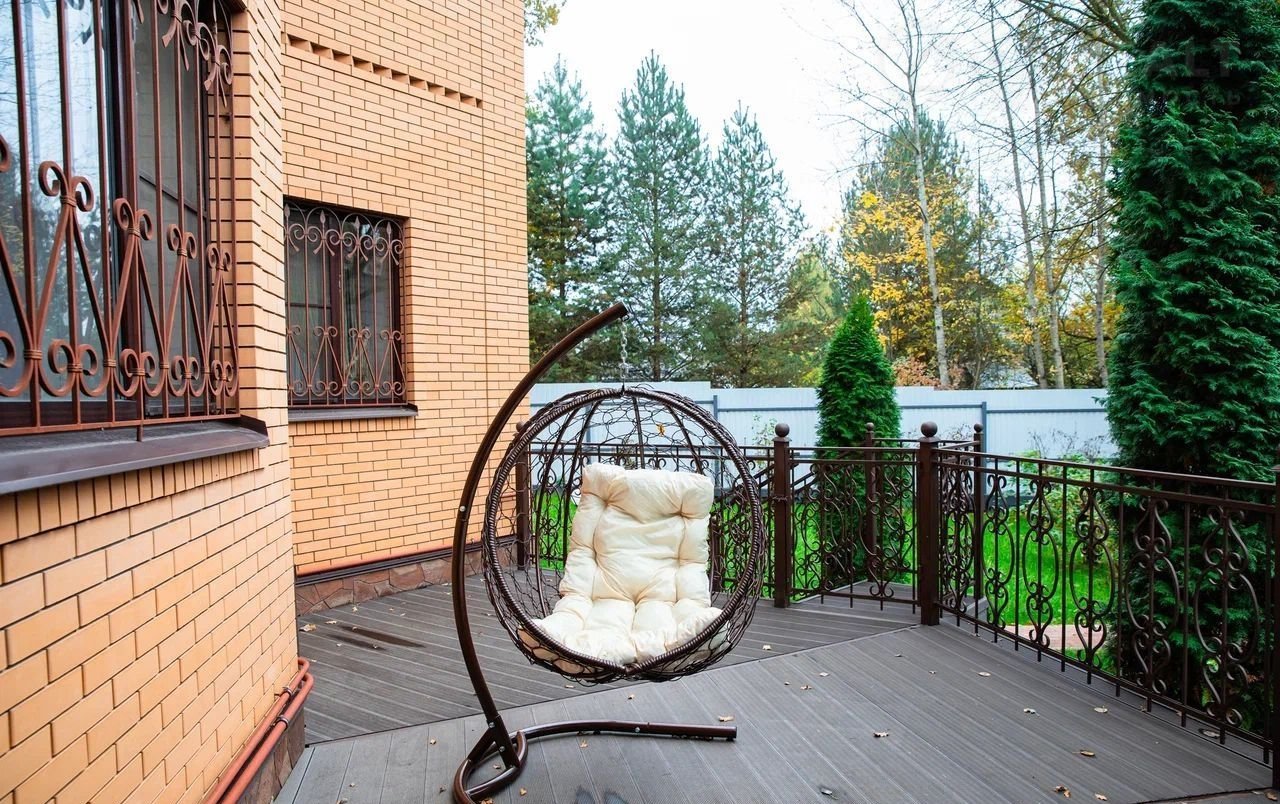 Уютная терраса с качелями и плетеной мебелью.