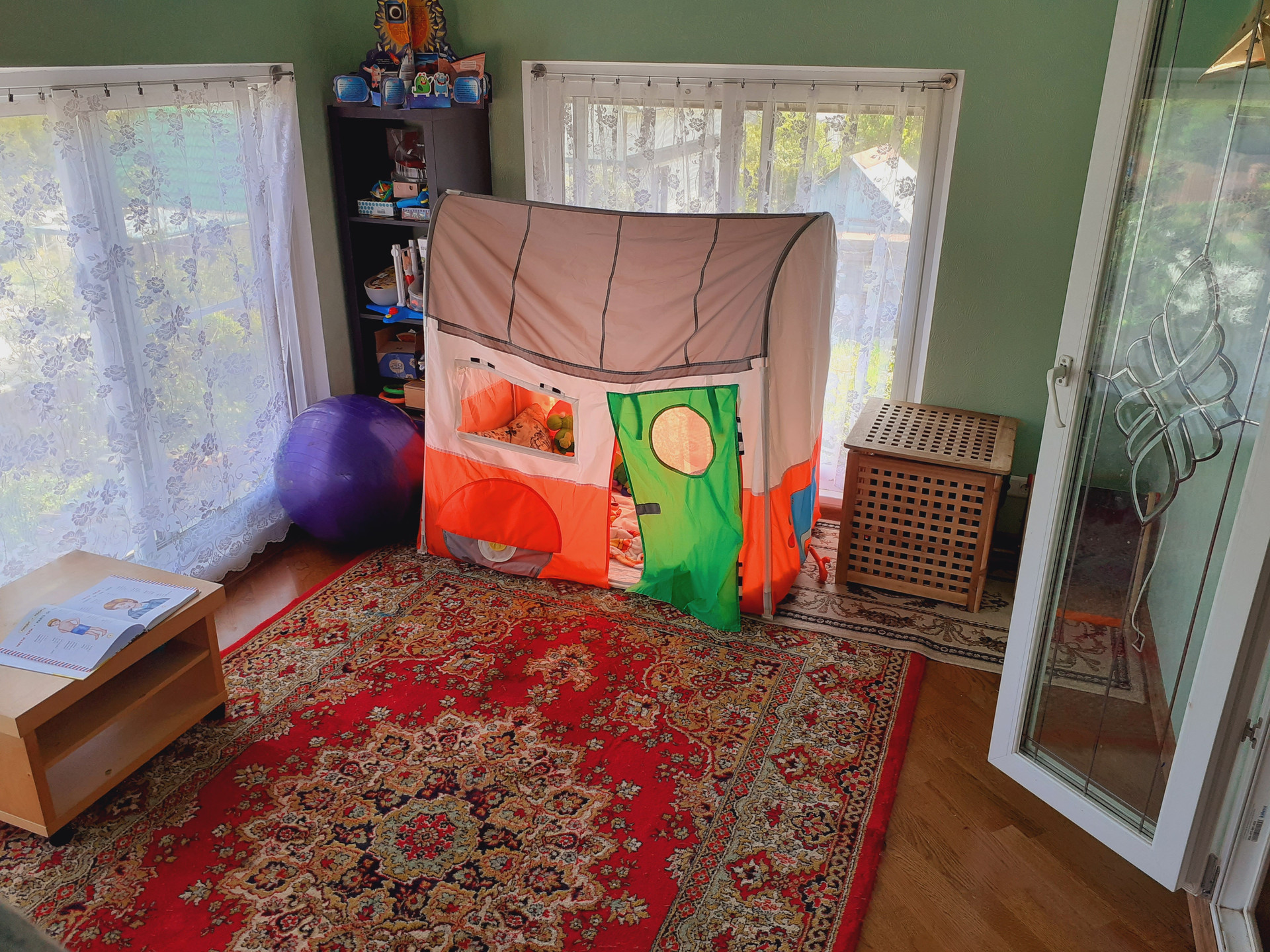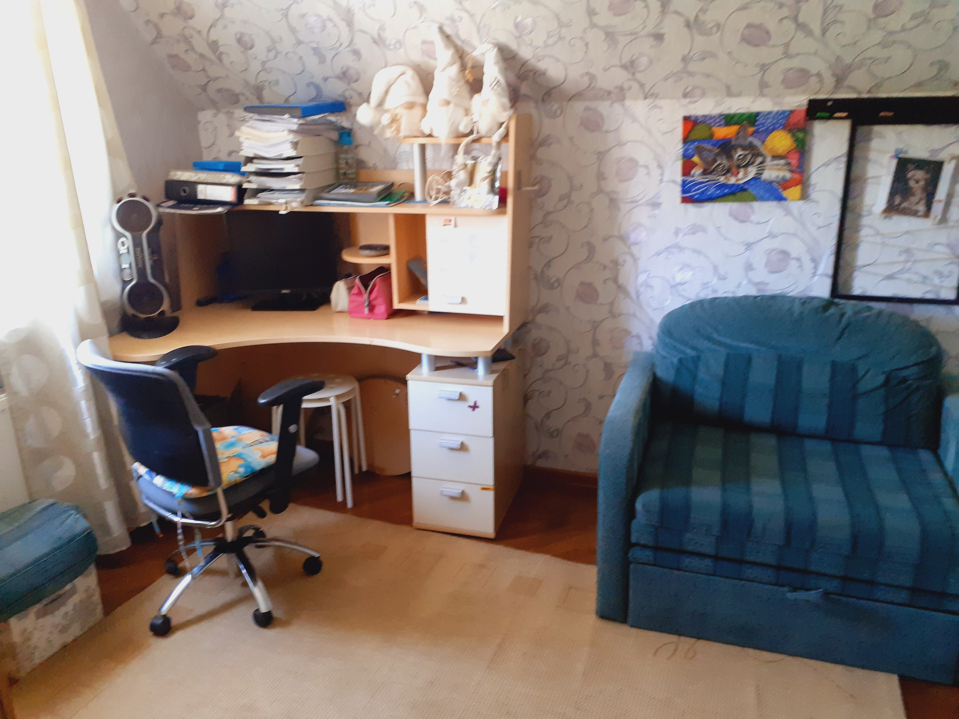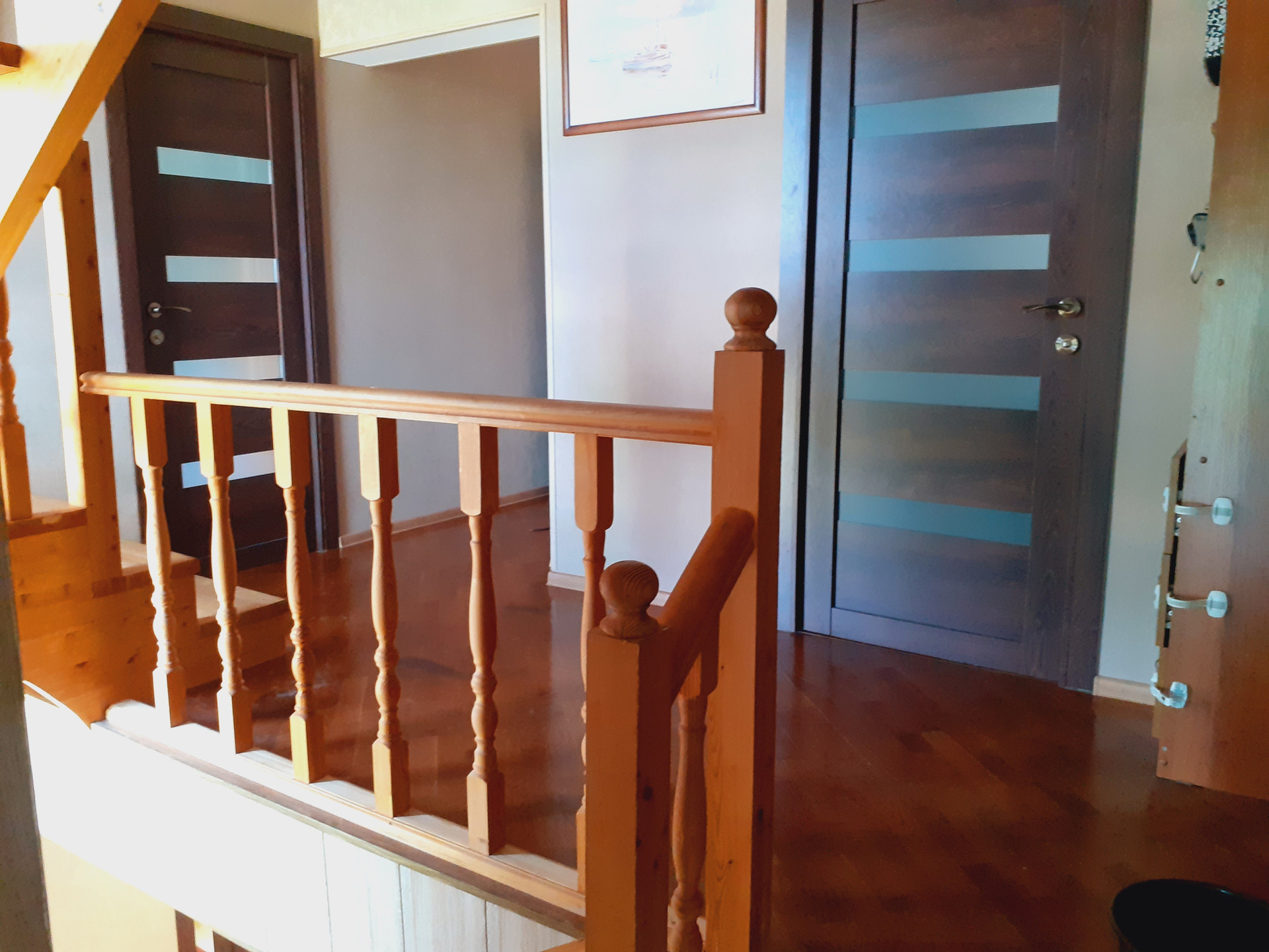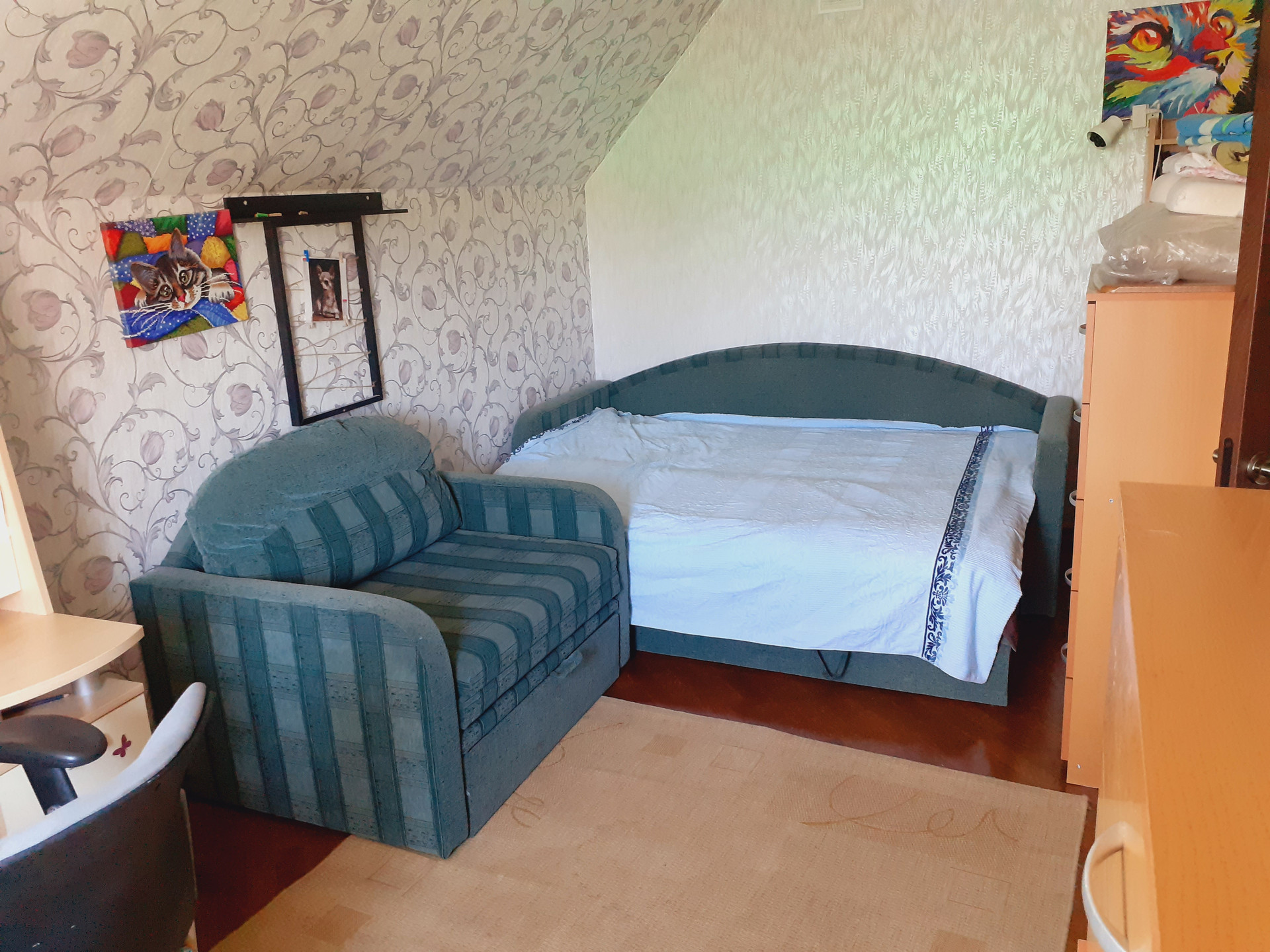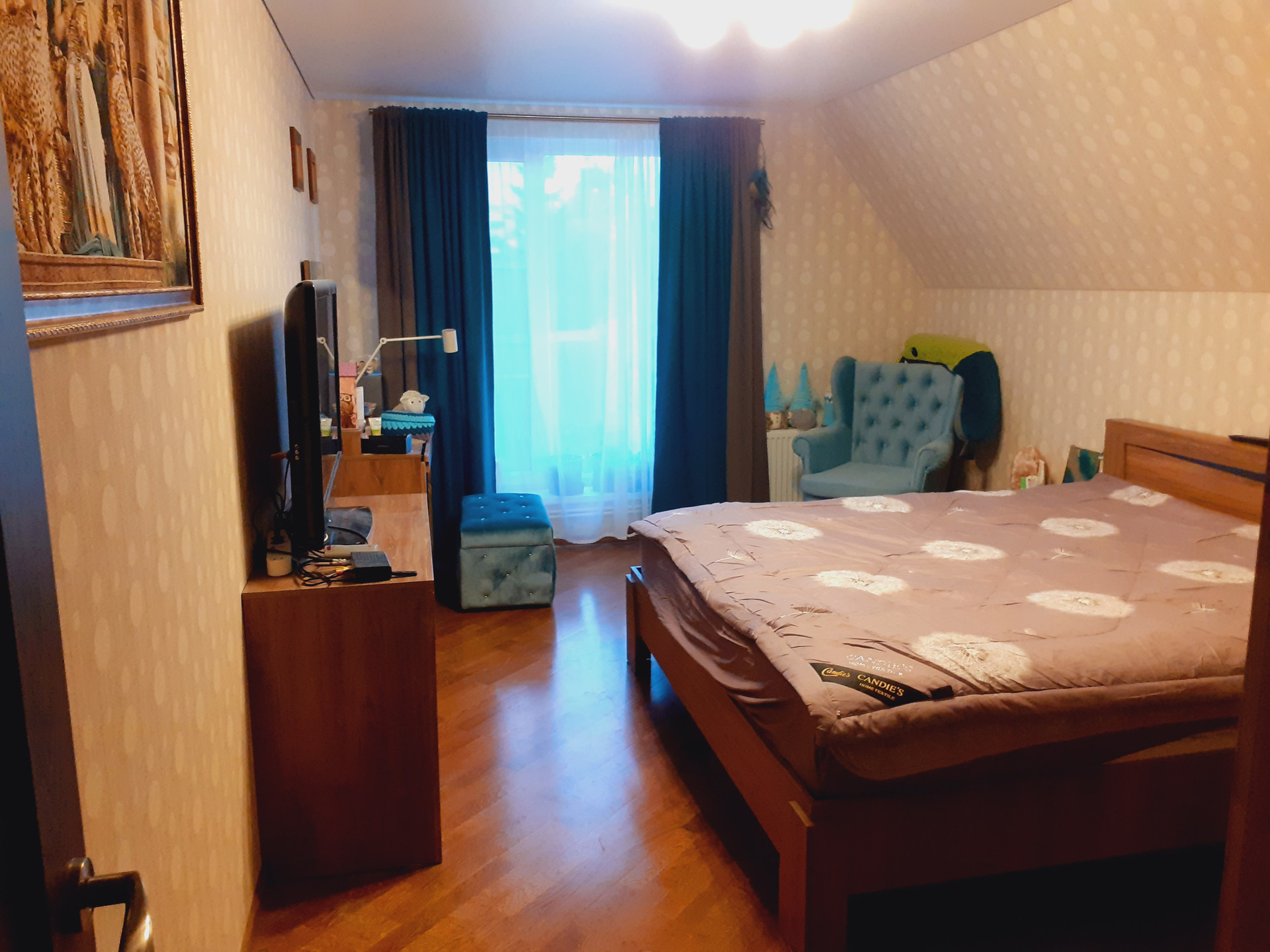 Второй этаж: 3 спальни, санузел с теплым полом, выход на большой остеклённый балкон-веранду, который в данный момент используется как детская игровая комната.