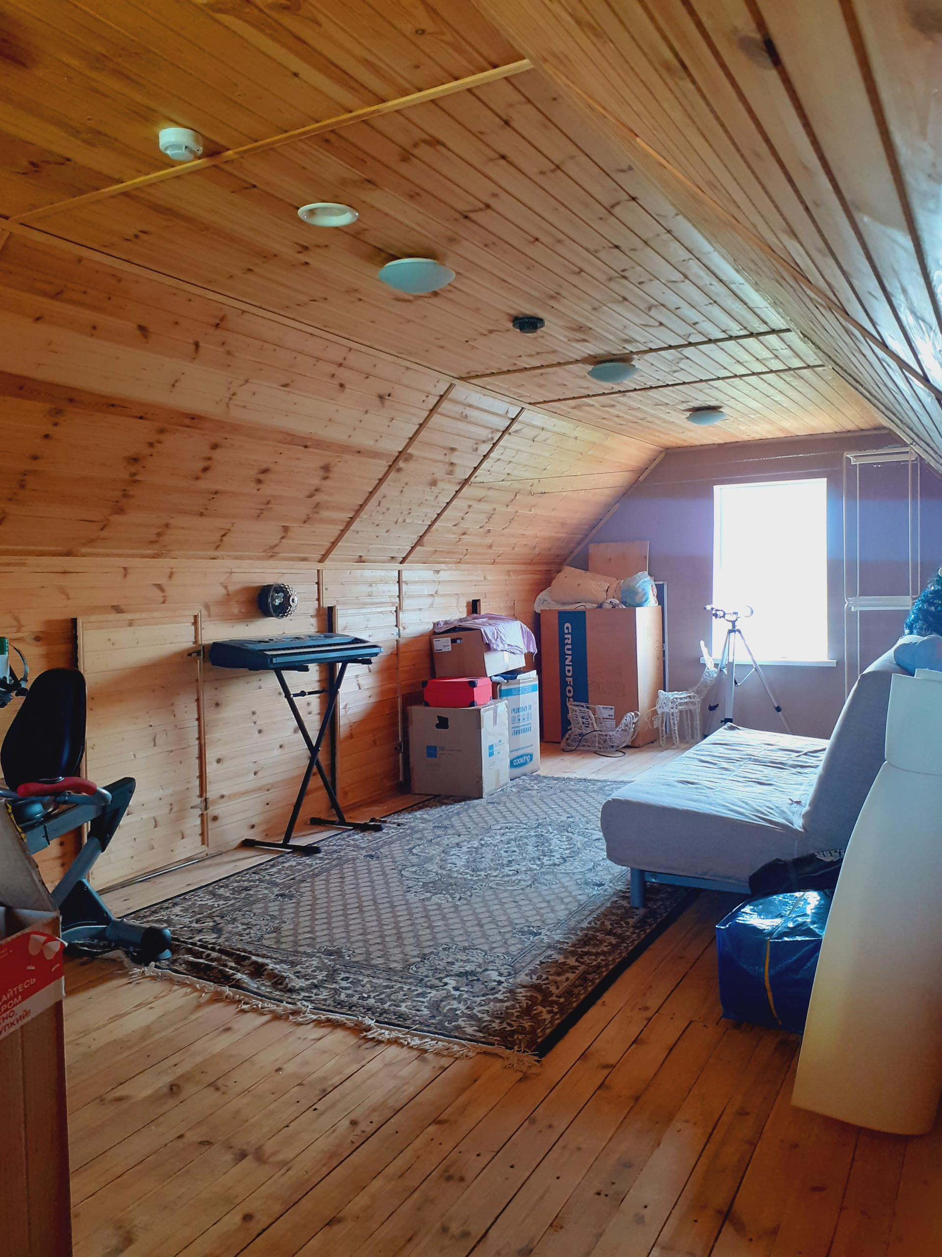 Третий этаж: мансарда с высоким потолком. В стены вмонтированы дверцы, что позволило создать много дополнительного места для хранения под уклоном крыши.