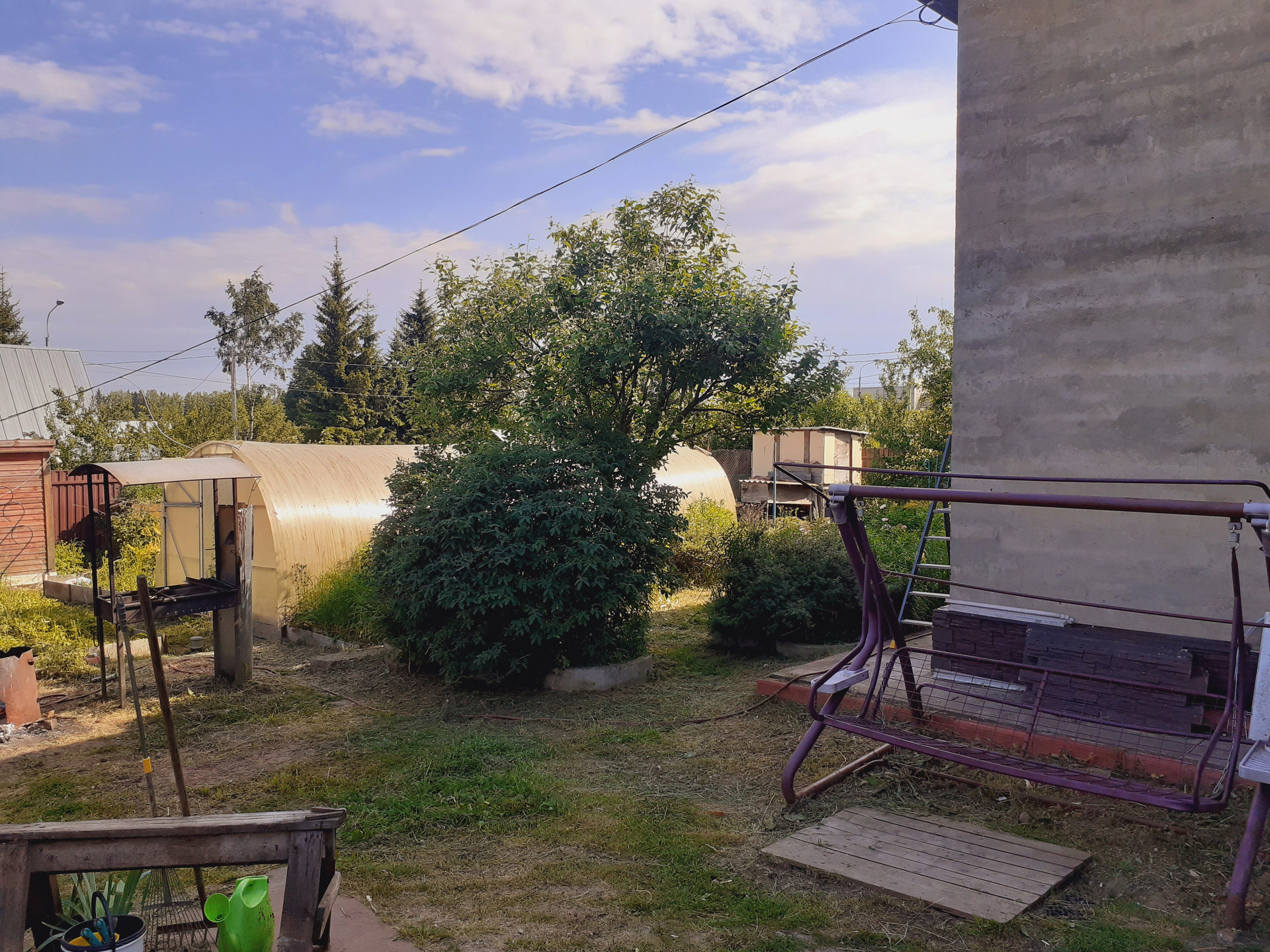 По всему участку обустроена дренажная система от грунтовых и дождевых вод. Есть небольшая бытовка для хранения садового инвентаря, велосипедов, санок и пр. На территории растут плодовые деревья, кустарники, цветы. Парковочное место на 4 машины. Весь участок огражден забором из профнастила.