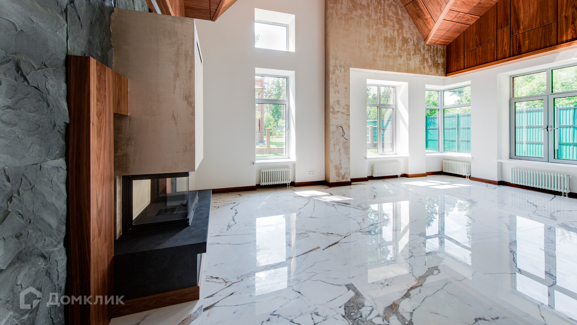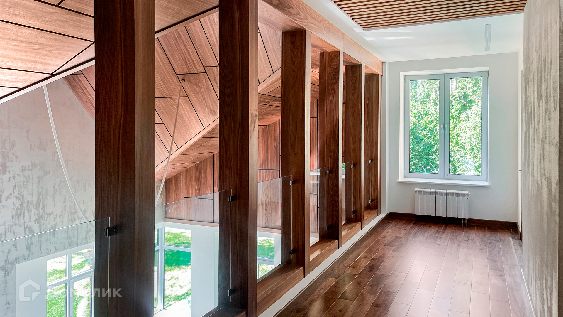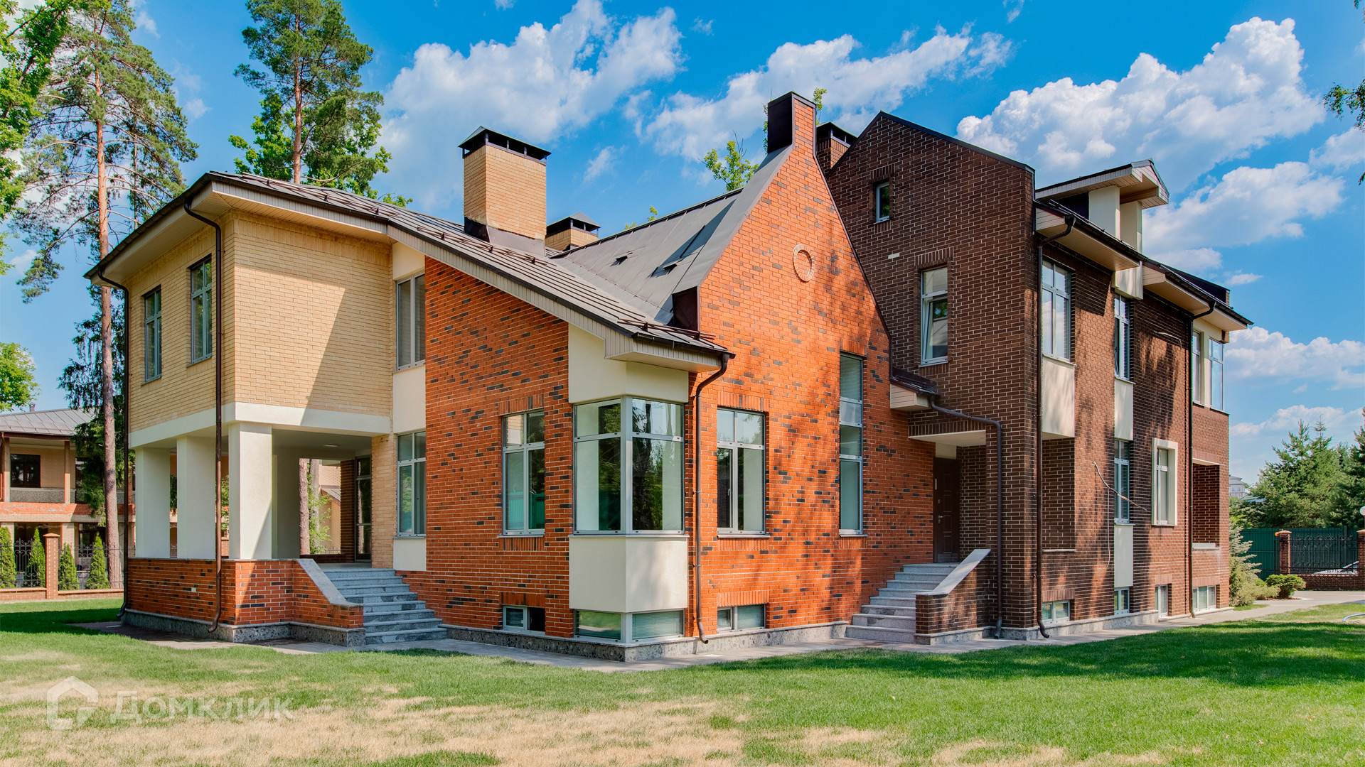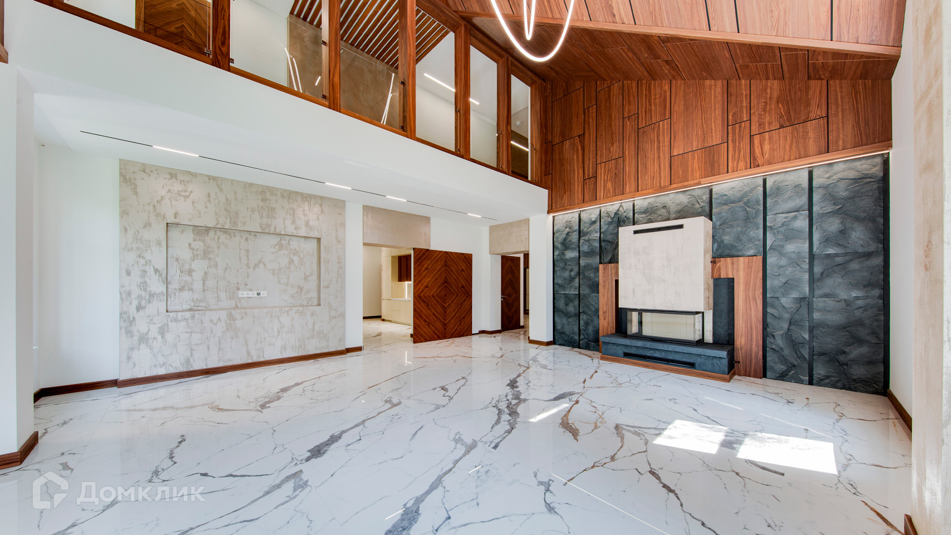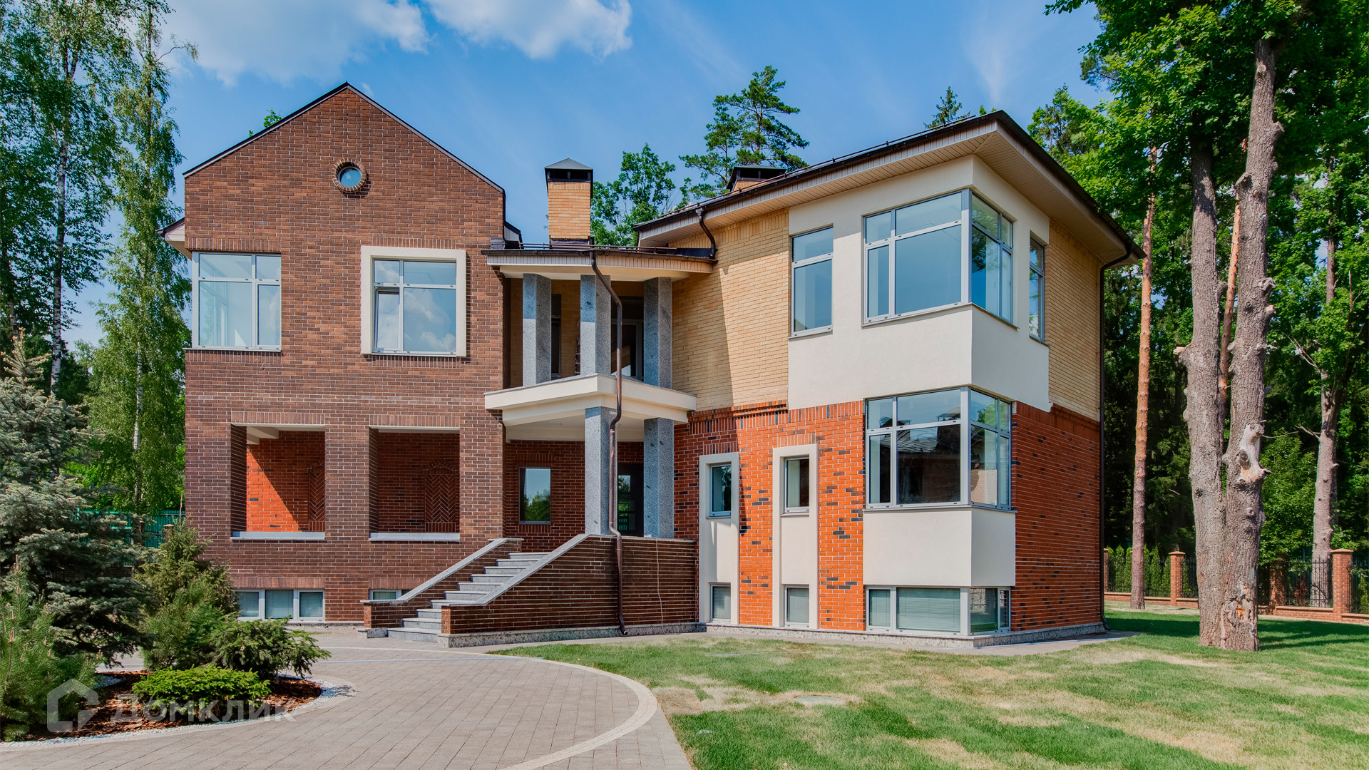 ID 10 267. Семёнково. Загородный дом площадью 550 м² построен на просторном участке у леса 25 соток. В современном интерьере преобладают природные фактуры — дерево и камень, молочные и песочные оттенки в сочетании с дизайнерским освещением создают атмосферу уюта. В коттедже спланировали 5 спален, гостиную со вторым светом и камином, столовую, кухню, кабинет. На территории расположен гараж с квартирой для персонала.