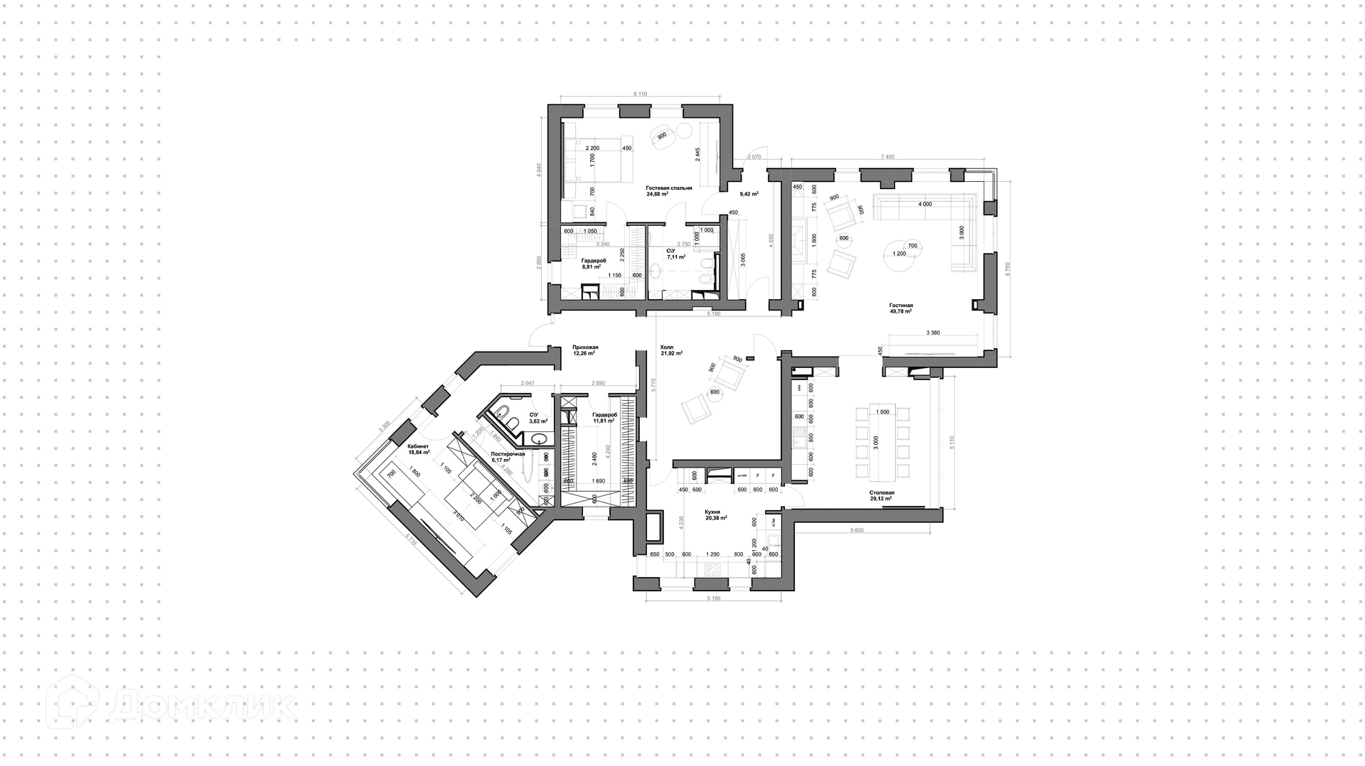 1-й уровень: гостиная, кухня-столовая, гостевая спальня с санузлом и гардеробной, кабинет, гардеробная, санузел, постирочная.