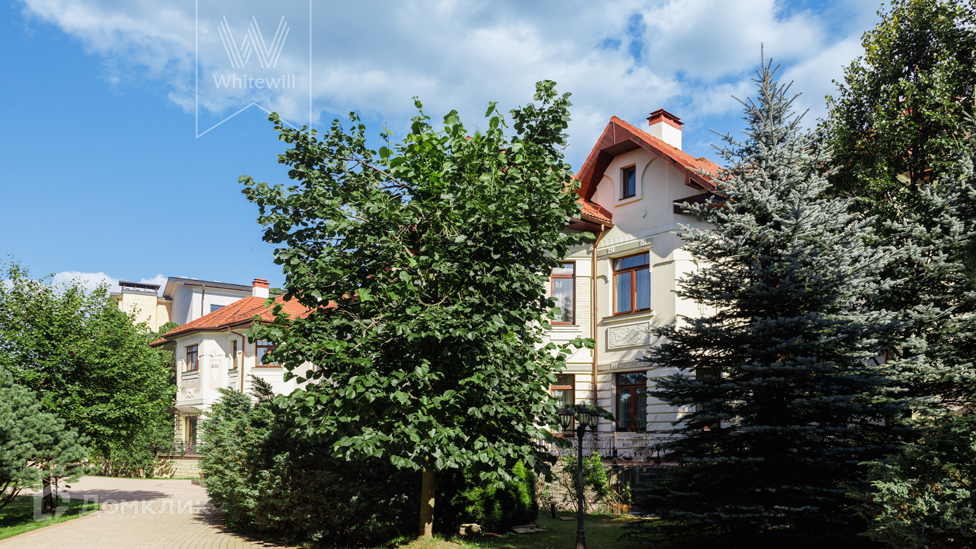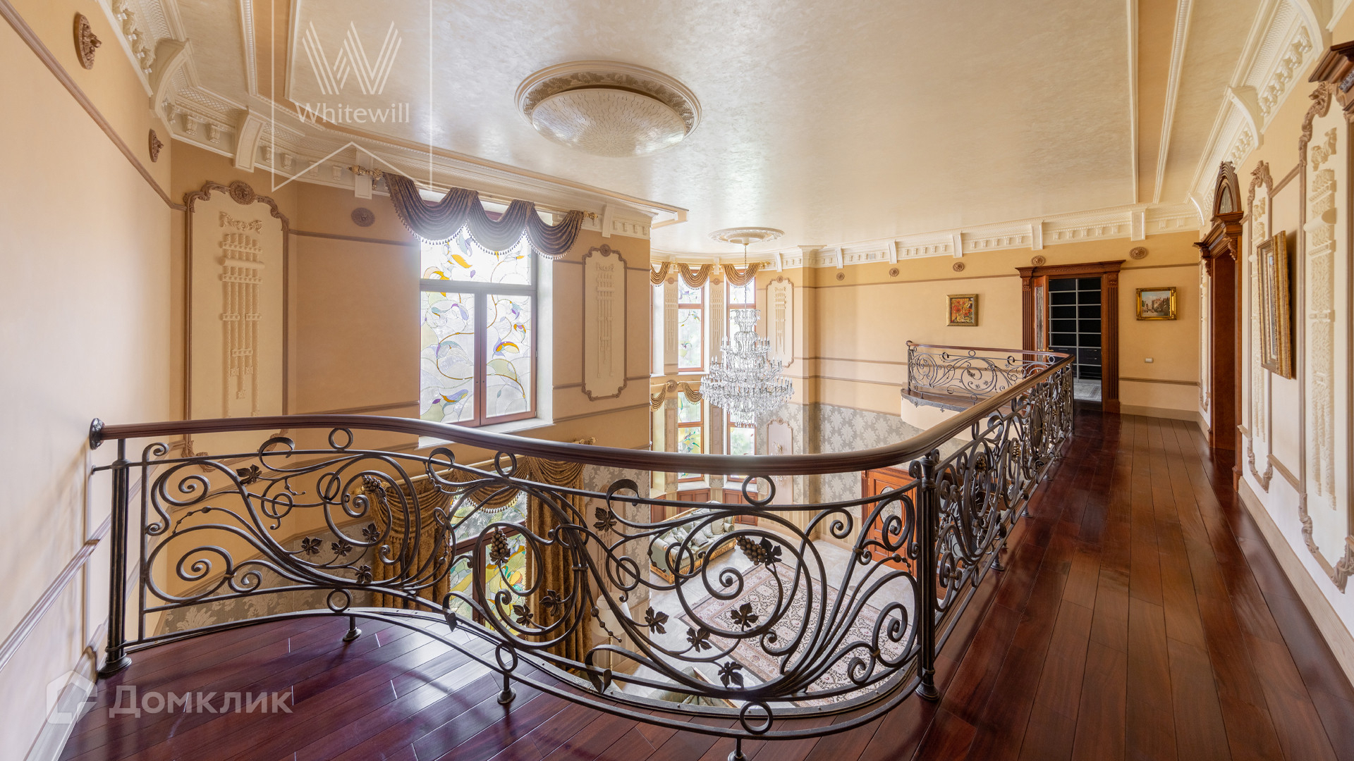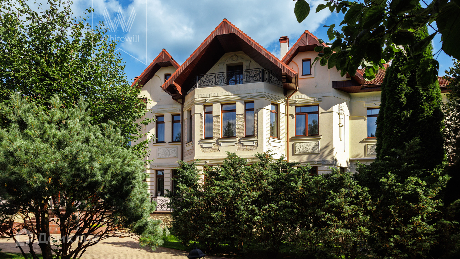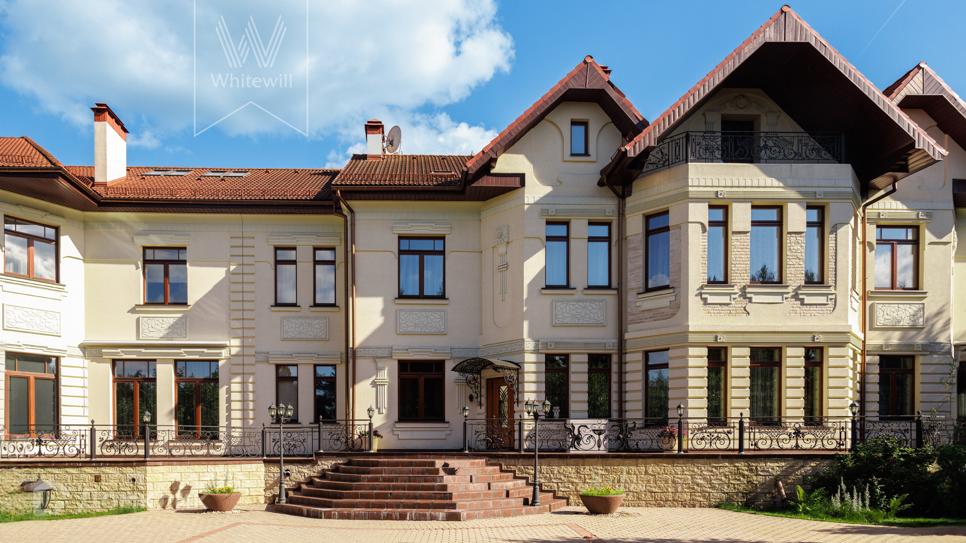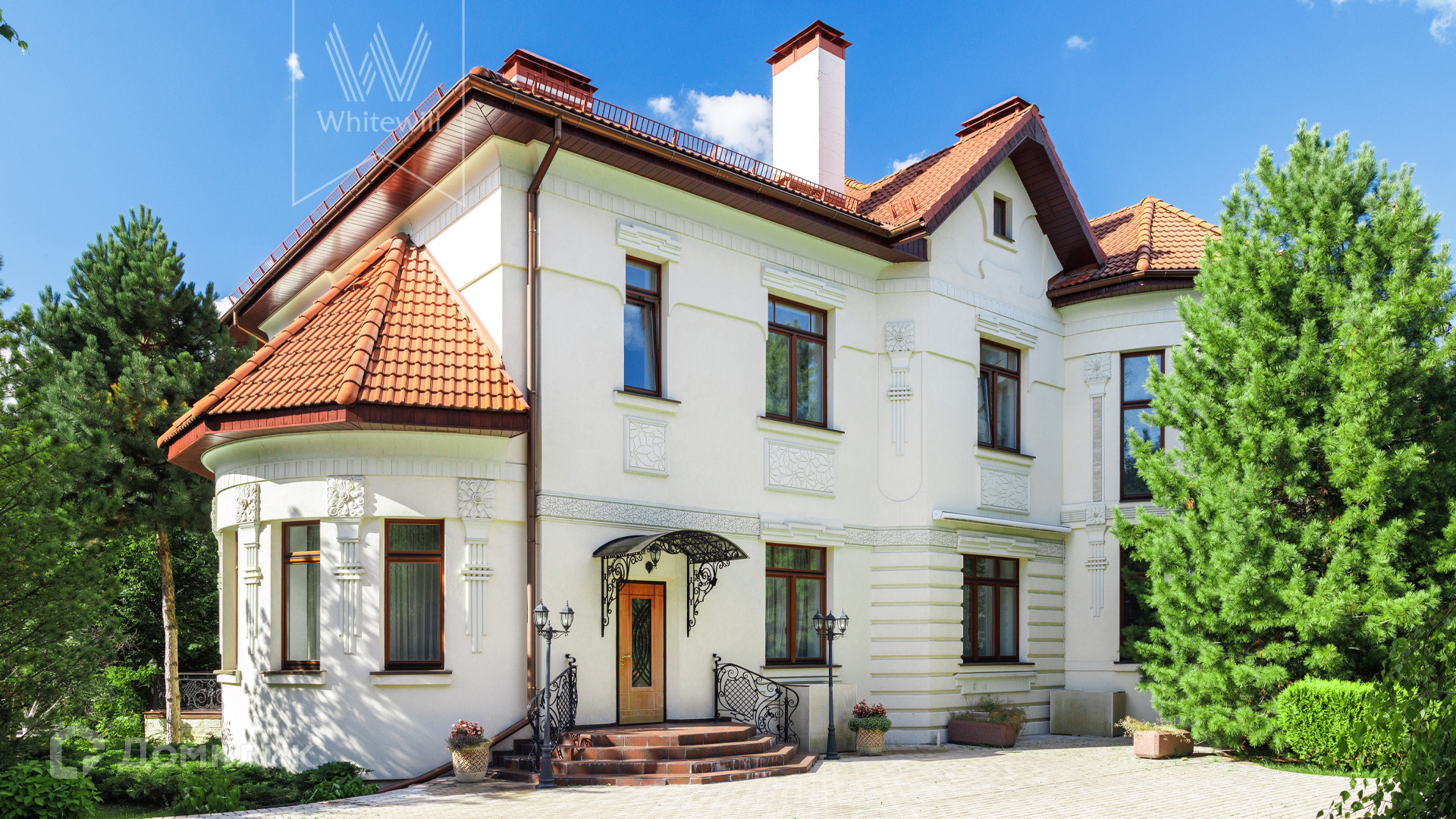 ID 11 773. Семёнково. Загородный особняк в стиле русского модерна площадью 2009 м² построен на просторном участке 0,9 гектара с собственным озером. Фасад дома облицован бежевой штукатуркой, декорирован панно, рустовкой и коваными элементами. В отделке интерьера использованы светлые, теплые оттенки, создающие атмосферу уюта. Планировкой резиденции предусмотрены 3 спальни, 2 гостиные, одна из которых с камином и вторым светом, кухня, 2 столовые, кабинет и SPA-зона с бассейном длиной 16 метров, хаммамом и сауной. На территории построены 4 гаража, гостевой дом, летний домик, беседка и зона барбекю, а также обустроены парк, сад, фонтан и паркинг. На участке с 2-мя въездами выполнены ландшафтный дизайн и дренажные работы, установлена система автополива, вымощены дорожки и оборудовано уличное освещение.