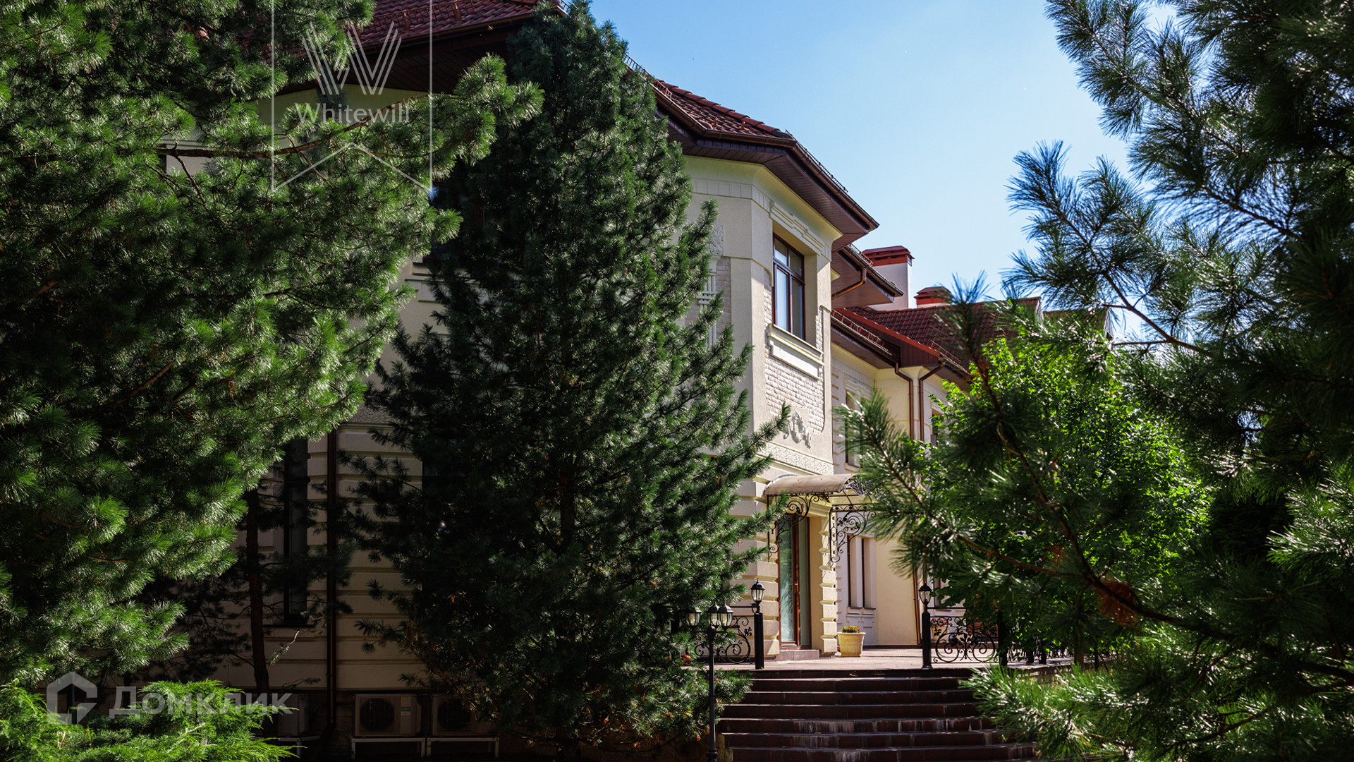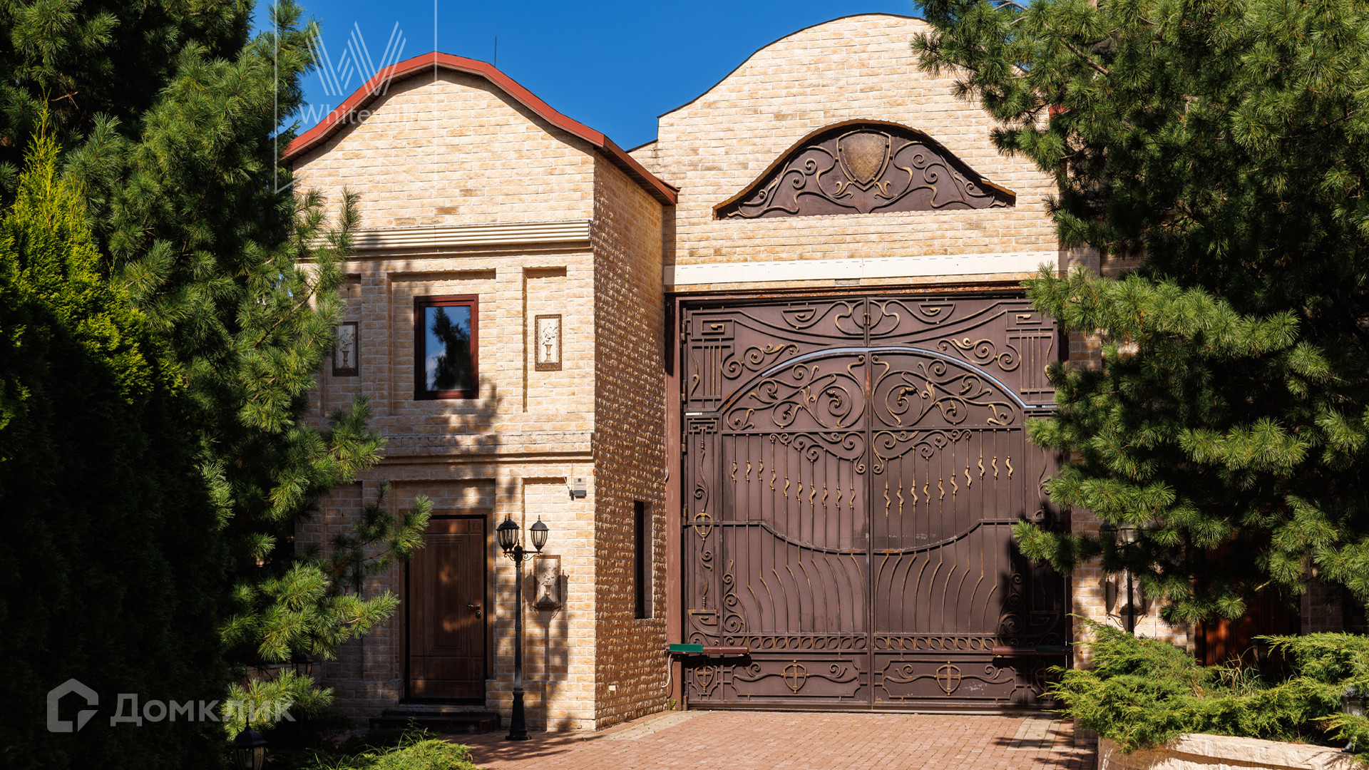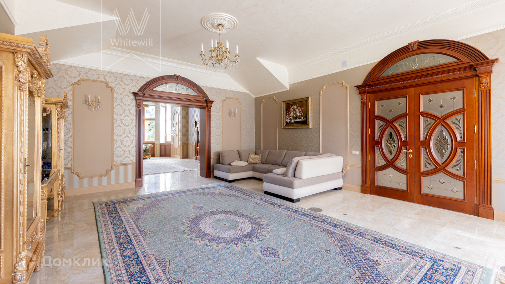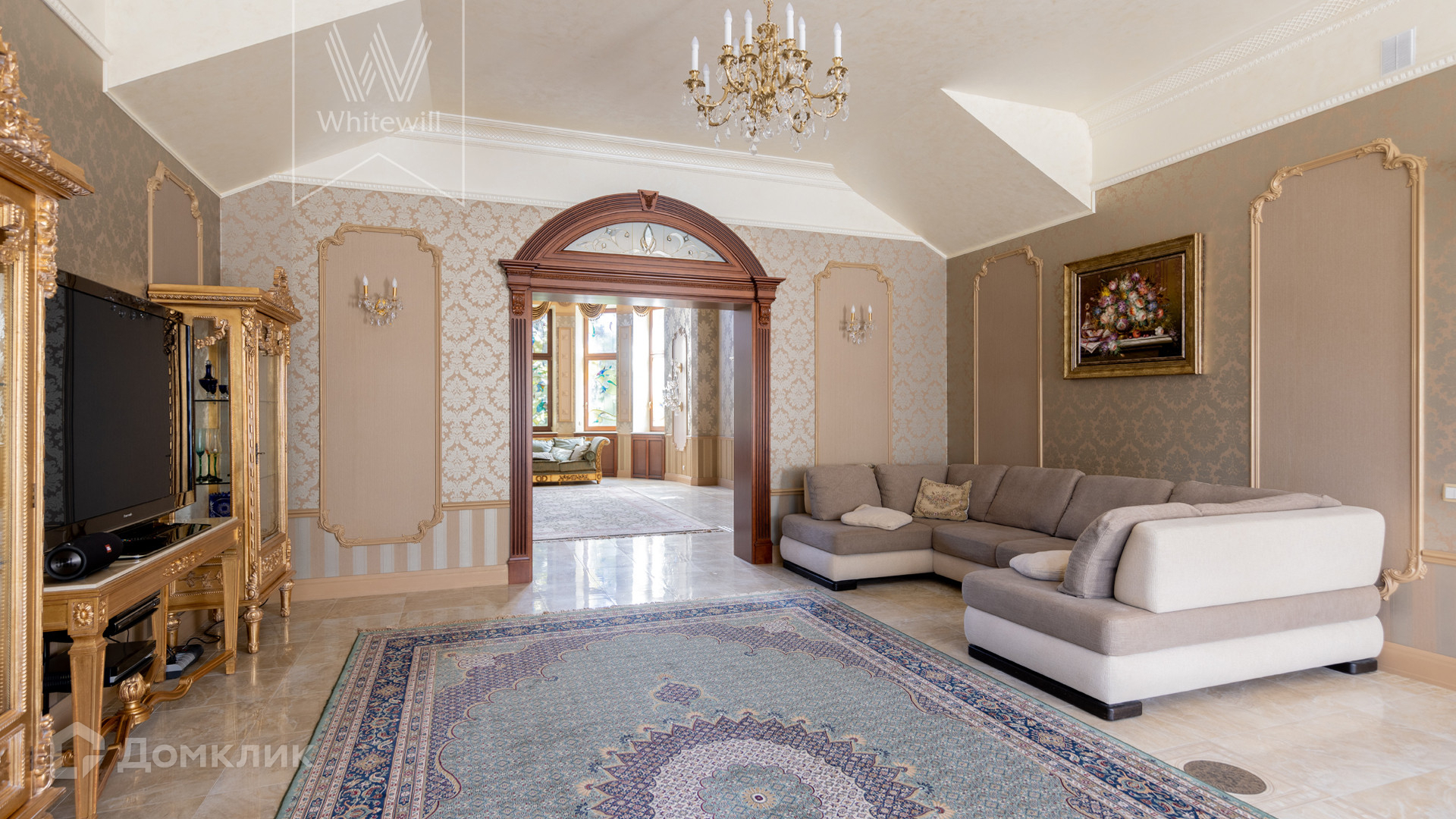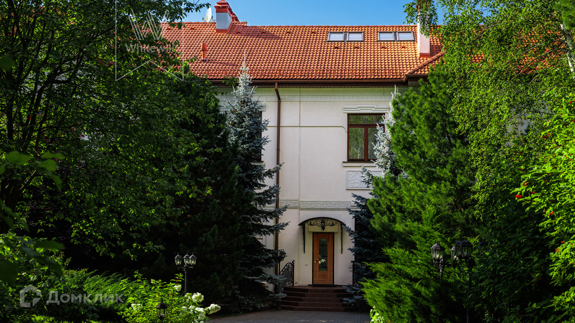 ID 11 773. Семёнково. Загородный особняк в стиле русского модерна площадью 2009 м² построен на просторном участке 0,9 гектара с собственным озером. Фасад дома облицован бежевой штукатуркой, декорирован панно, рустовкой и коваными элементами. В отделке интерьера использованы светлые, теплые оттенки, создающие атмосферу уюта. Планировкой резиденции предусмотрены 3 спальни, 2 гостиные, одна из которых с камином и вторым светом, кухня, 2 столовые, кабинет и SPA-зона с бассейном длиной 16 метров, хаммамом и сауной. На территории построены 4 гаража, гостевой дом, летний домик, беседка и зона барбекю, а также обустроены парк, сад, фонтан и паркинг. На участке с 2-мя въездами выполнены ландшафтный дизайн и дренажные работы, установлена система автополива, вымощены дорожки и оборудовано уличное освещение.