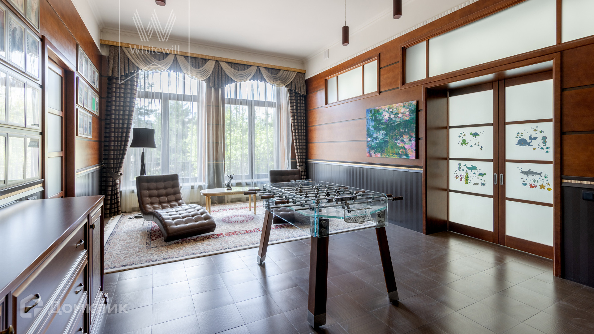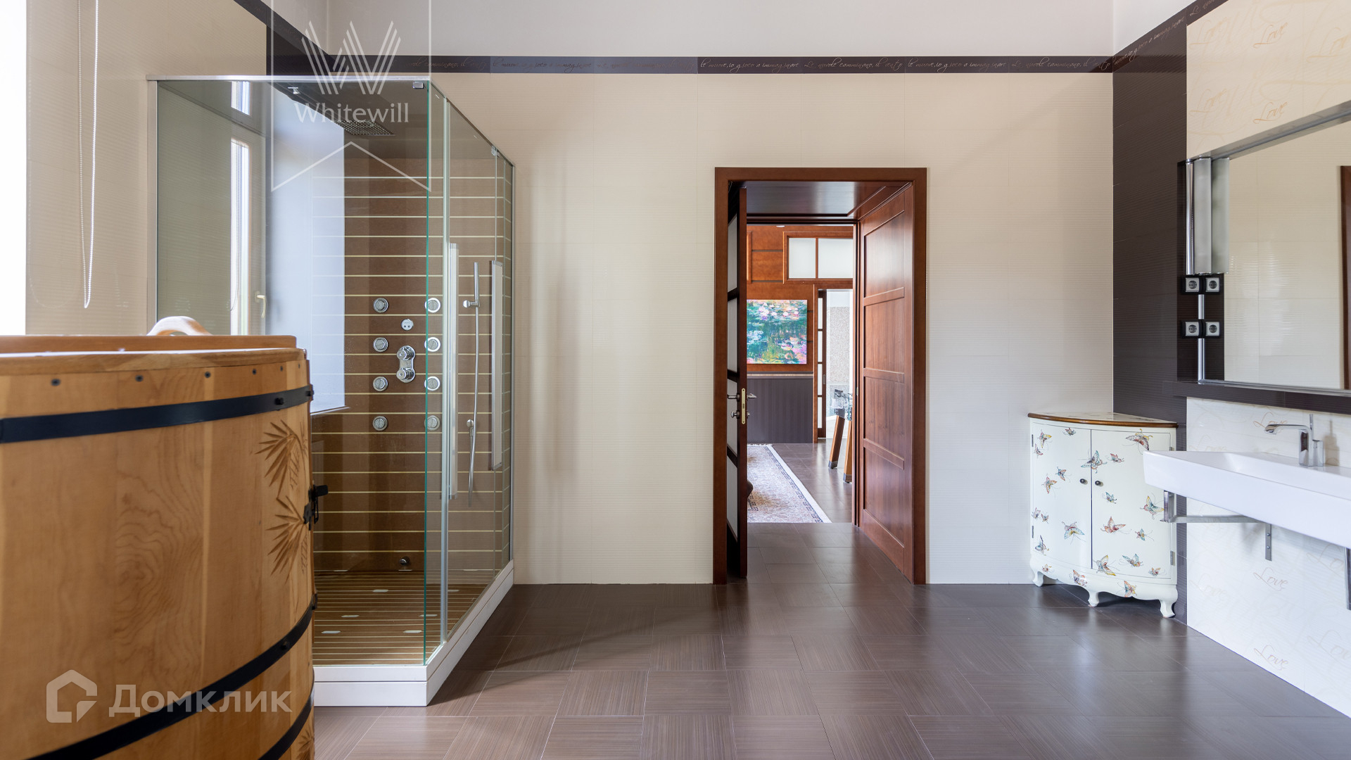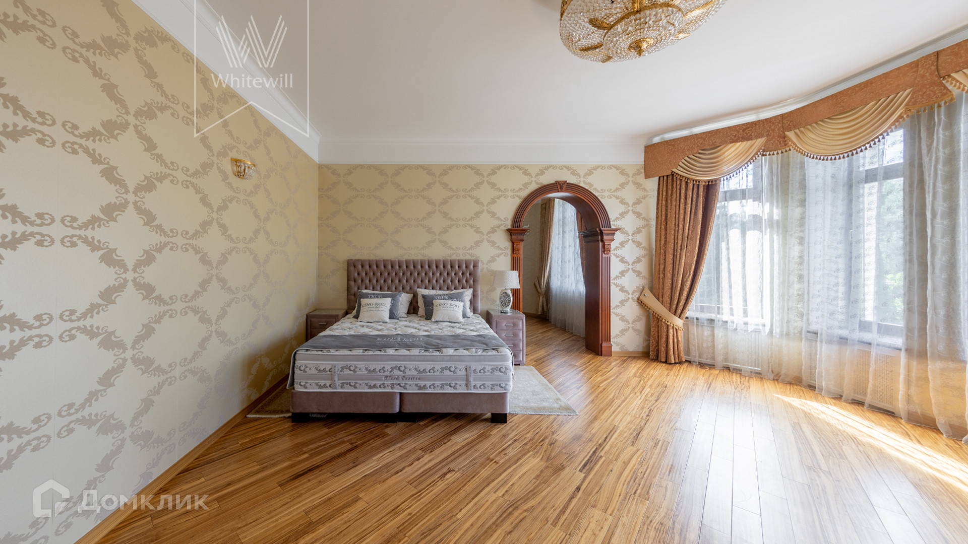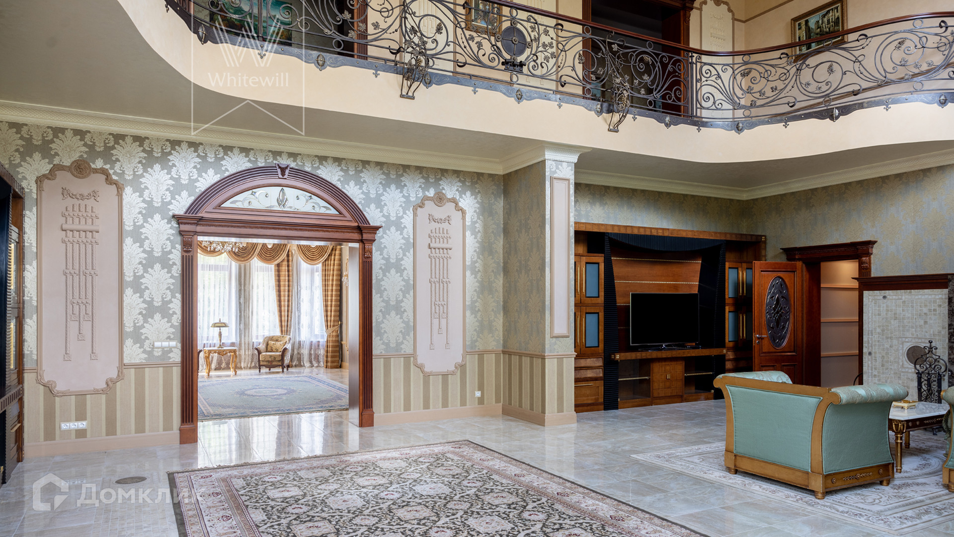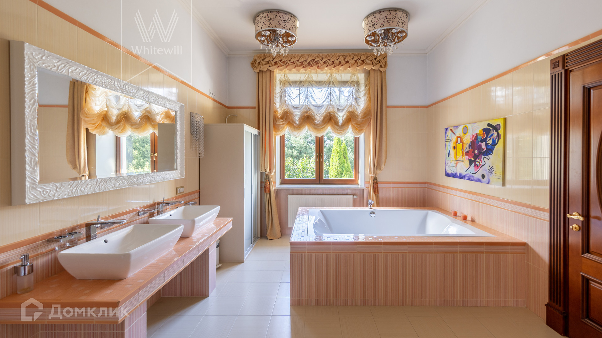 ID 11 773. Семёнково. Загородный особняк в стиле русского модерна площадью 2009 м² построен на просторном участке 0,9 гектара с собственным озером. Фасад дома облицован бежевой штукатуркой, декорирован панно, рустовкой и коваными элементами. В отделке интерьера использованы светлые, теплые оттенки, создающие атмосферу уюта. Планировкой резиденции предусмотрены 3 спальни, 2 гостиные, одна из которых с камином и вторым светом, кухня, 2 столовые, кабинет и SPA-зона с бассейном длиной 16 метров, хаммамом и сауной. На территории построены 4 гаража, гостевой дом, летний домик, беседка и зона барбекю, а также обустроены парк, сад, фонтан и паркинг. На участке с 2-мя въездами выполнены ландшафтный дизайн и дренажные работы, установлена система автополива, вымощены дорожки и оборудовано уличное освещение.