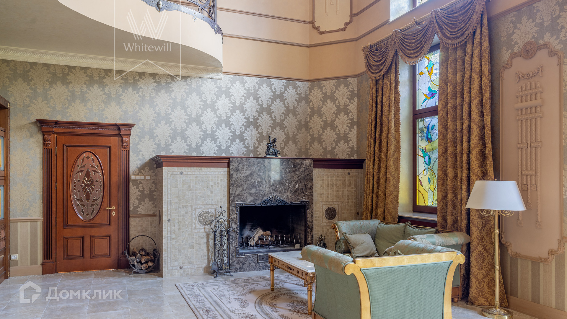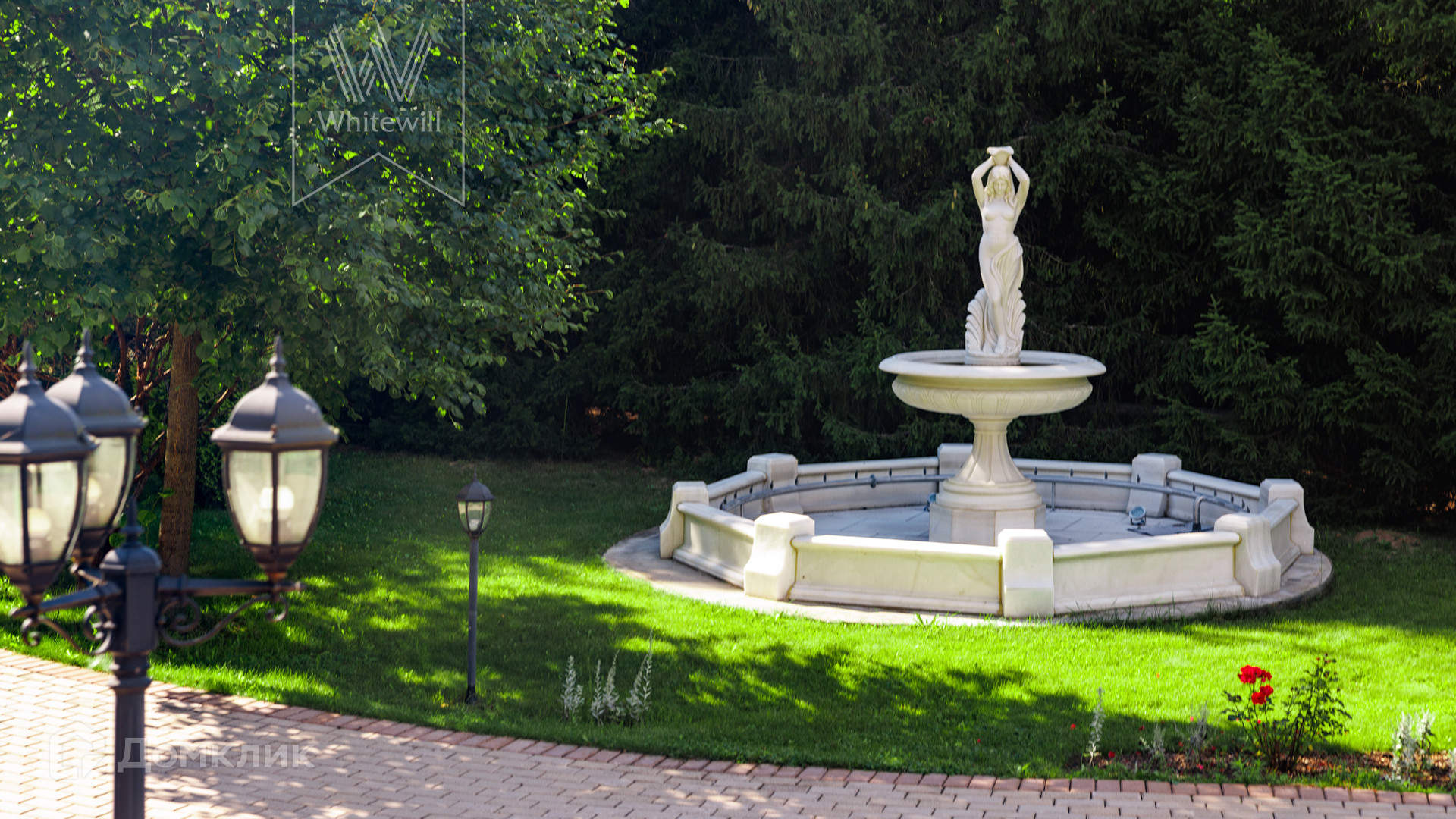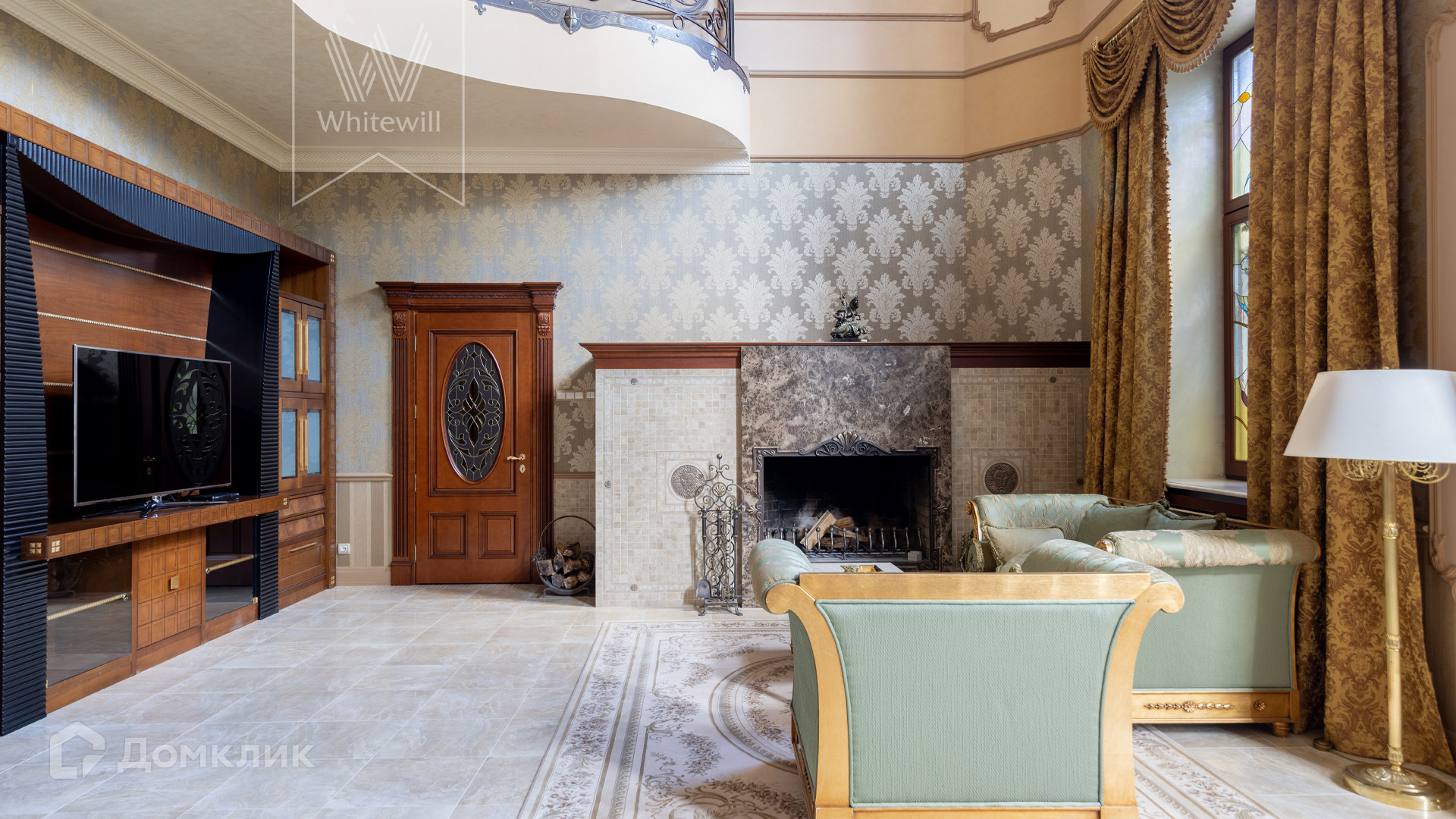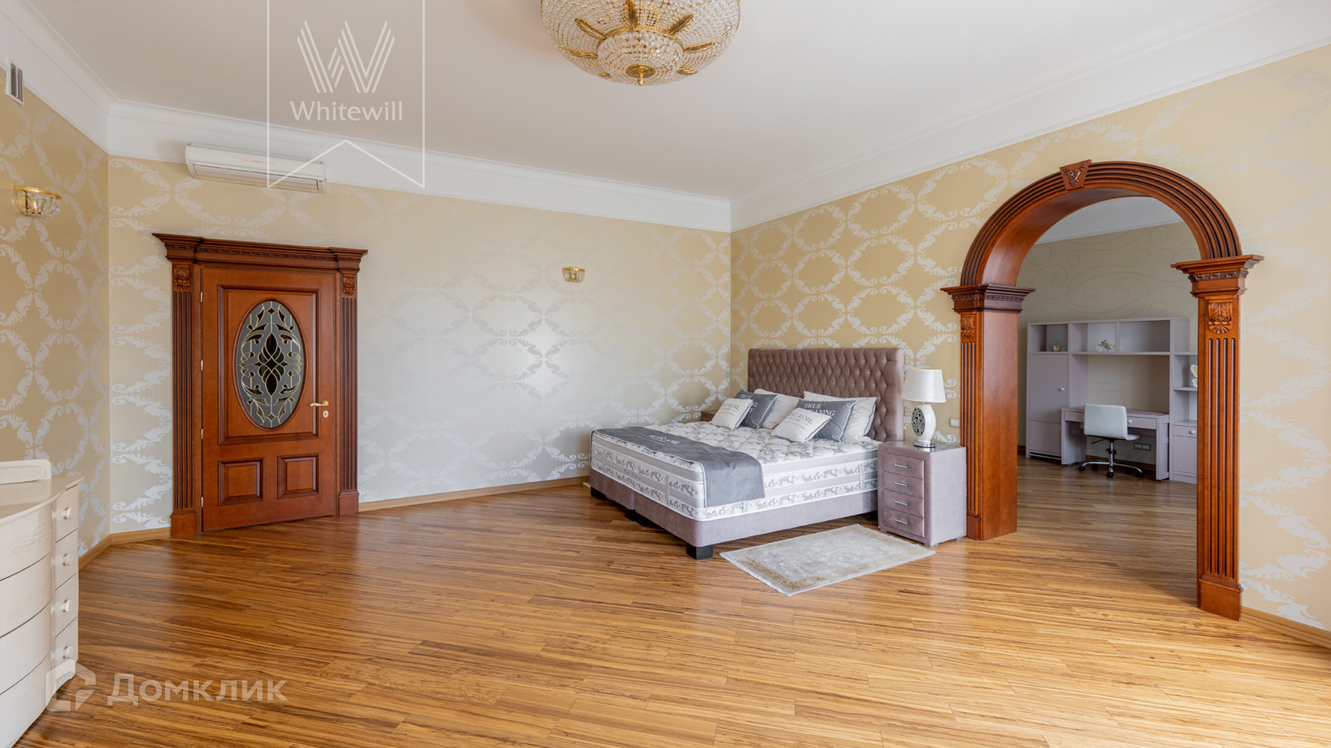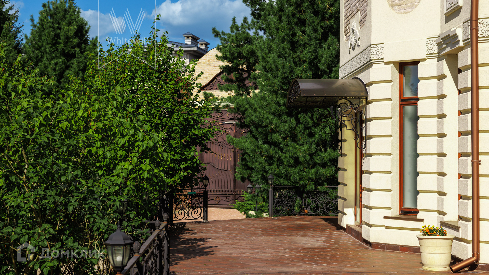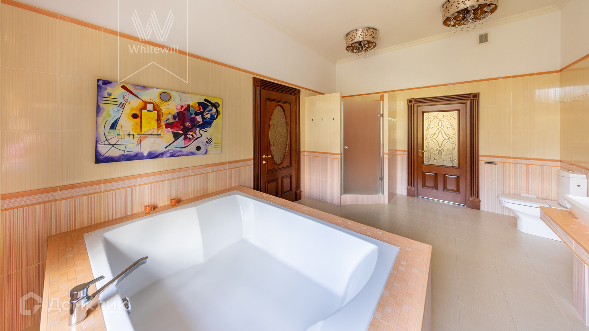 ID 11 773. Семёнково. Загородный особняк в стиле русского модерна площадью 2009 м² построен на просторном участке 0,9 гектара с собственным озером. Фасад дома облицован бежевой штукатуркой, декорирован панно, рустовкой и коваными элементами. В отделке интерьера использованы светлые, теплые оттенки, создающие атмосферу уюта. Планировкой резиденции предусмотрены 3 спальни, 2 гостиные, одна из которых с камином и вторым светом, кухня, 2 столовые, кабинет и SPA-зона с бассейном длиной 16 метров, хаммамом и сауной. На территории построены 4 гаража, гостевой дом, летний домик, беседка и зона барбекю, а также обустроены парк, сад, фонтан и паркинг. На участке с 2-мя въездами выполнены ландшафтный дизайн и дренажные работы, установлена система автополива, вымощены дорожки и оборудовано уличное освещение.