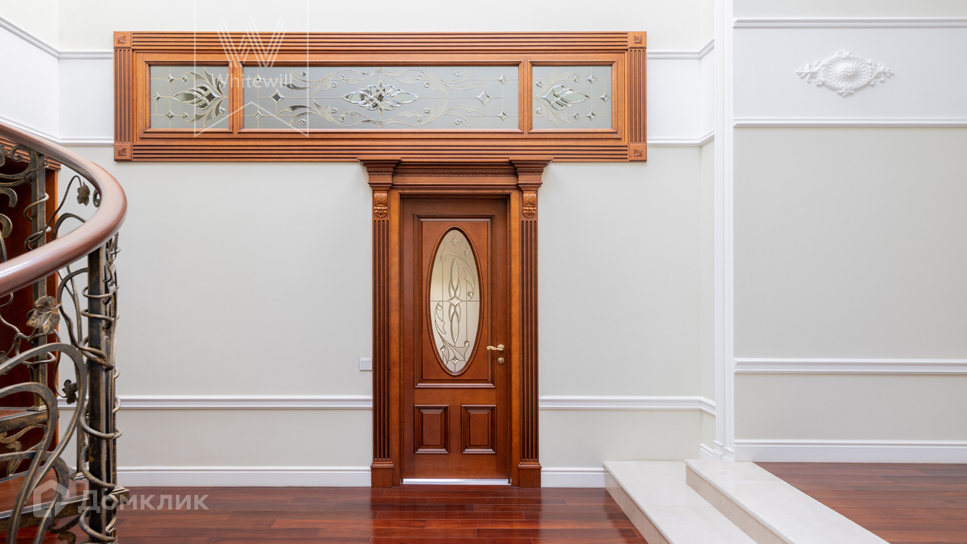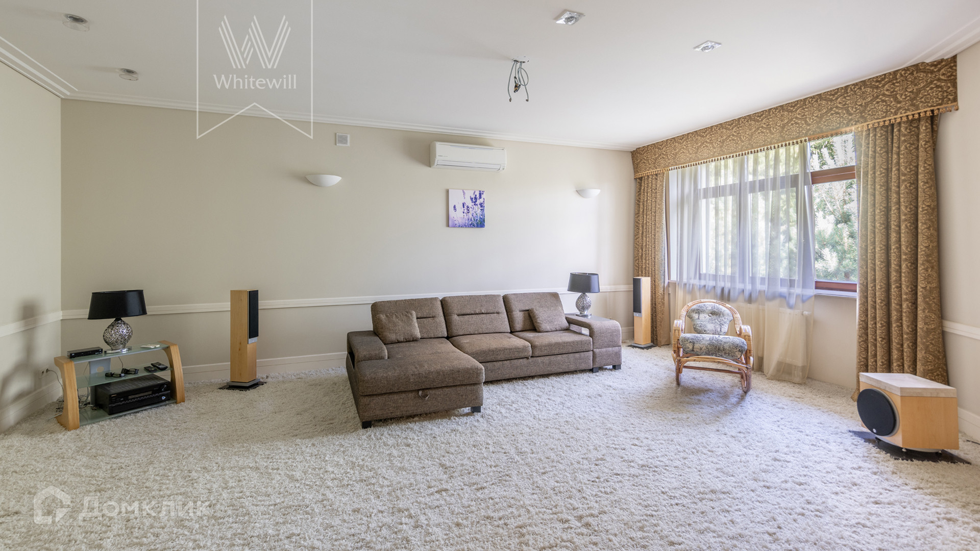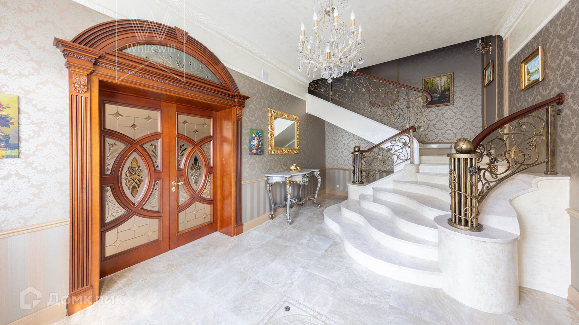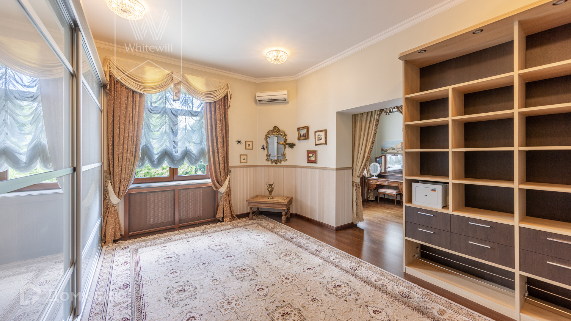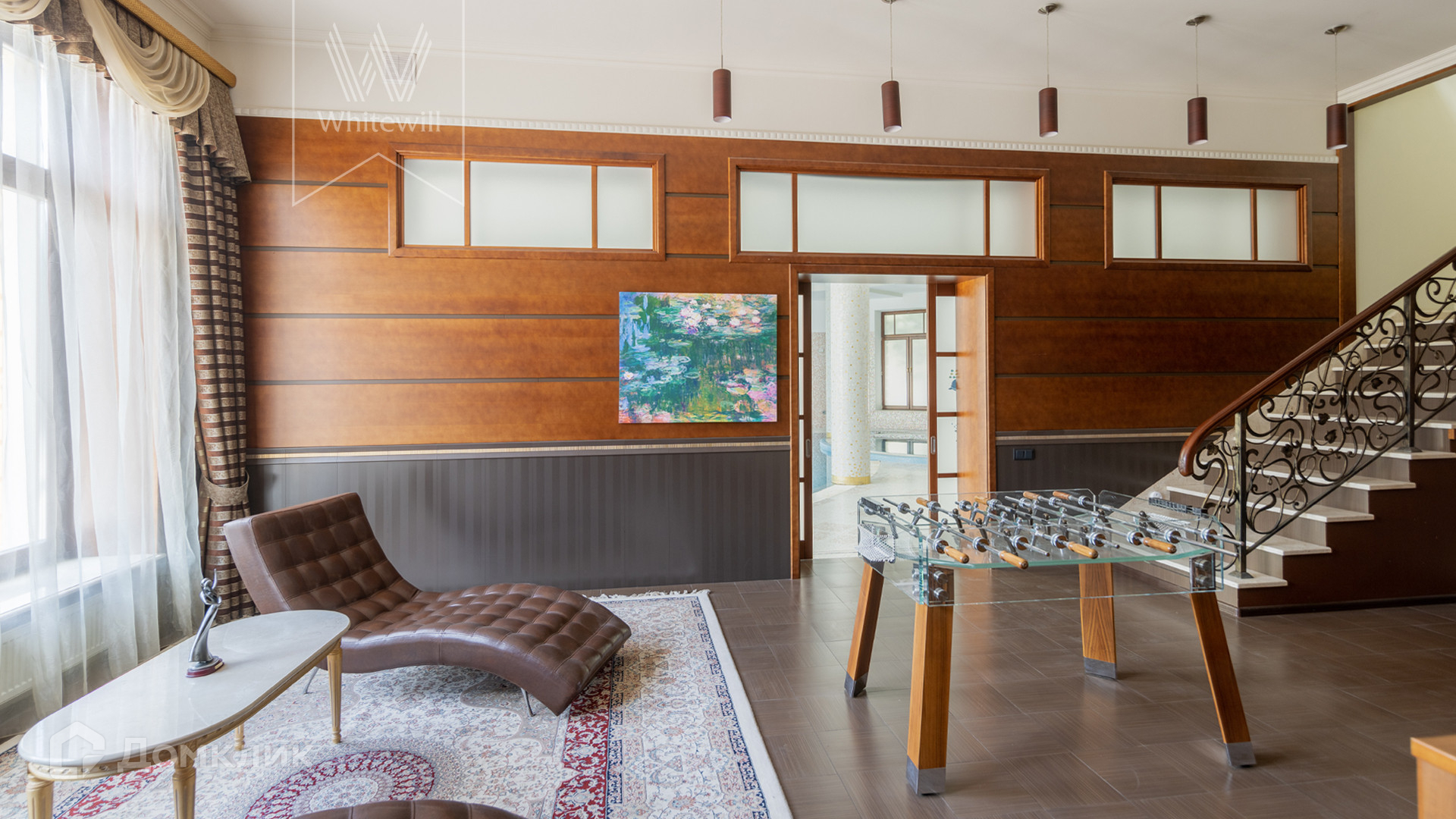 ID 11 773. Семёнково. Загородный особняк в стиле русского модерна площадью 2009 м² построен на просторном участке 0,9 гектара с собственным озером. Фасад дома облицован бежевой штукатуркой, декорирован панно, рустовкой и коваными элементами. В отделке интерьера использованы светлые, теплые оттенки, создающие атмосферу уюта. Планировкой резиденции предусмотрены 3 спальни, 2 гостиные, одна из которых с камином и вторым светом, кухня, 2 столовые, кабинет и SPA-зона с бассейном длиной 16 метров, хаммамом и сауной. На территории построены 4 гаража, гостевой дом, летний домик, беседка и зона барбекю, а также обустроены парк, сад, фонтан и паркинг. На участке с 2-мя въездами выполнены ландшафтный дизайн и дренажные работы, установлена система автополива, вымощены дорожки и оборудовано уличное освещение.
