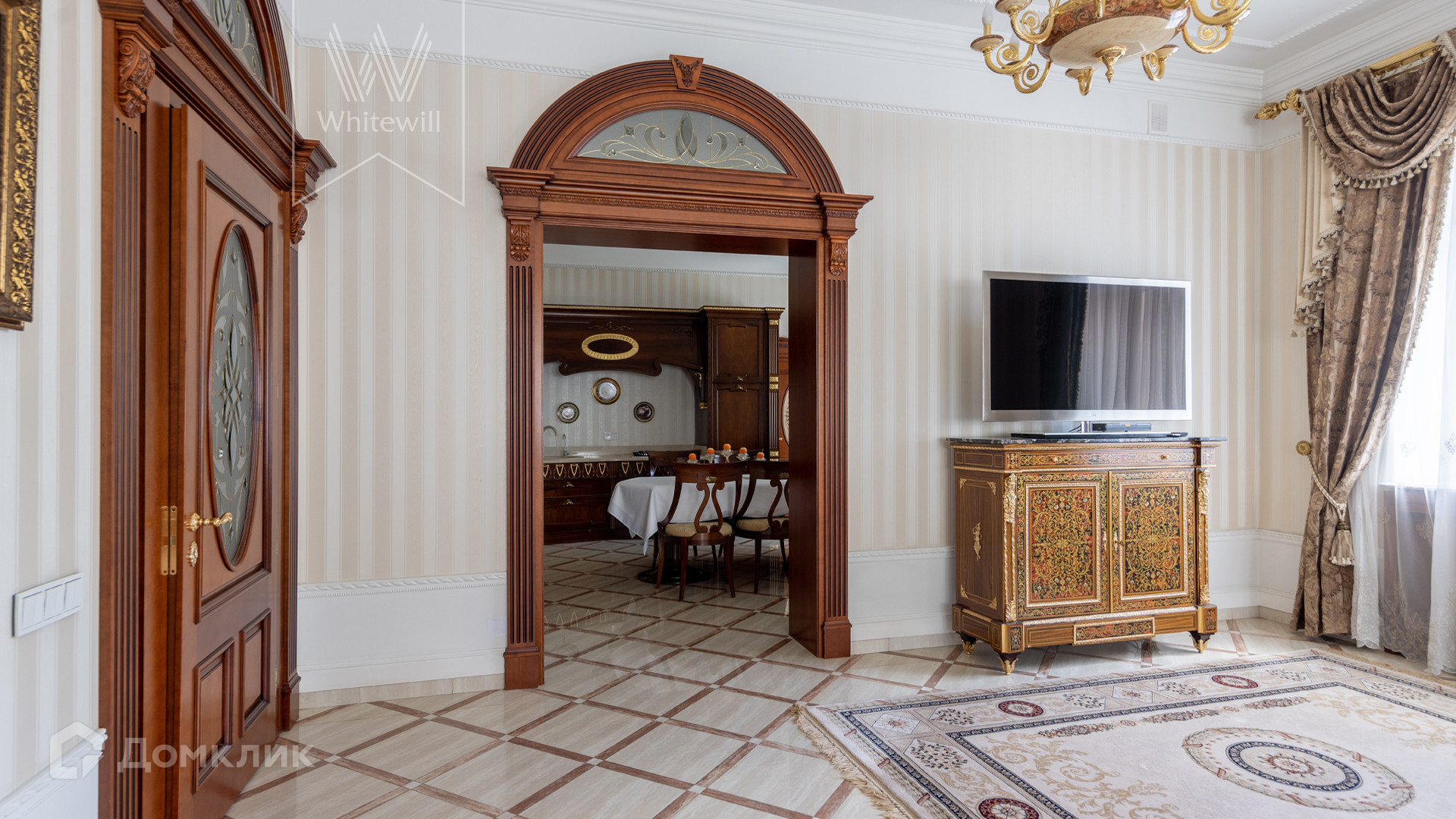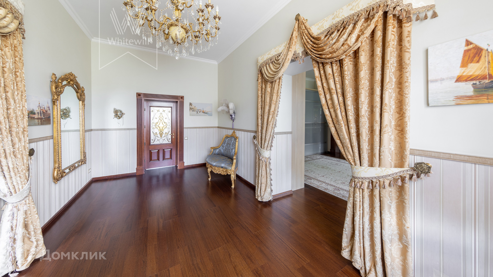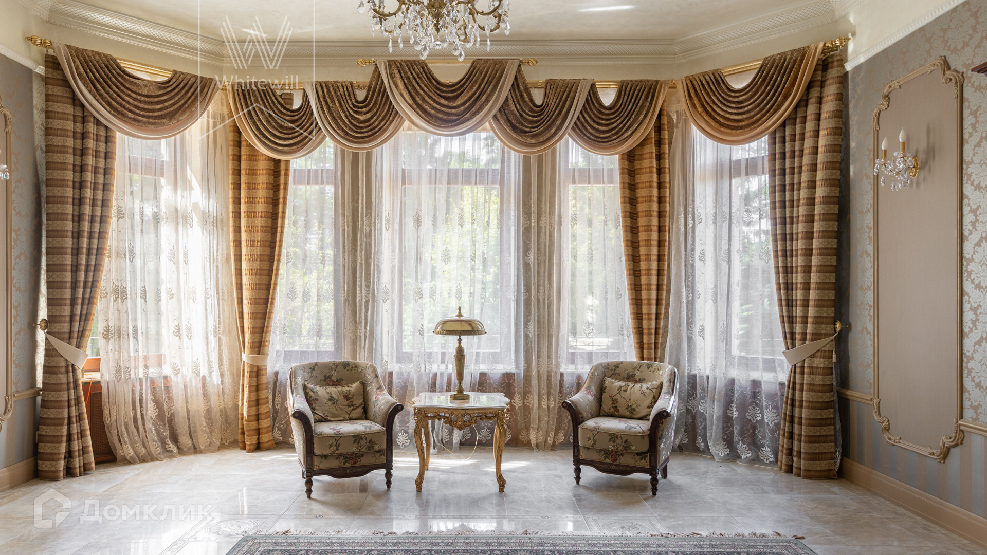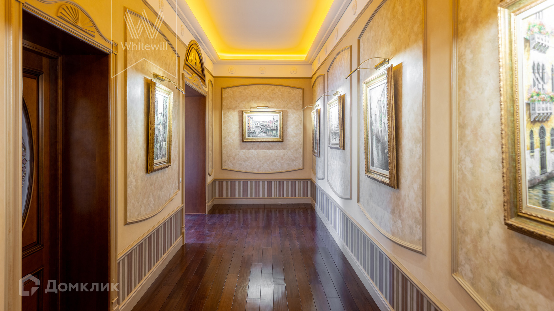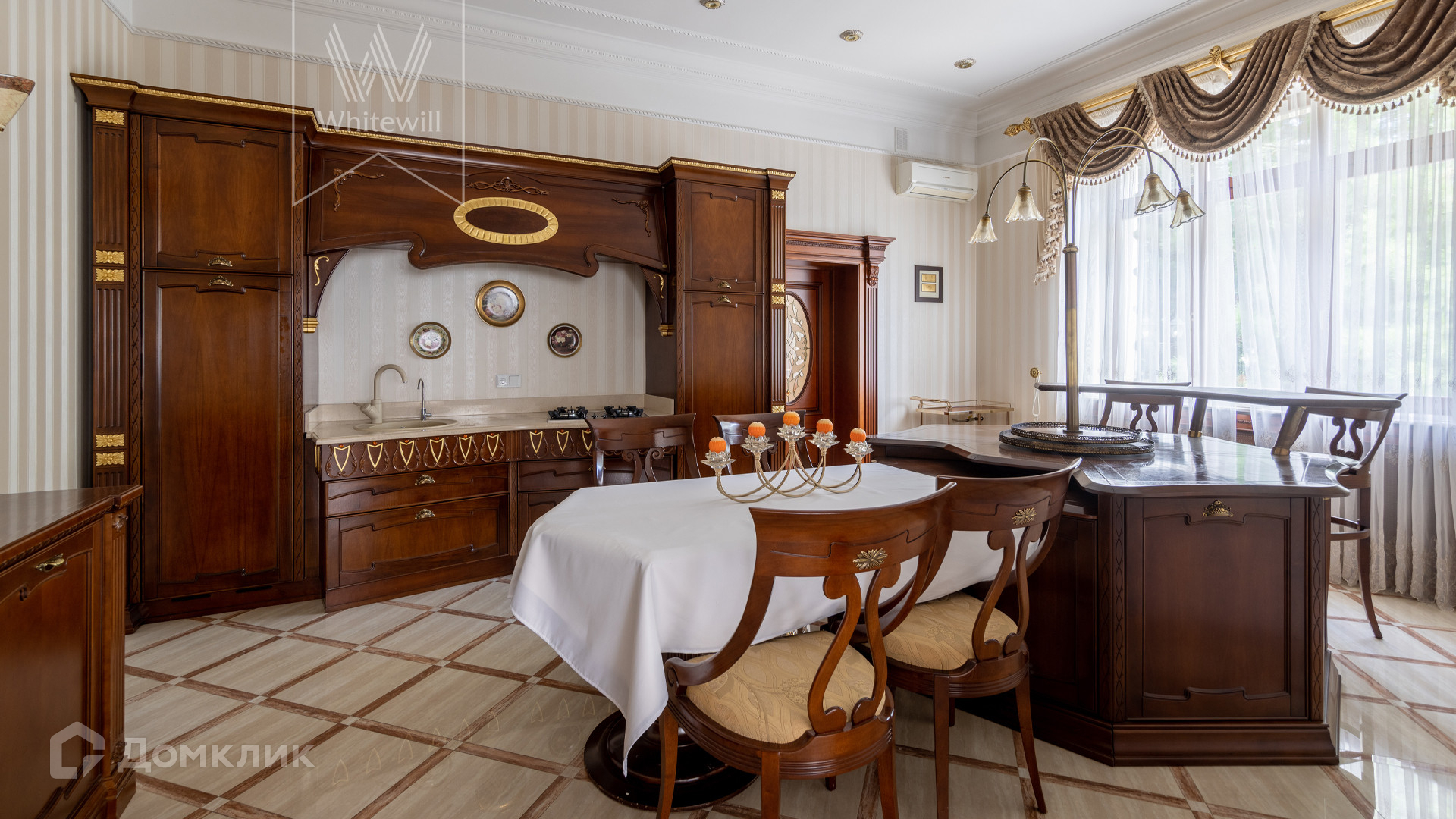 ID 11 773. Семёнково. Загородный особняк в стиле русского модерна площадью 2009 м² построен на просторном участке 0,9 гектара с собственным озером. Фасад дома облицован бежевой штукатуркой, декорирован панно, рустовкой и коваными элементами. В отделке интерьера использованы светлые, теплые оттенки, создающие атмосферу уюта. Планировкой резиденции предусмотрены 3 спальни, 2 гостиные, одна из которых с камином и вторым светом, кухня, 2 столовые, кабинет и SPA-зона с бассейном длиной 16 метров, хаммамом и сауной. На территории построены 4 гаража, гостевой дом, летний домик, беседка и зона барбекю, а также обустроены парк, сад, фонтан и паркинг. На участке с 2-мя въездами выполнены ландшафтный дизайн и дренажные работы, установлена система автополива, вымощены дорожки и оборудовано уличное освещение.