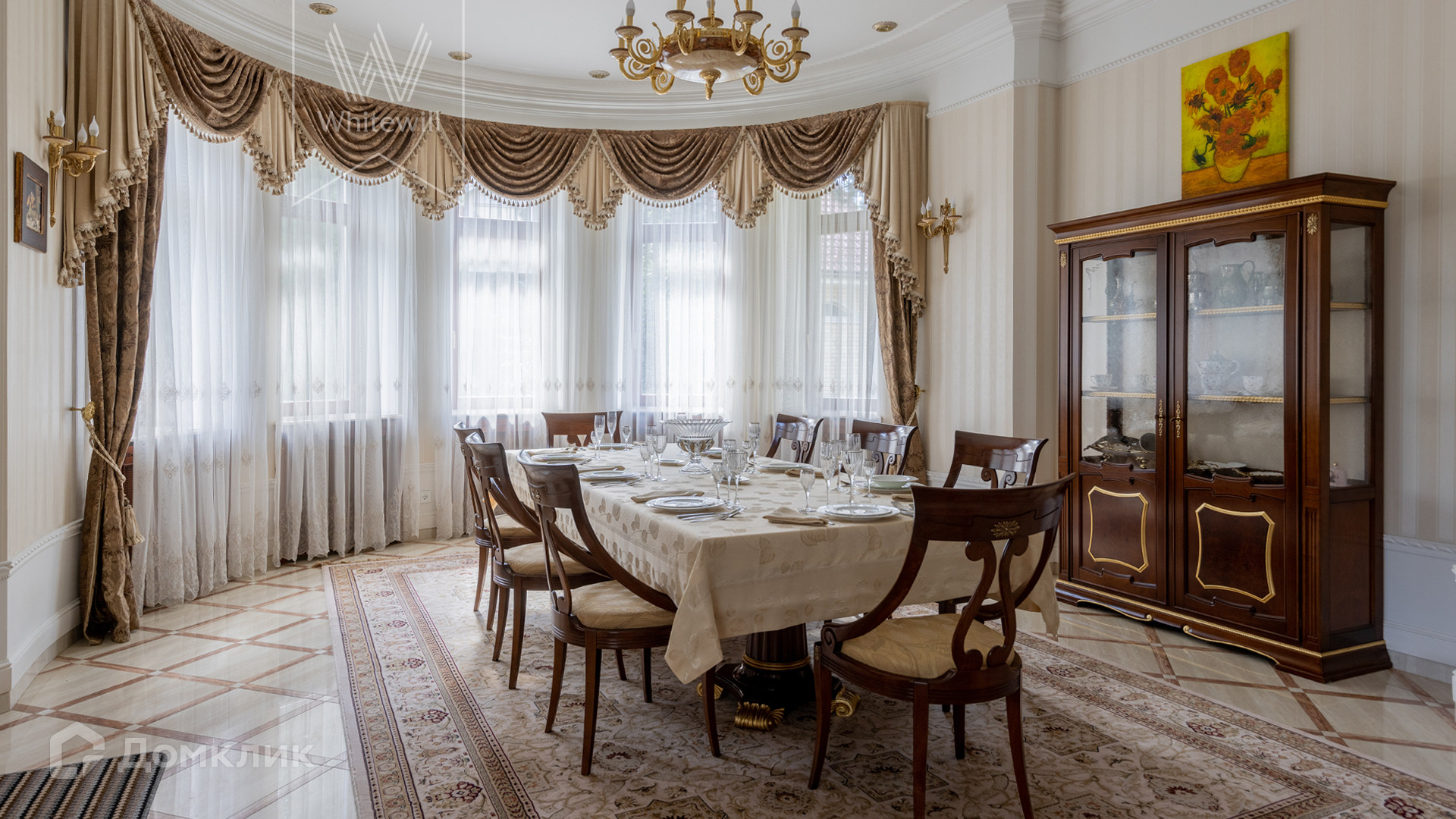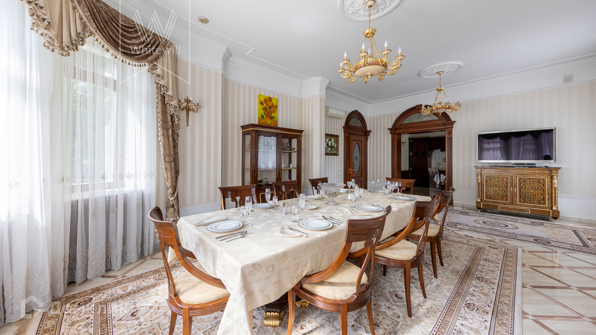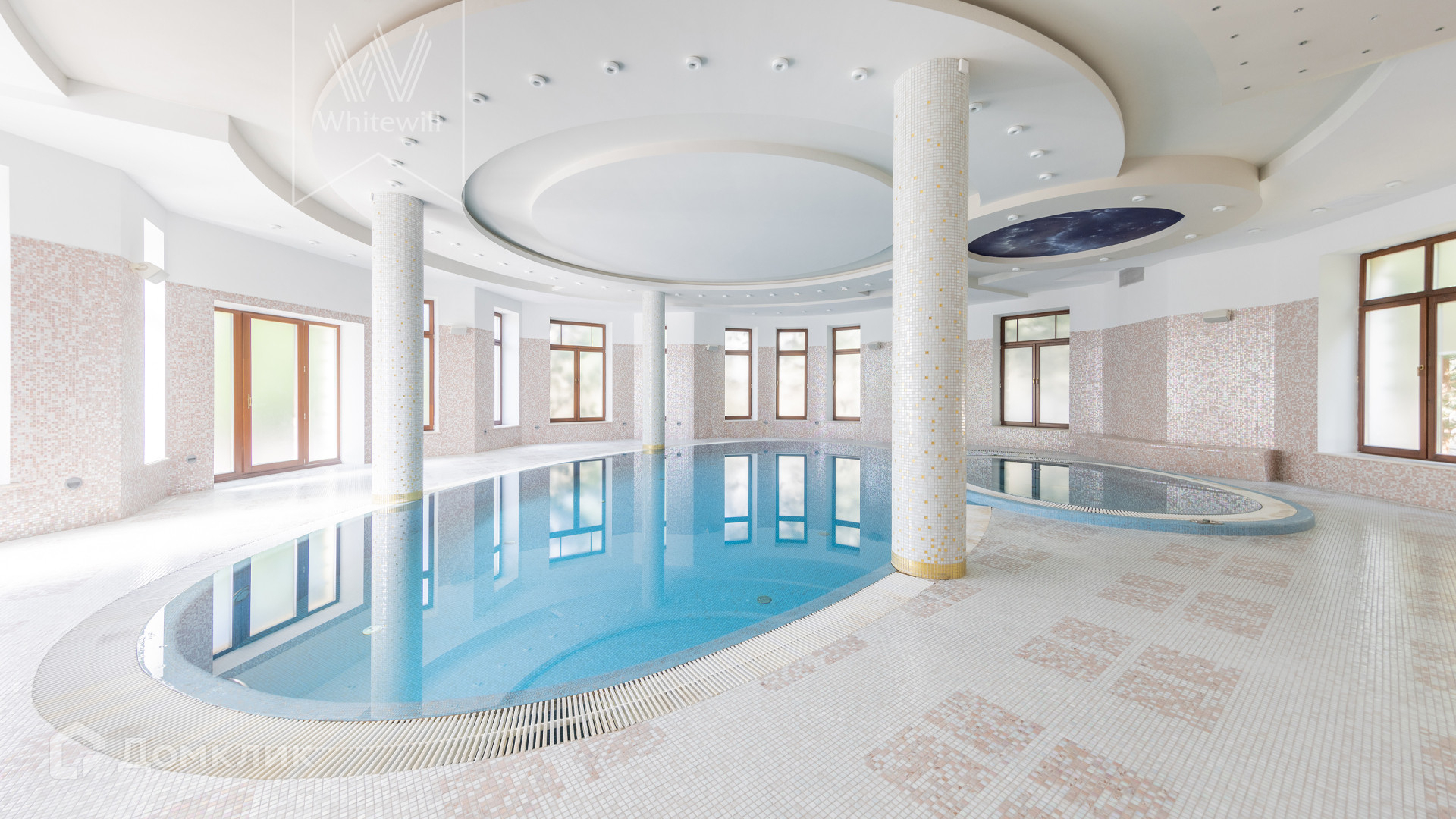 1-й уровень: 2 гостиные, 2 столовые, кухня, 2 гардеробные, SPA-зона с 2-мя бассейнами, хаммамом, сауной, комнатой отдыха и массажной, тренажерный зал, кинотеатр, зал для танцев.