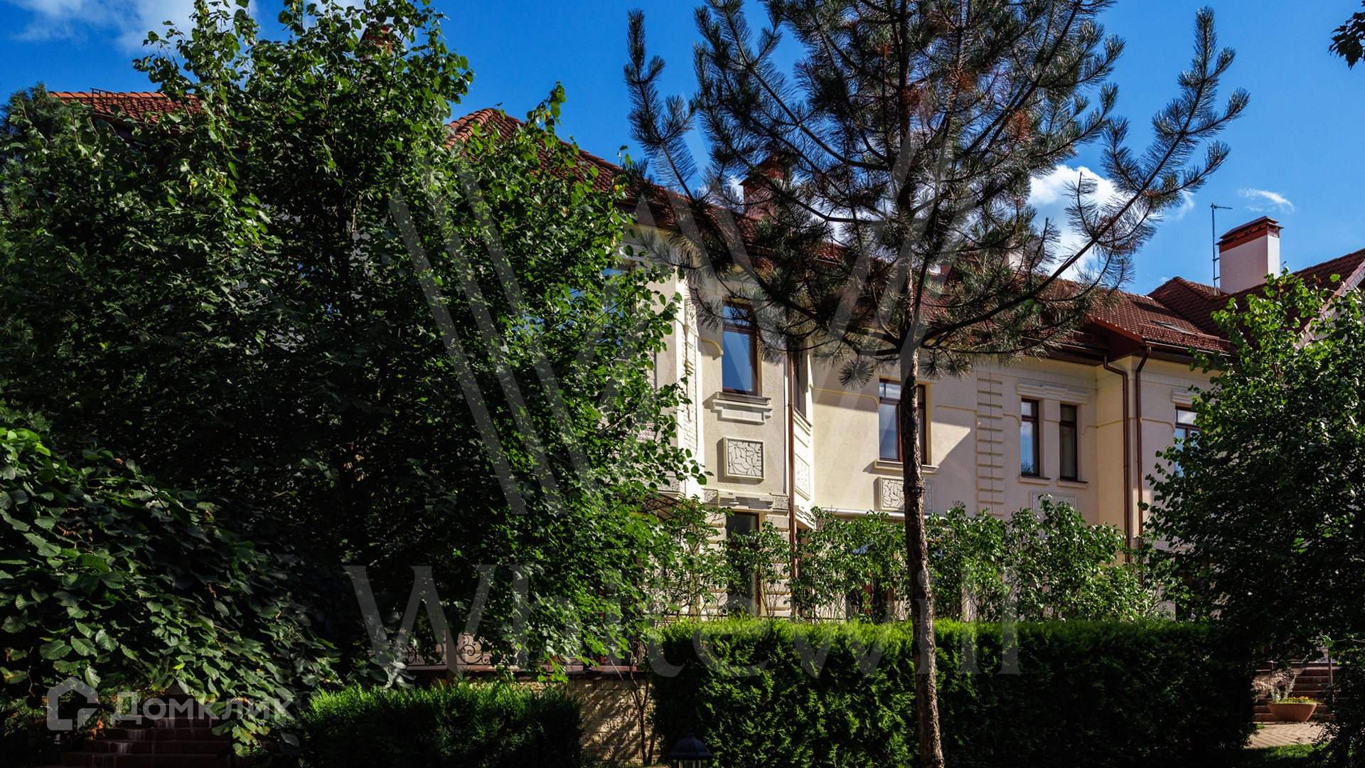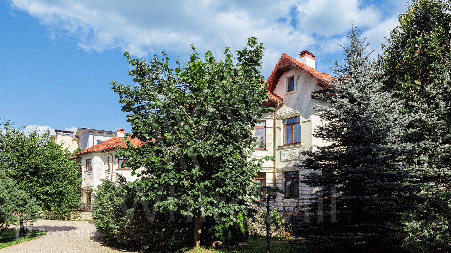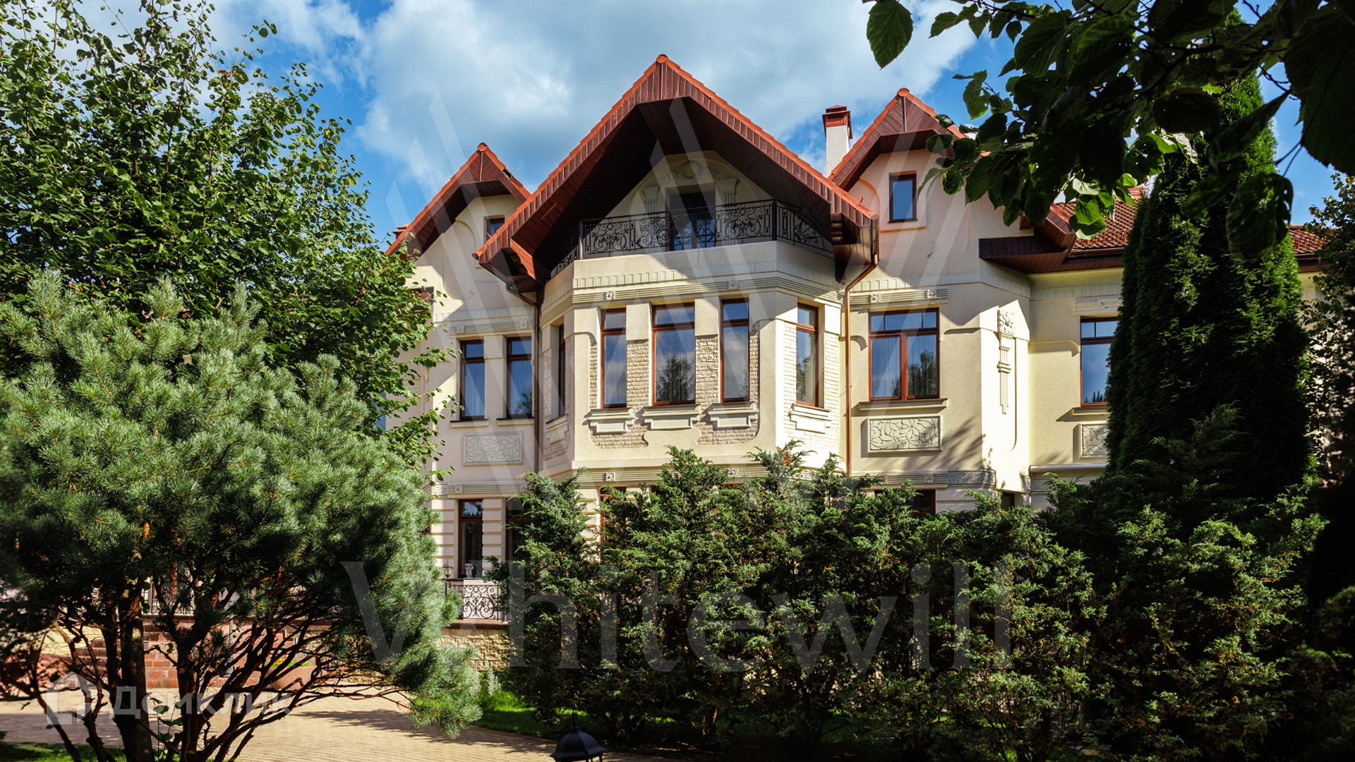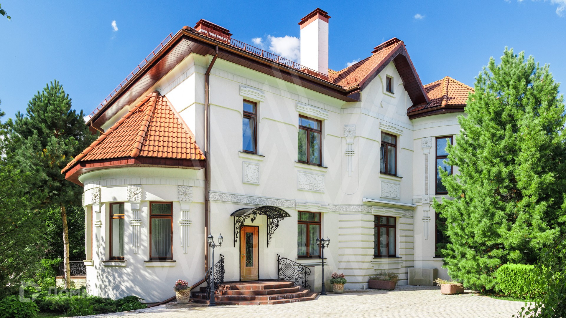 ID 11 773. Семёнково. Загородный особняк в стиле русского модерна площадью 2009 м² построен на просторном участке 0,9 гектара с собственным озером. Фасад дома облицован бежевой штукатуркой, декорирован панно, рустовкой и коваными элементами. В отделке интерьера использованы светлые, теплые оттенки, создающие атмосферу уюта. Планировкой резиденции предусмотрены 3 спальни, 2 гостиные, одна из которых с камином и вторым светом, кухня, 2 столовые, кабинет и SPA-зона с бассейном длиной 16 метров, хаммамом и сауной. На территории построены 4 гаража, гостевой дом, летний домик, беседка и зона барбекю, а также обустроены парк, сад, фонтан и паркинг. На участке с 2-мя въездами выполнены ландшафтный дизайн и дренажные работы, установлена система автополива, вымощены дорожки и оборудовано уличное освещение.