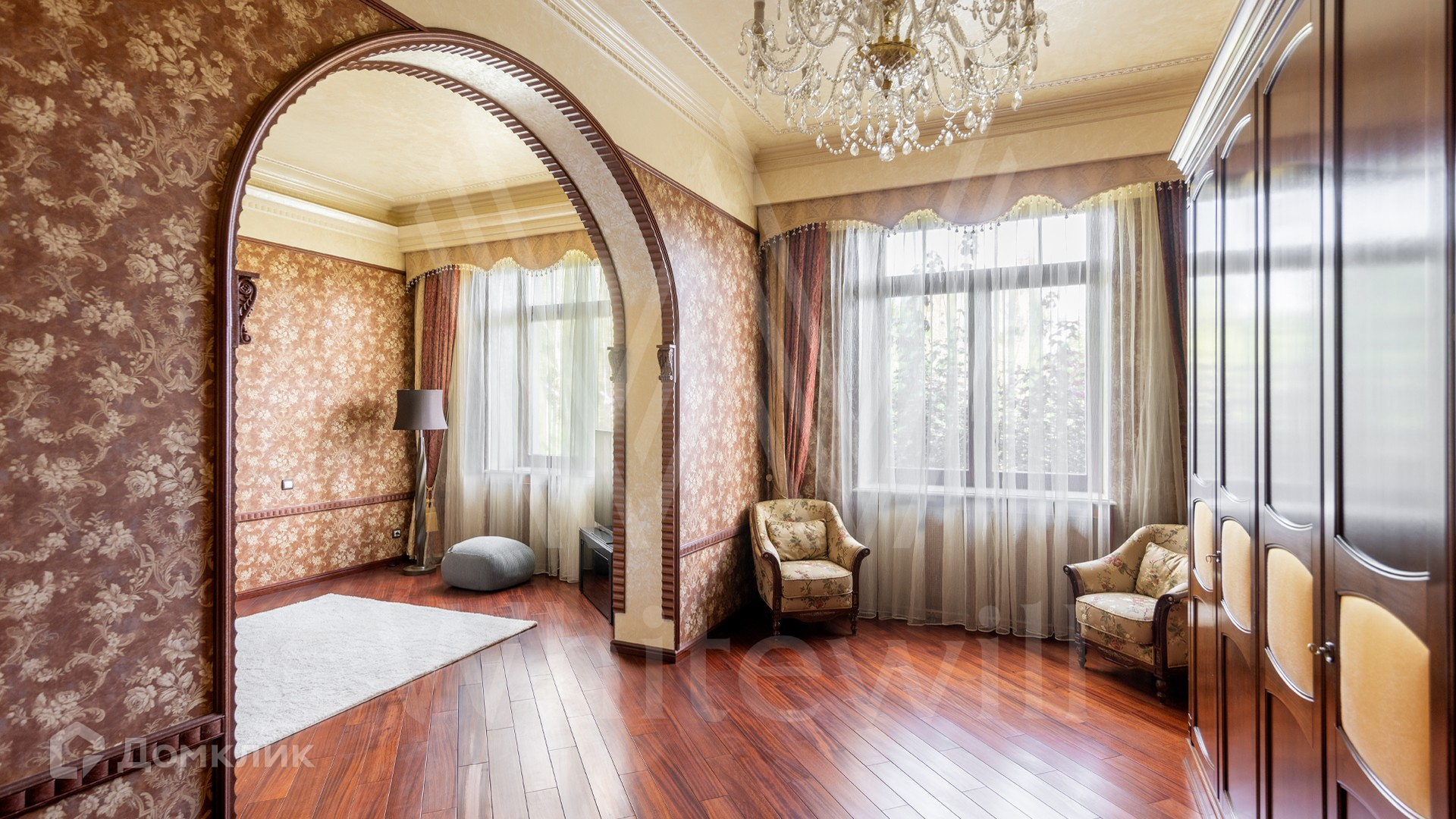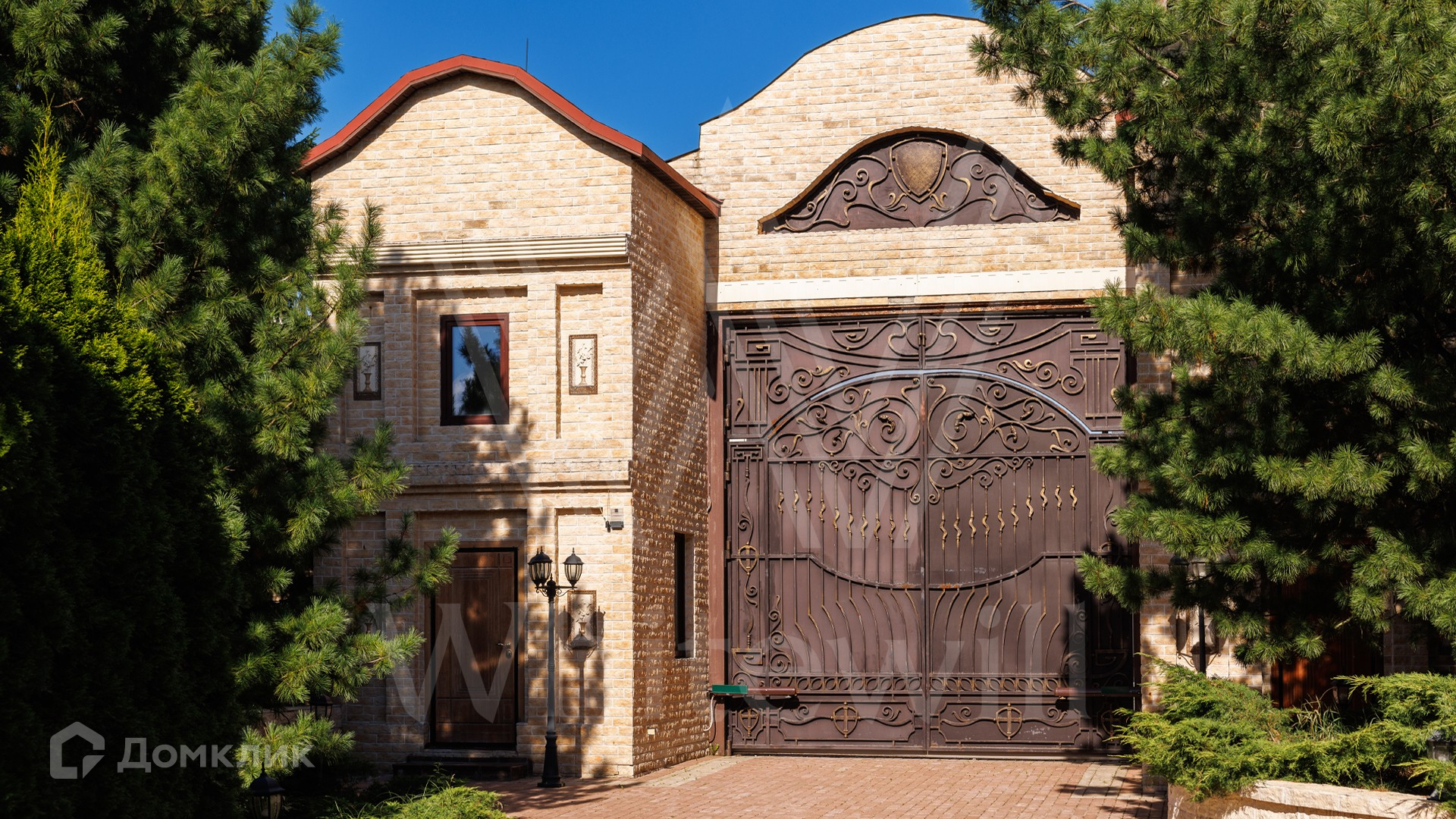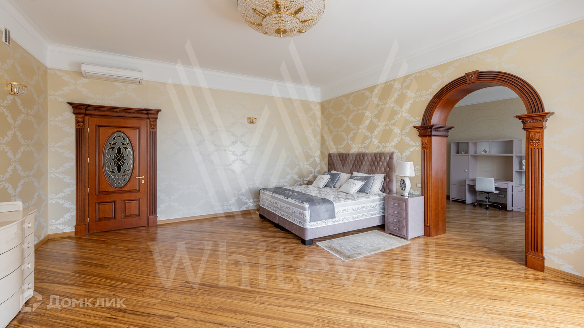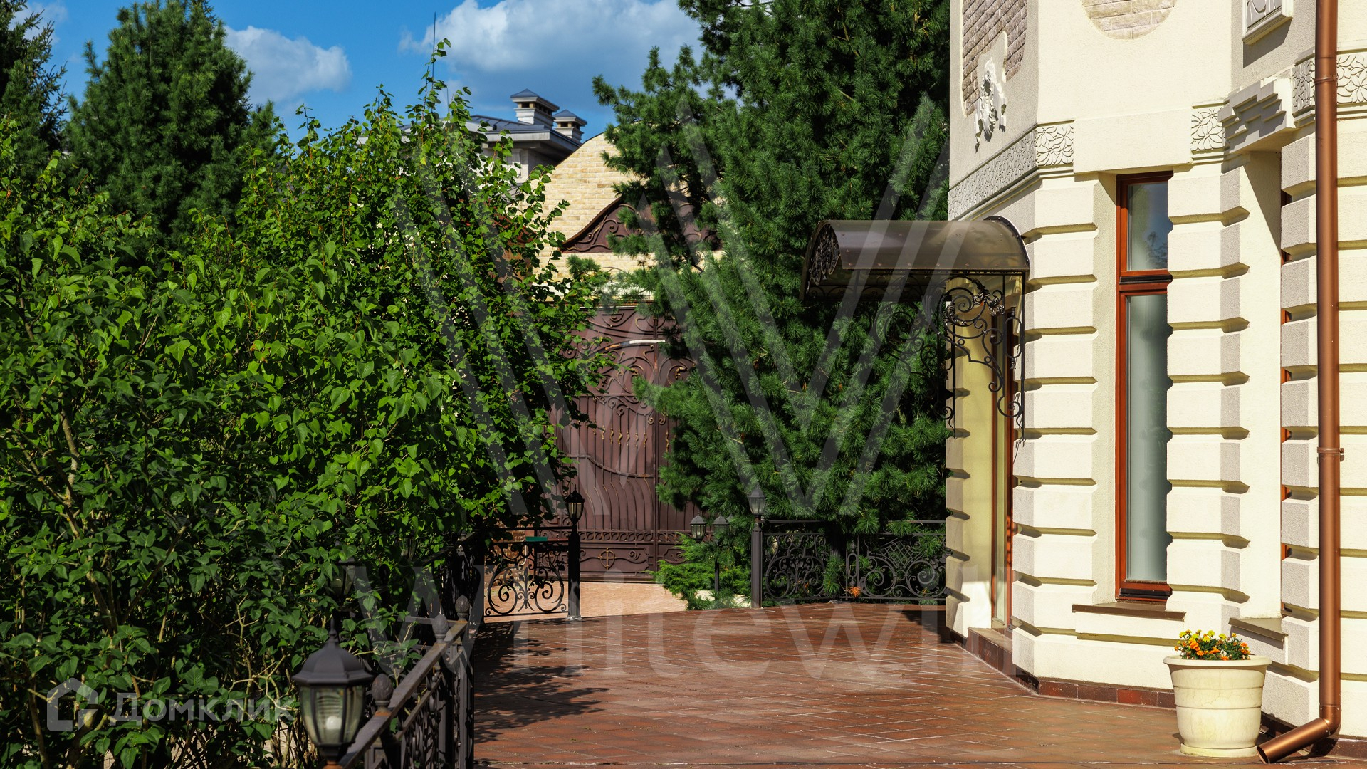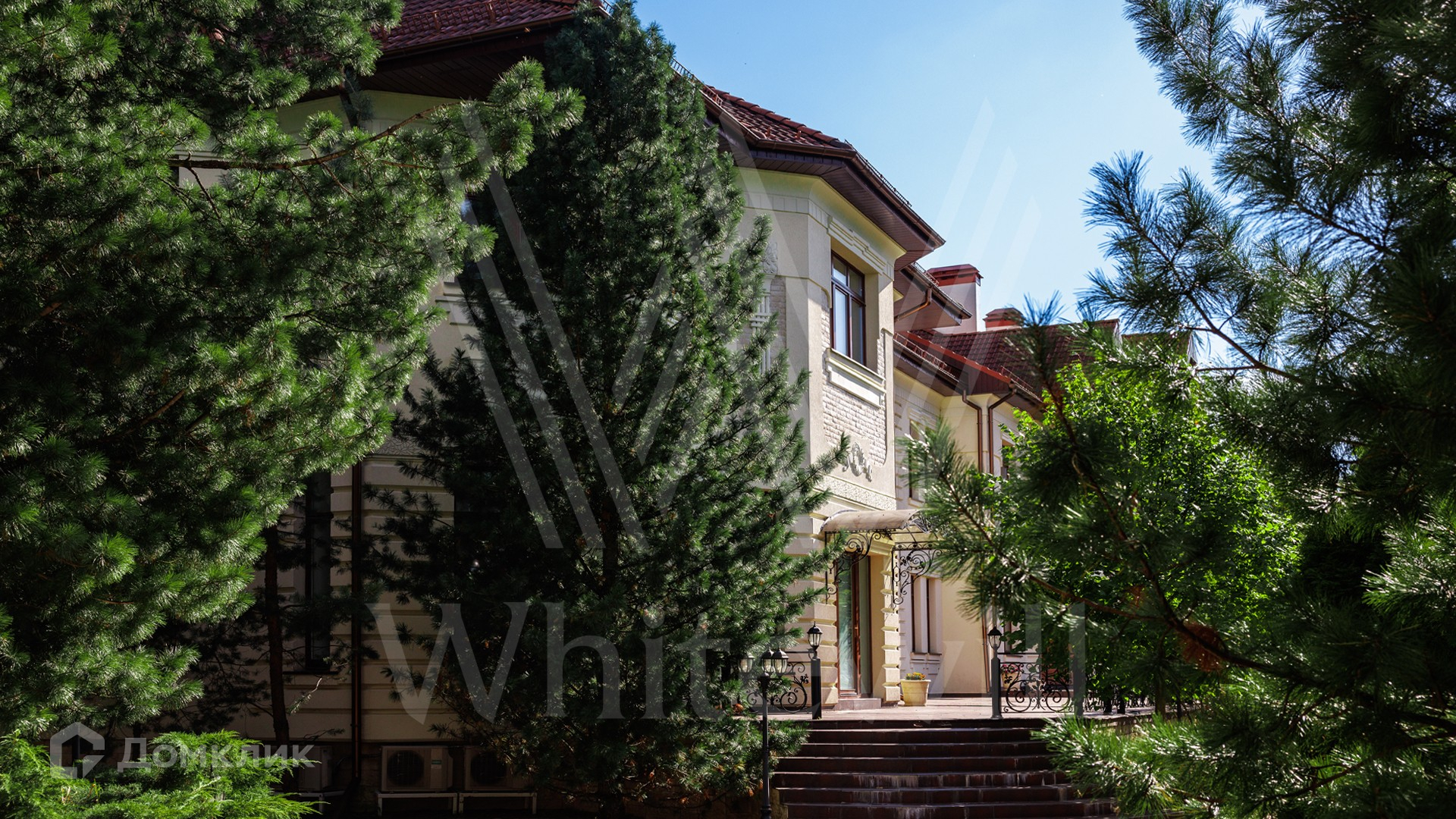 ID 11 773. Семёнково. Загородный особняк в стиле русского модерна площадью 2009 м² построен на просторном участке 0,9 гектара с собственным озером. Фасад дома облицован бежевой штукатуркой, декорирован панно, рустовкой и коваными элементами. В отделке интерьера использованы светлые, теплые оттенки, создающие атмосферу уюта. Планировкой резиденции предусмотрены 3 спальни, 2 гостиные, одна из которых с камином и вторым светом, кухня, 2 столовые, кабинет и SPA-зона с бассейном длиной 16 метров, хаммамом и сауной. На территории построены 4 гаража, гостевой дом, летний домик, беседка и зона барбекю, а также обустроены парк, сад, фонтан и паркинг. На участке с 2-мя въездами выполнены ландшафтный дизайн и дренажные работы, установлена система автополива, вымощены дорожки и оборудовано уличное освещение.